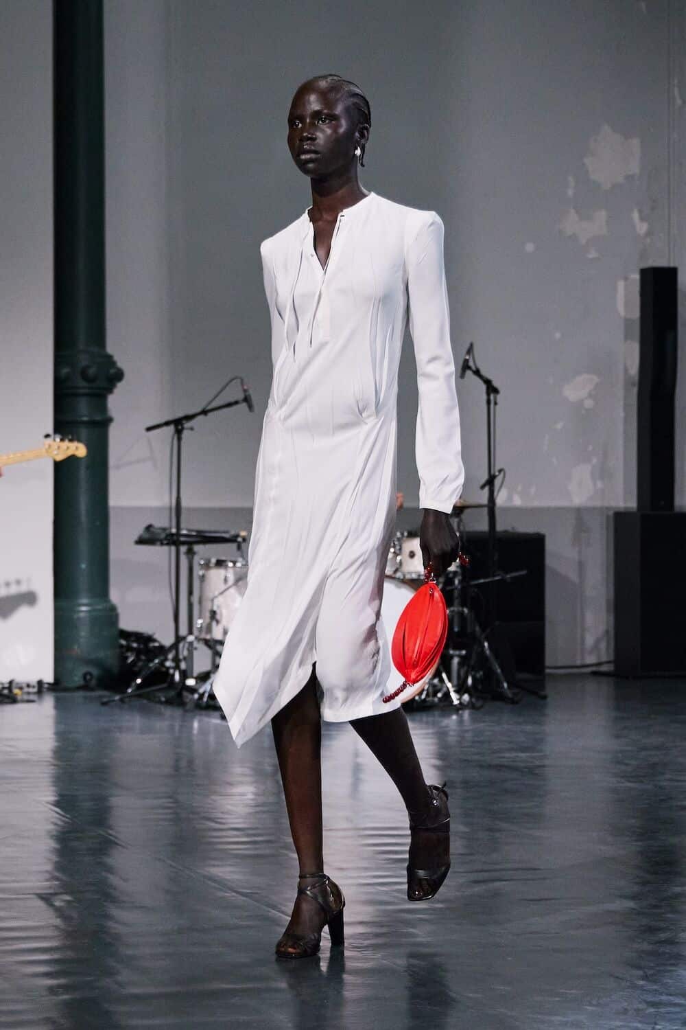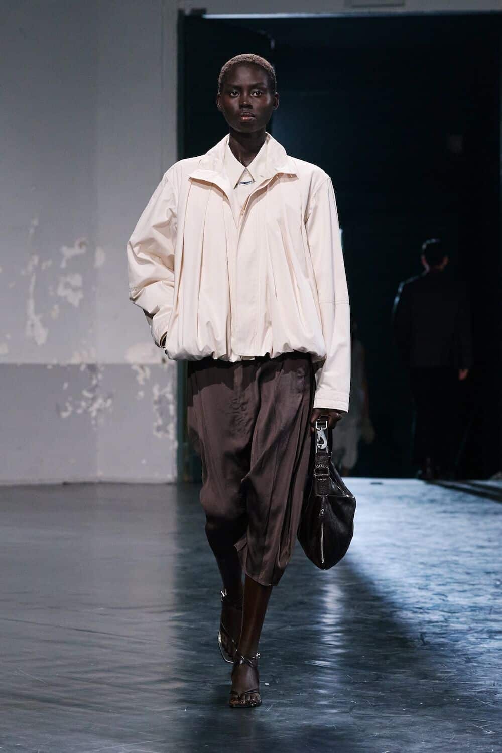 Immediacy was also an important theme this season, with floating lightweight dresses made of crepe fabrics in muted tones and airy slacks chucking up visions of Parisians on the go. The pieces were straightforward, but by no means boring. Blunt lines and understated but gritty embellishments like small silver studs and buttons felt like a push for the wearer to lead with attitude. Next summer, Lemaire and Tran want people to be storming the streets with the kind of confidence only a good outfit can bring.