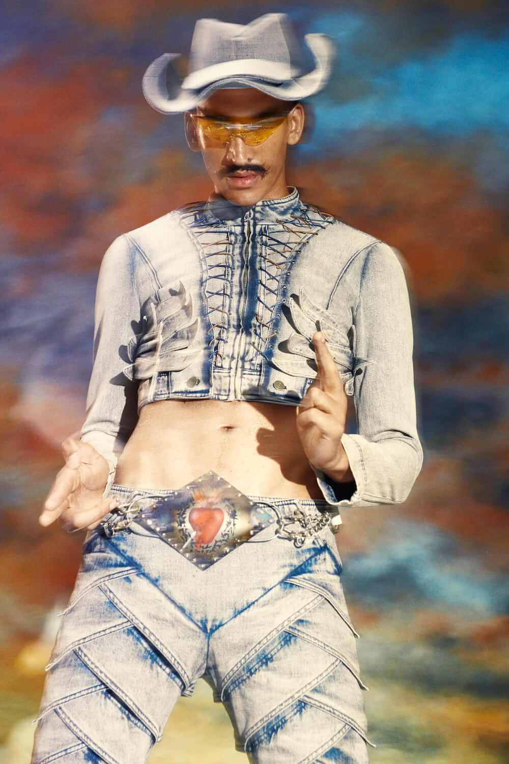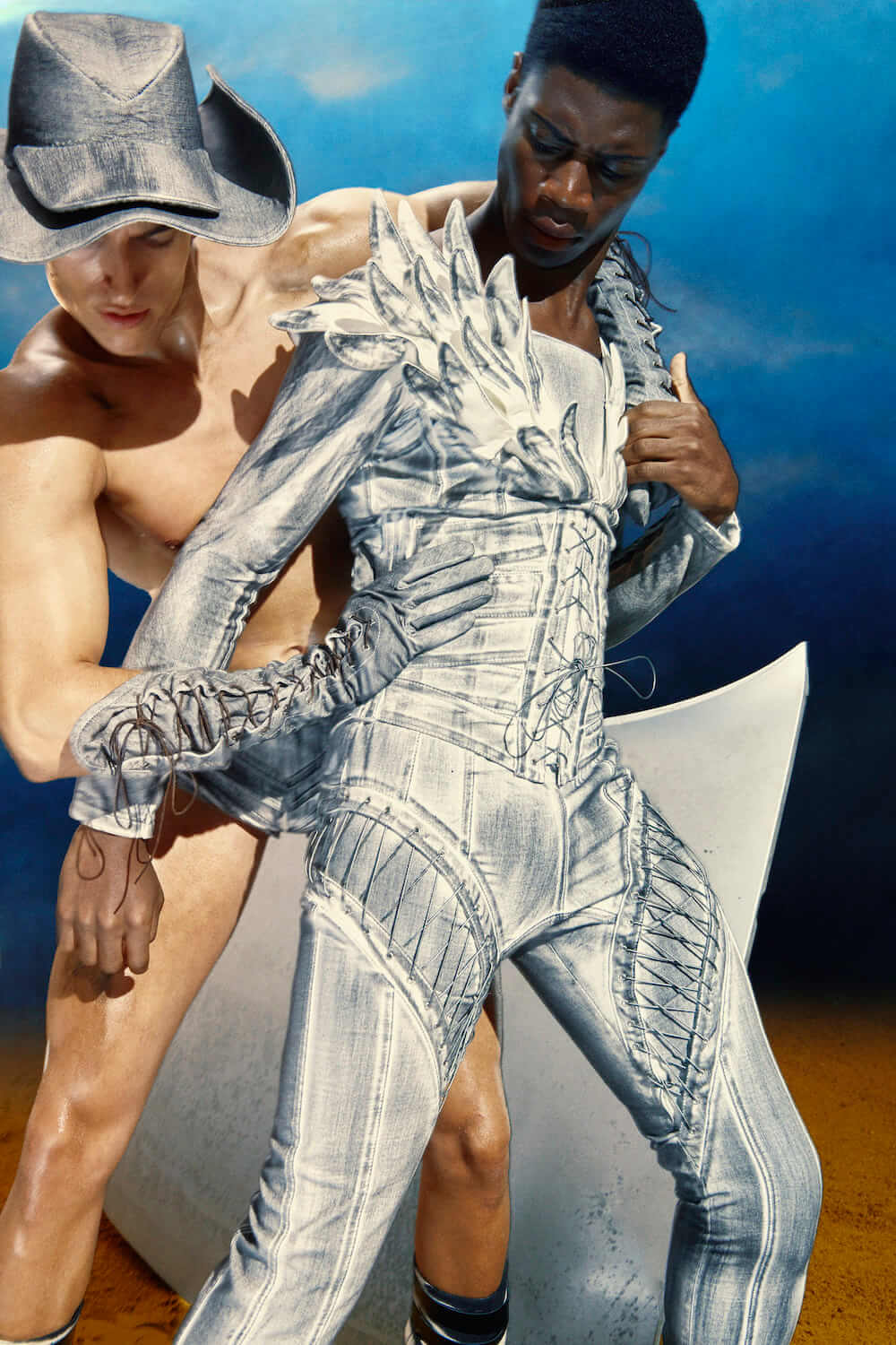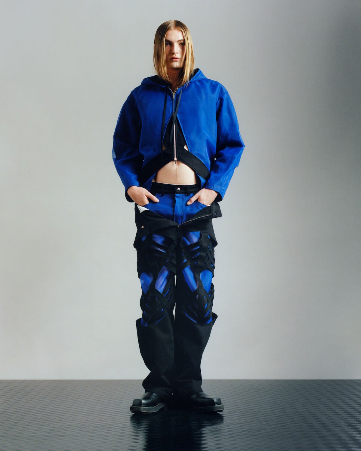 Goom Heo’s SS23 edit, Dystopian Beach, disrupts the tranquillity of seaside bliss with supercharged sexuality and slick misfit models superimposed by disjointed car parts. Inspired by the styles found within Swiss photographer Karlheinz Weinberger’s subversive works through the 1950s and ’60s, Heo amalgamates an apocalyptic fashion fever dream for summer. Like Roman gladiators in a colosseum pit, Heo’s boys don traditional armour detailing. Elsewhere, they posed with cigarettes hanging out of their mouths, their jeans pulled up high and with vacant expressions on their faces. By sporting cowboy hats and subversive denim goodies – made using acid stone washing techniques, hand-painting, fraying, crisscrossing and cropping – they become new-age teen rebels.