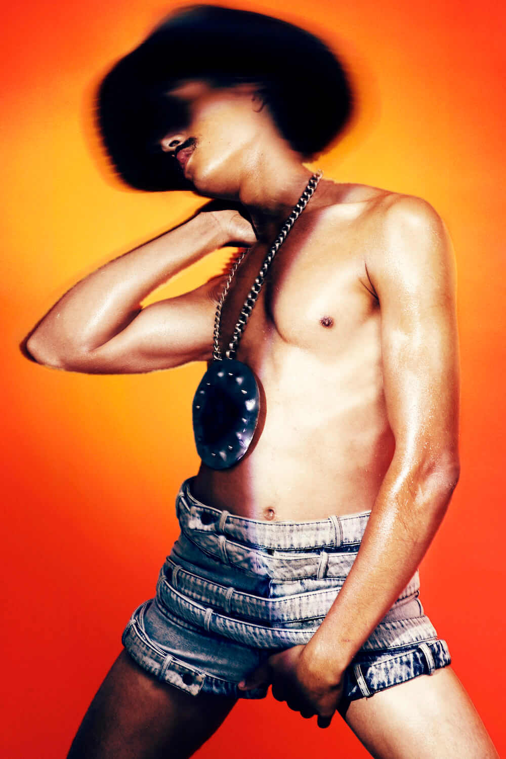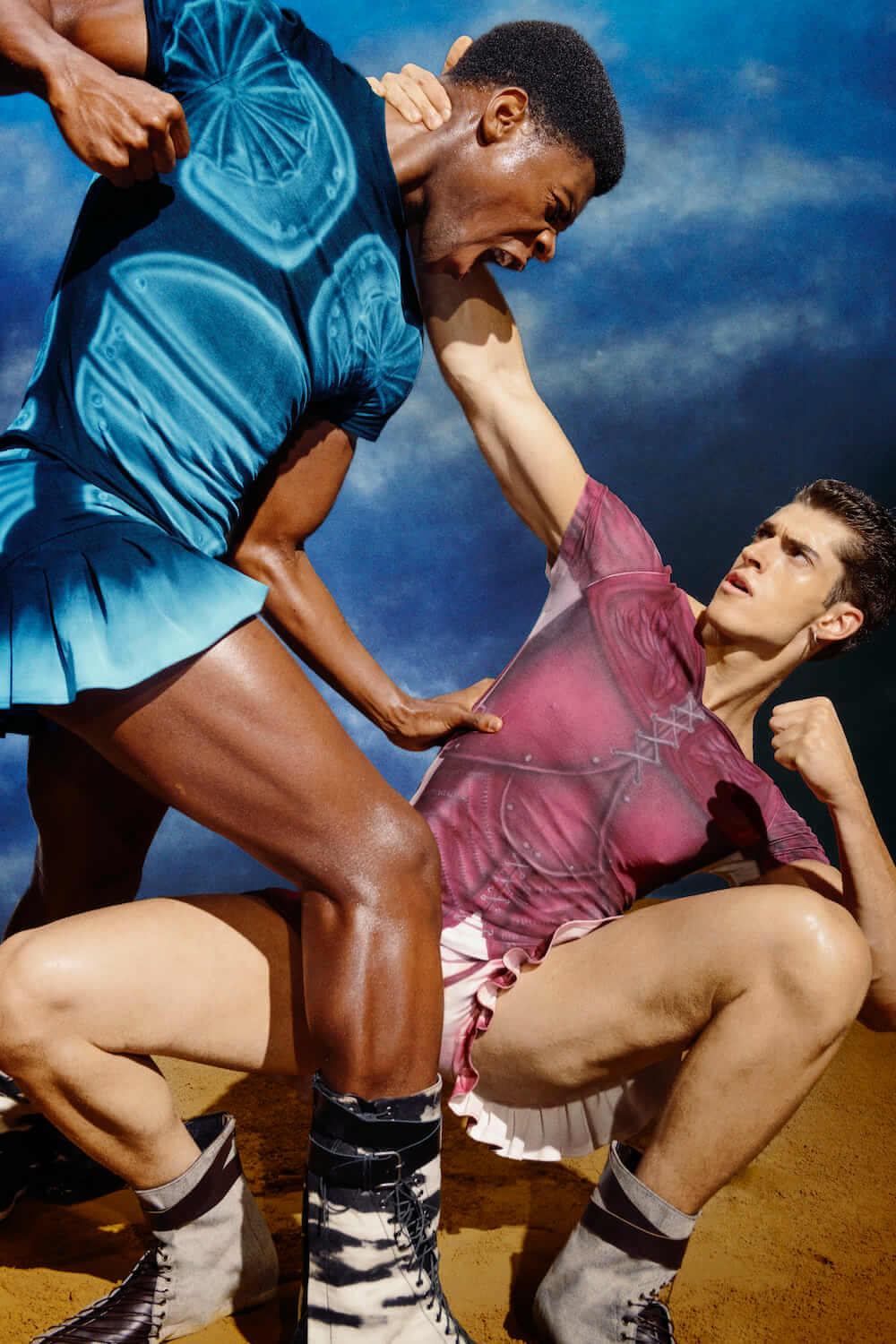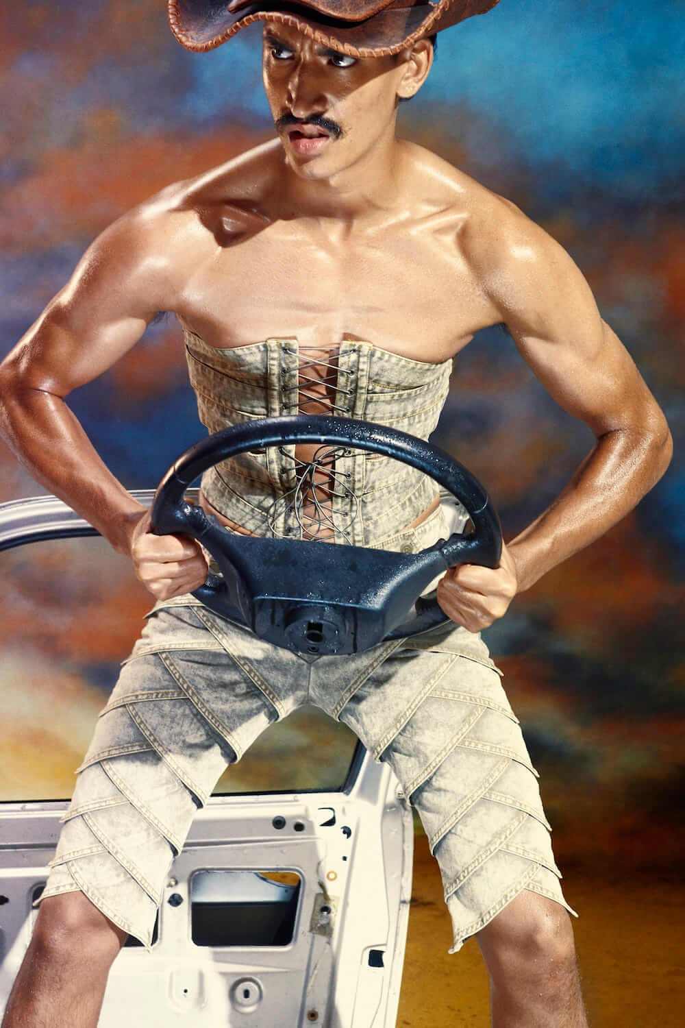 Goom Heo’s SS23 edit, Dystopian Beach, disrupts the tranquillity of seaside bliss with supercharged sexuality and slick misfit models superimposed by disjointed car parts. Inspired by the styles found within Swiss photographer Karlheinz Weinberger’s subversive works through the 1950s and ’60s, Heo amalgamates an apocalyptic fashion fever dream for summer. Like Roman gladiators in a colosseum pit, Heo’s boys don traditional armour detailing. Elsewhere, they posed with cigarettes hanging out of their mouths, their jeans pulled up high and with vacant expressions on their faces. By sporting cowboy hats and subversive denim goodies – made using acid stone washing techniques, hand-painting, fraying, crisscrossing and cropping – they become new-age teen rebels.