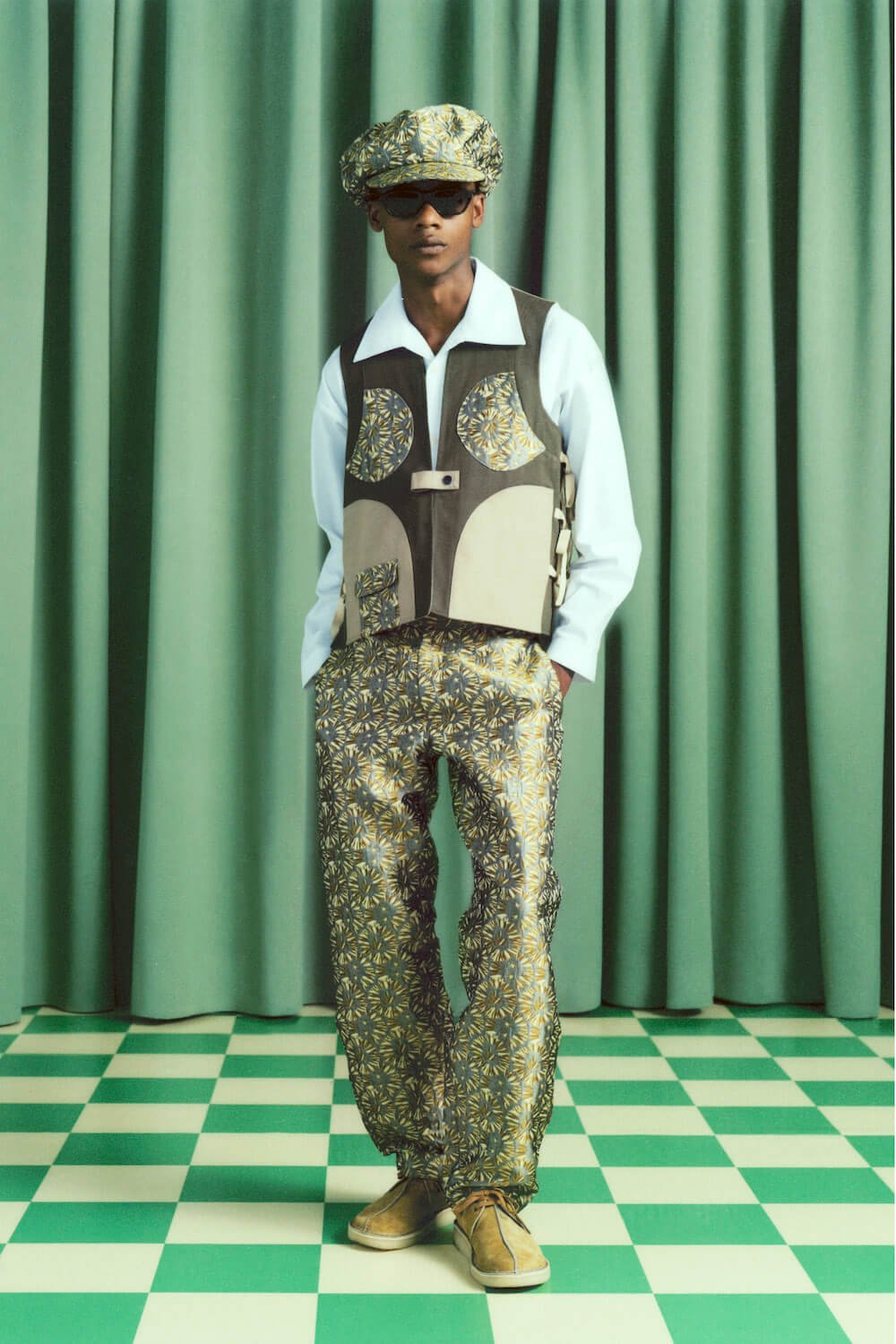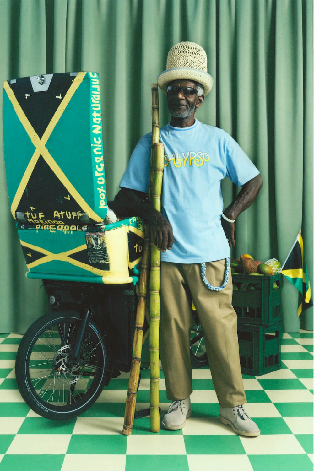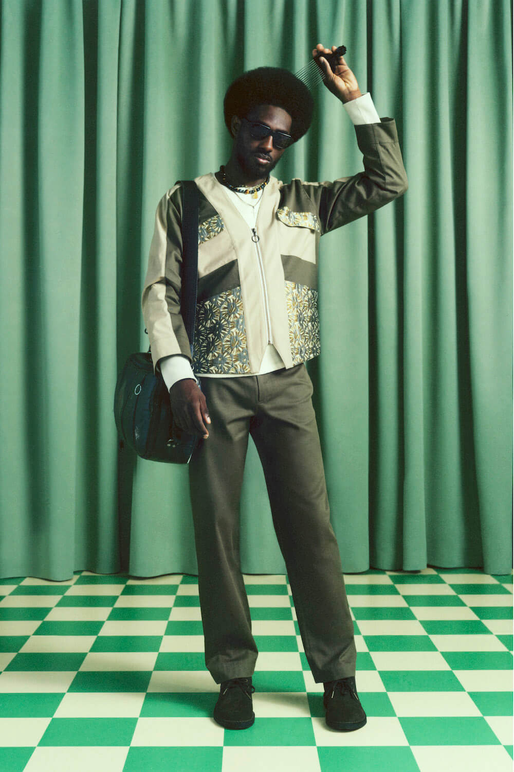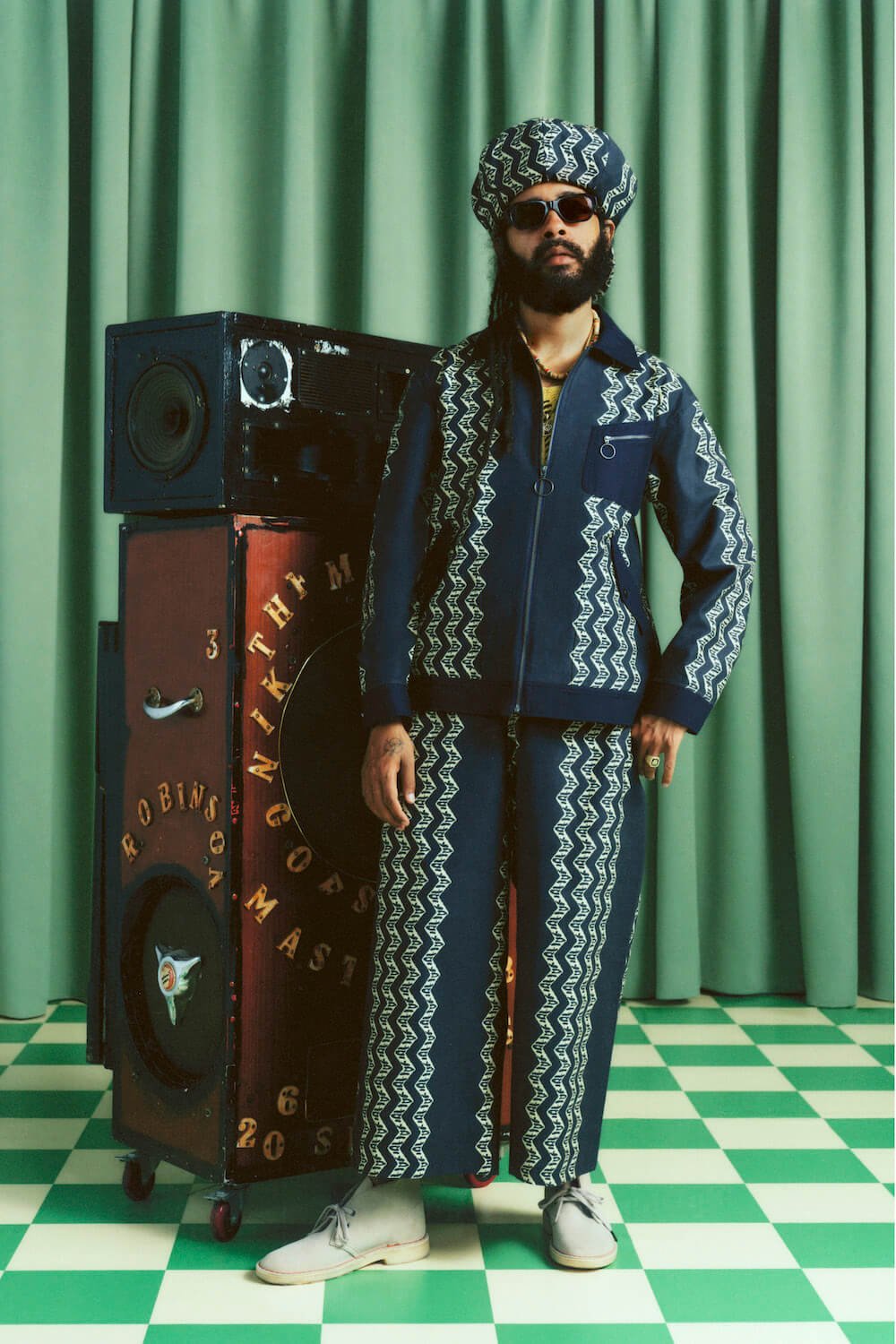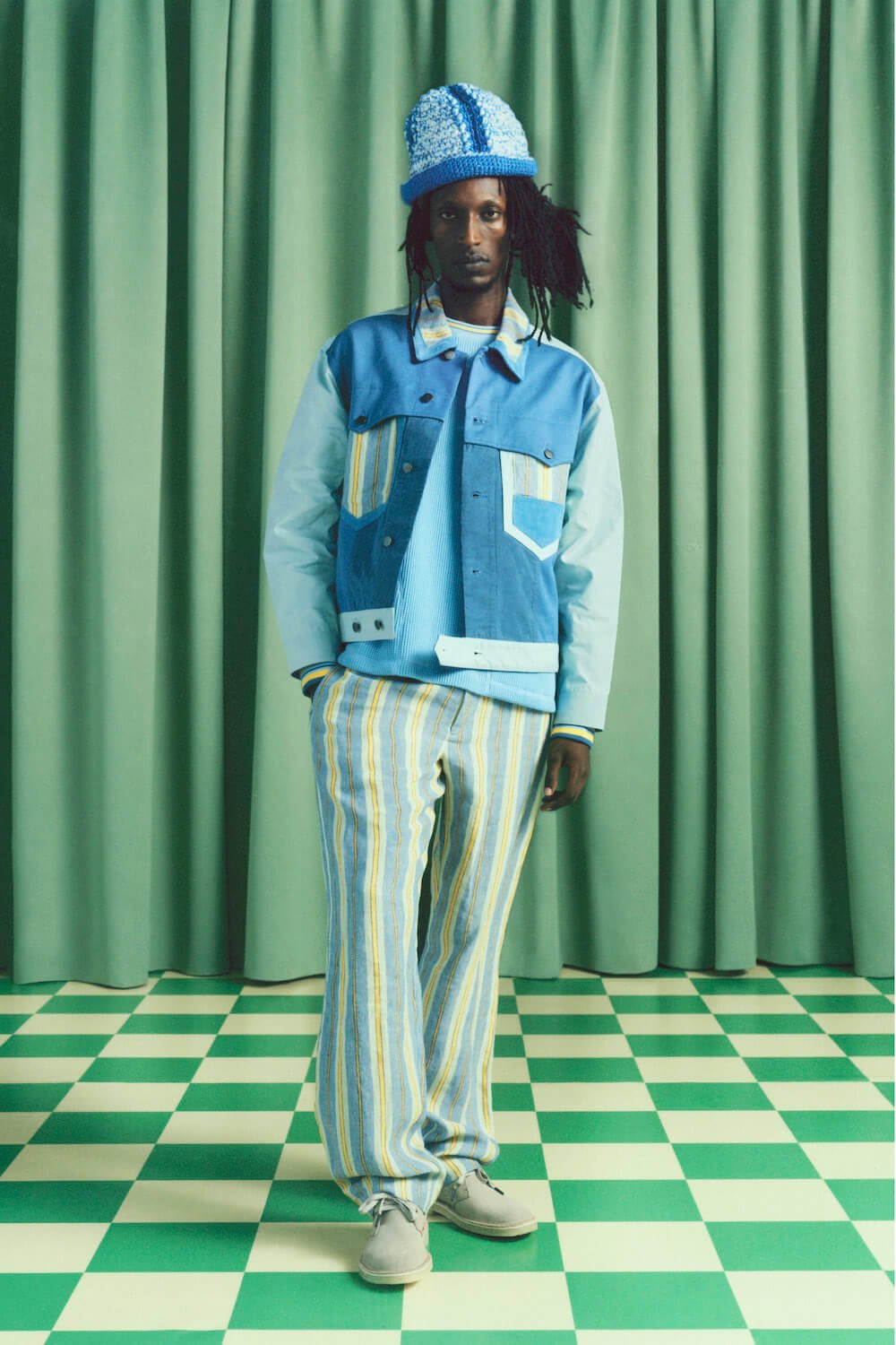 Opting to show off schedule, Nicholas Daley’s SS23 collection explores the rich visual identity of Calypso – an Afro-Caribbean genre that originated in Trinidad and Tobago – through his personal lineage. His journey begins with his grandmother’s treasured silver picture-frame, that she has had since the 1960s, containing a grayscale headshot of actor, singer and civil rights activist Harry Belafonte in a wide-lapel suit. The inscription reads: “To Dorothy, it was good seeing you, next time, let’s spend more time, love, Harry” – a message passed between cousins. Belafonte’s bespoke suiting informs the silhouettes. Trousers are high-waisted and wide-legged, shirts are open-collared, lapels are large, and prints nod to tropical, floral and aloha designs. Set against a simple studio backdrop, a sizable cast of characters spanning generations and occupations, from barber to chef, yogi to musician, are posed with the tools of their trade – it’s an abundant celebration of craft, DIY culture and Black folk music.