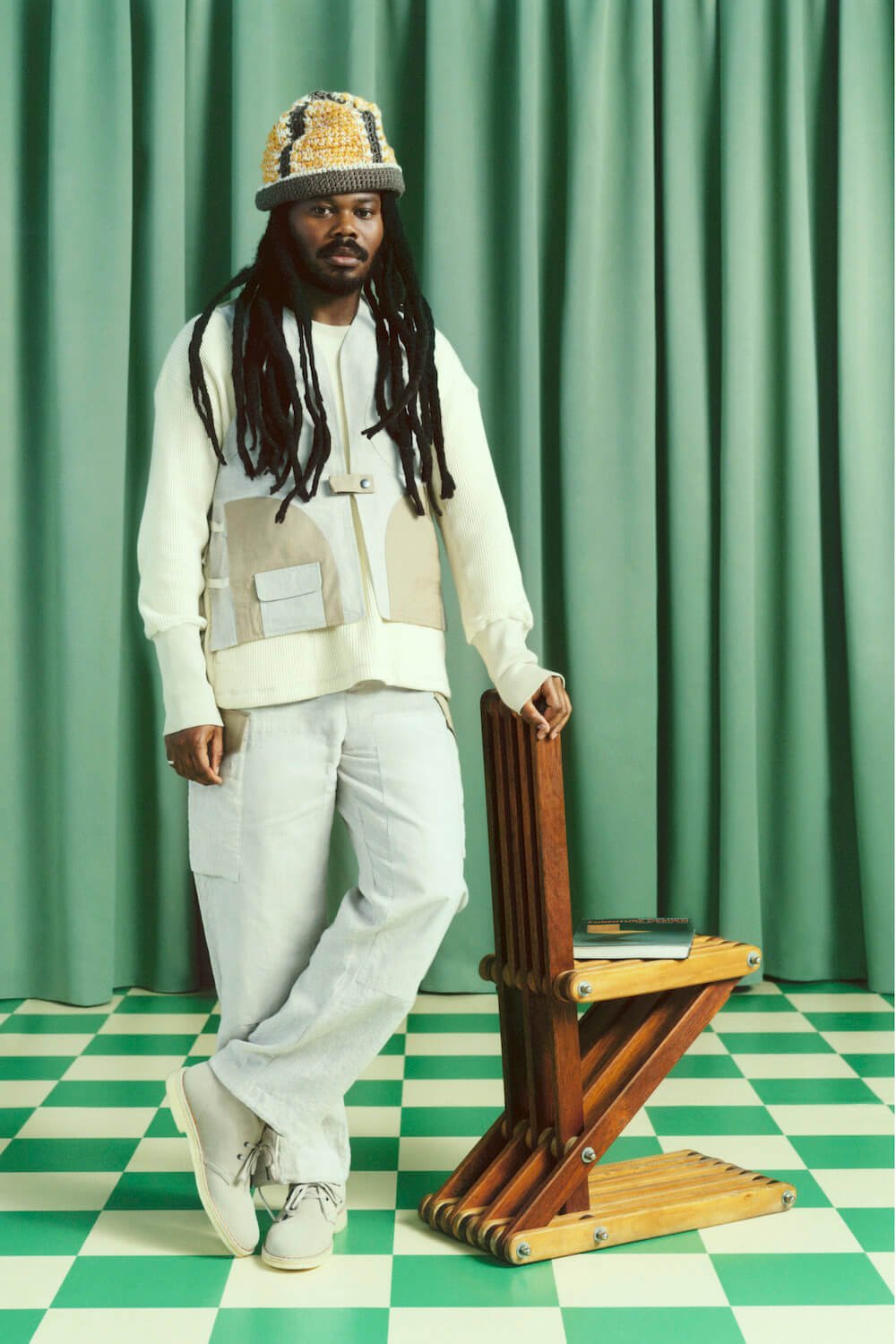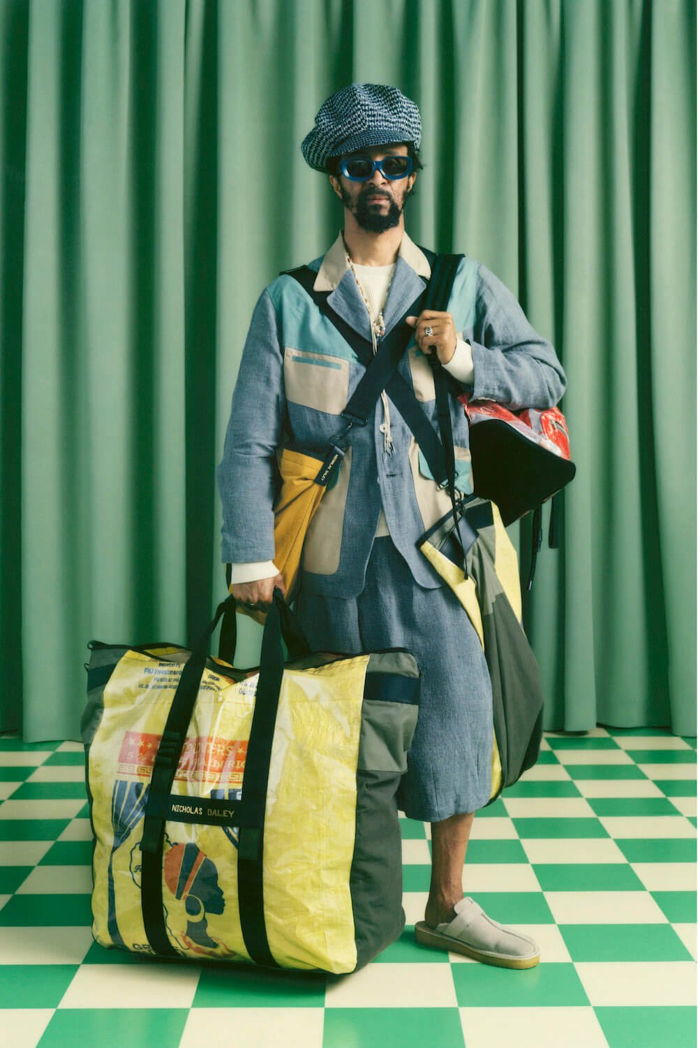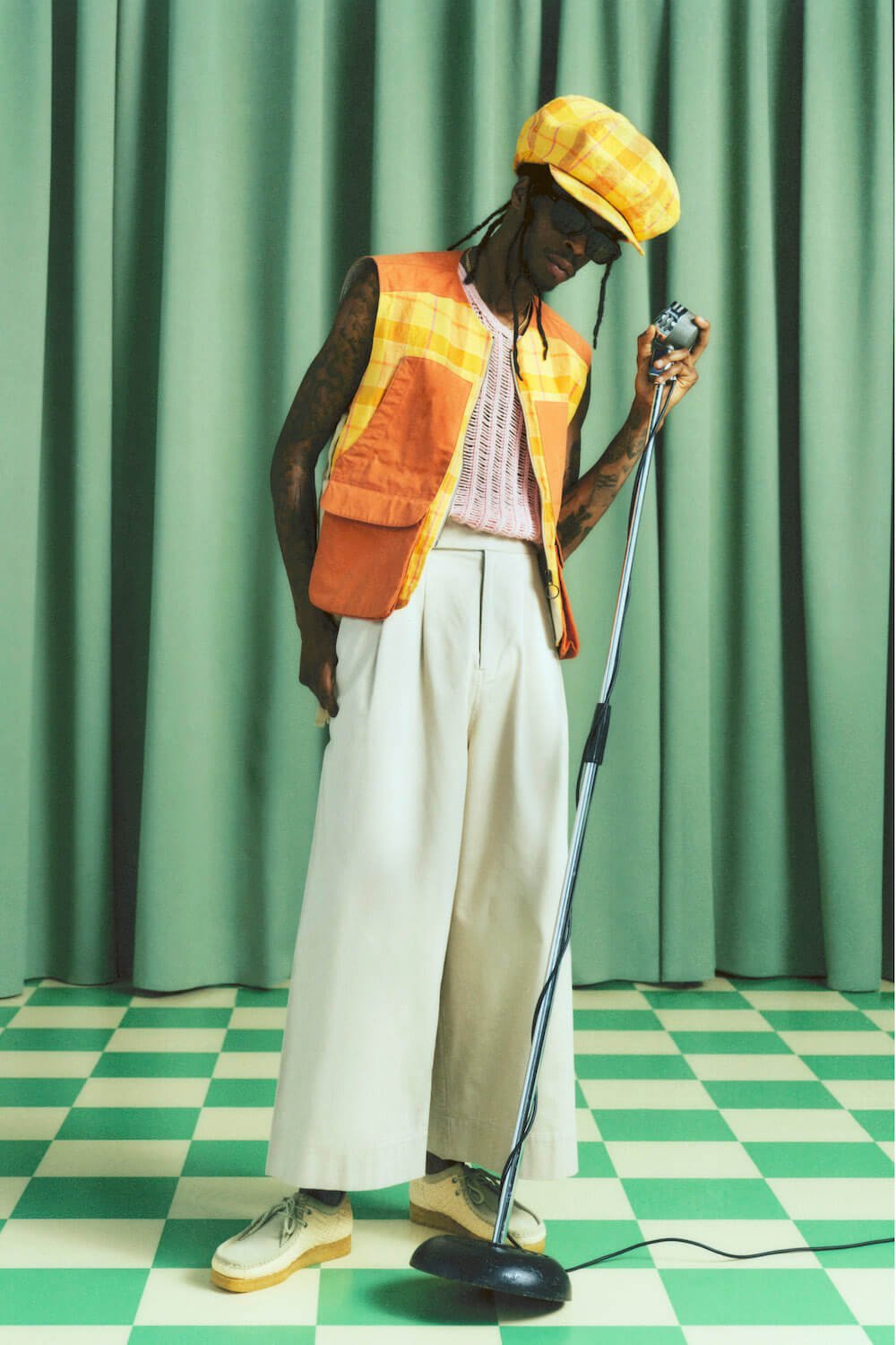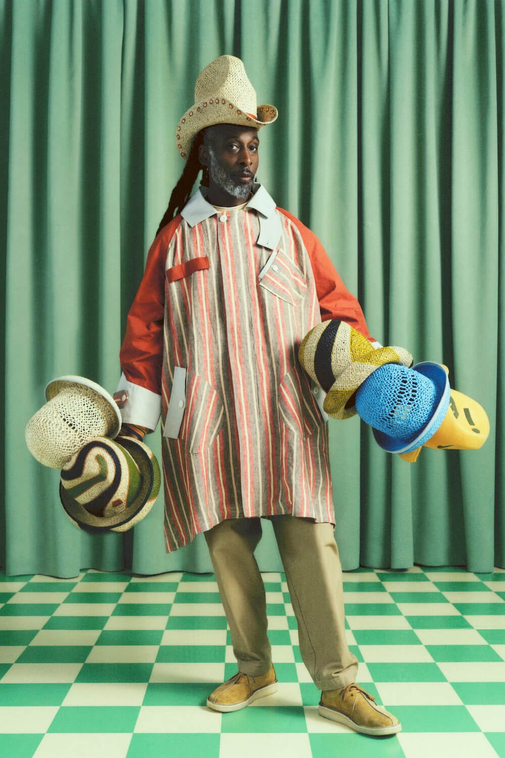 Opting to show off schedule, Nicholas Daley’s SS23 collection explores the rich visual identity of Calypso – an Afro-Caribbean genre that originated in Trinidad and Tobago – through his personal lineage. His journey begins with his grandmother’s treasured silver picture-frame, that she has had since the 1960s, containing a grayscale headshot of actor, singer and civil rights activist Harry Belafonte in a wide-lapel suit. The inscription reads: “To Dorothy, it was good seeing you, next time, let’s spend more time, love, Harry” – a message passed between cousins. Belafonte’s bespoke suiting informs the silhouettes. Trousers are high-waisted and wide-legged, shirts are open-collared, lapels are large, and prints nod to tropical, floral and aloha designs. Set against a simple studio backdrop, a sizable cast of characters spanning generations and occupations, from barber to chef, yogi to musician, are posed with the tools of their trade – it’s an abundant celebration of craft, DIY culture and Black folk music.