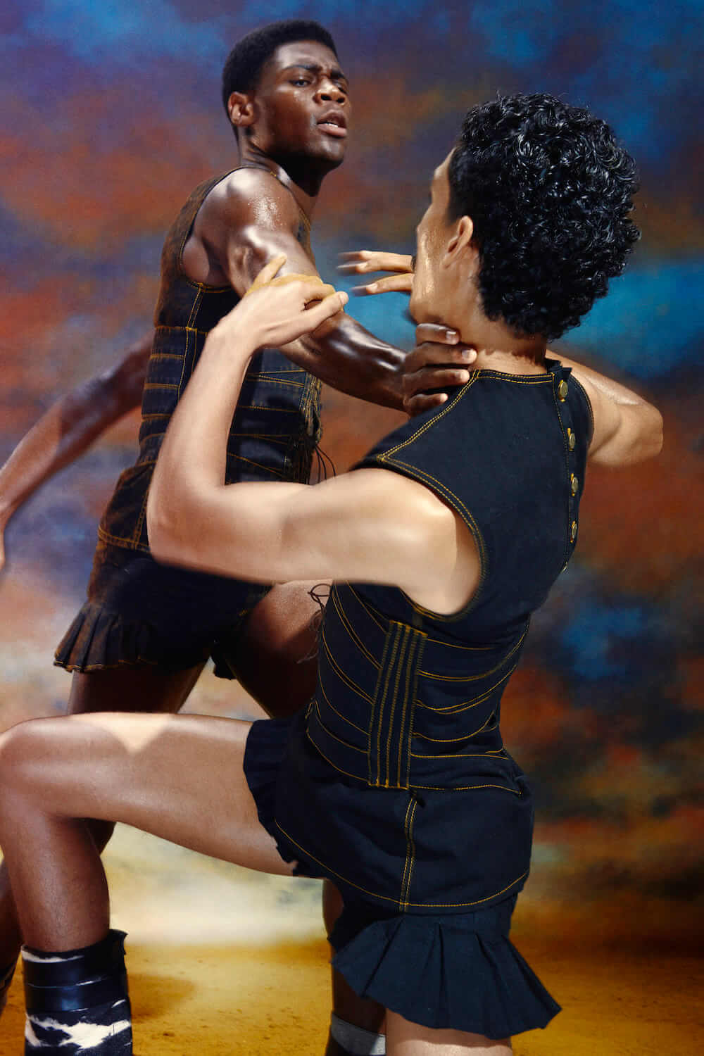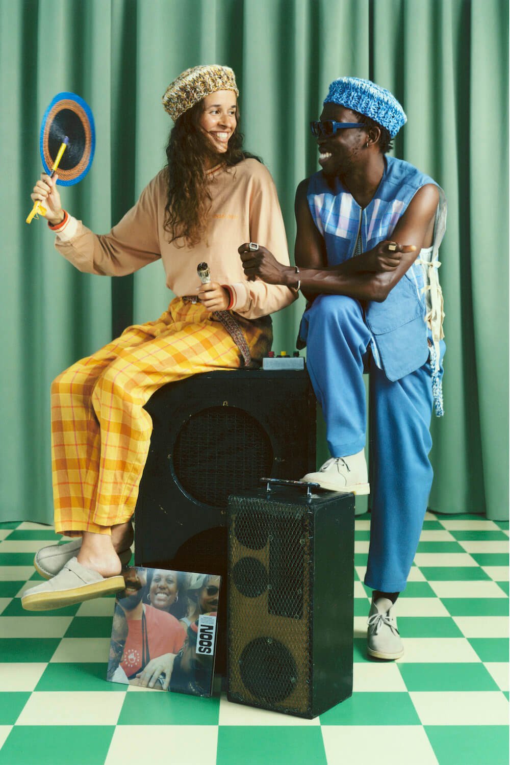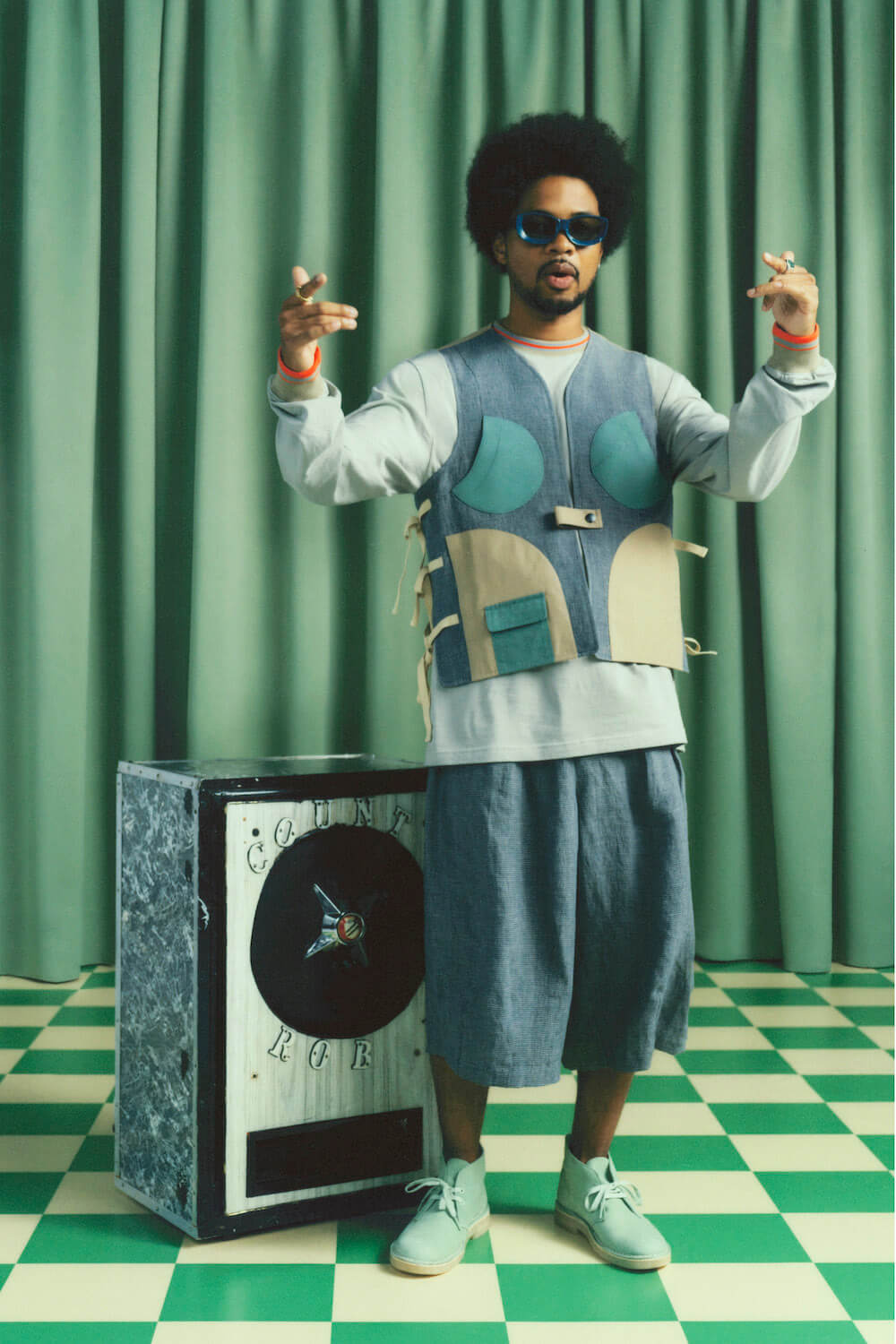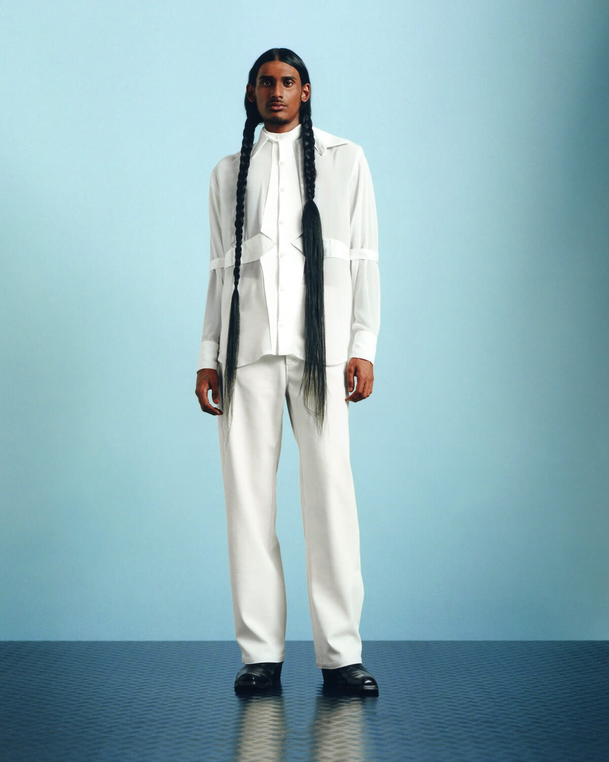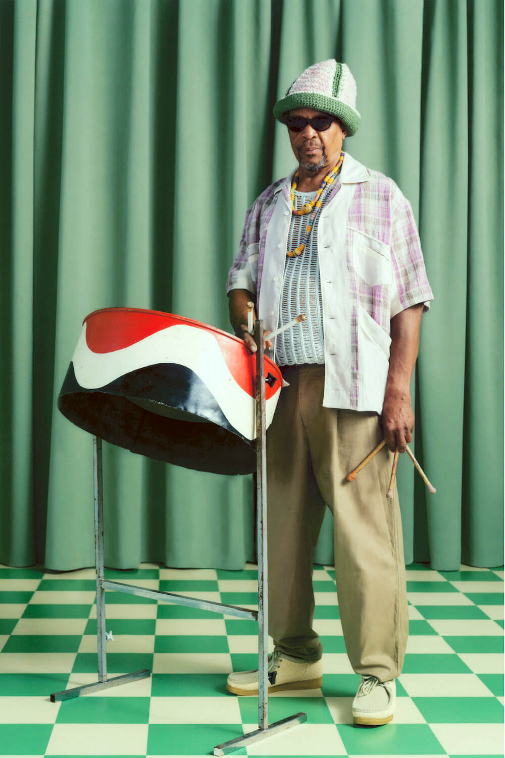 Opting to show off schedule, Nicholas Daley’s SS23 collection explores the rich visual identity of Calypso – an Afro-Caribbean genre that originated in Trinidad and Tobago – through his personal lineage. His journey begins with his grandmother’s treasured silver picture-frame, that she has had since the 1960s, containing a grayscale headshot of actor, singer and civil rights activist Harry Belafonte in a wide-lapel suit. The inscription reads: “To Dorothy, it was good seeing you, next time, let’s spend more time, love, Harry” – a message passed between cousins. Belafonte’s bespoke suiting informs the silhouettes. Trousers are high-waisted and wide-legged, shirts are open-collared, lapels are large, and prints nod to tropical, floral and aloha designs. Set against a simple studio backdrop, a sizable cast of characters spanning generations and occupations, from barber to chef, yogi to musician, are posed with the tools of their trade – it’s an abundant celebration of craft, DIY culture and Black folk music.