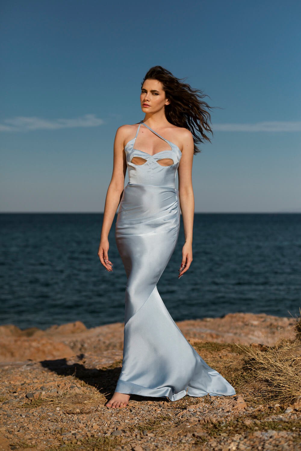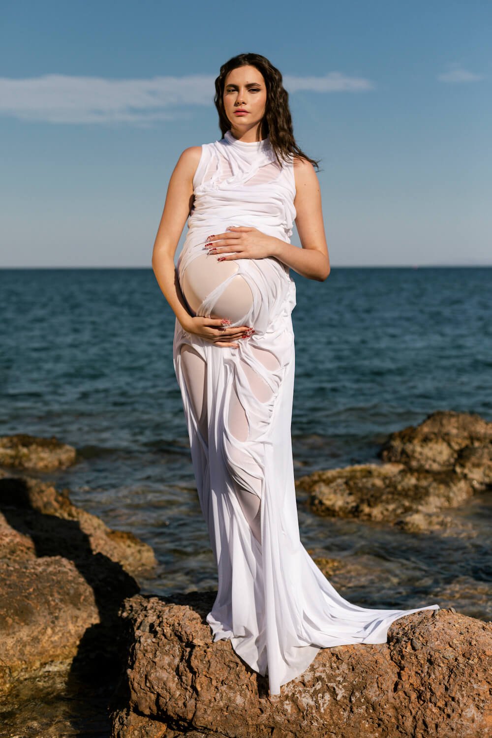 Screened at the Selfridges Cinema on Tuesday, Di Petsa’s Newgen debut was an ethereal short film set on the rocky hillside of a secluded beach-front in Greece. Titled, The Moon Tastes of Wine, it was written and directed by Dimitra herself as an ode to the healing powers of creative expression and earthly connections, grounding muses, mothers, daughters and sirens in their bodies; their vessels; their womanhood; and the water that is contained within them. Inspired by the ritualistic Dionysian Mysteries of Ancient Greece, silk organza kaftans, Birthing Venus knitwear – with the contoured print of the female form –, and slinky silk slip dresses appeared. Elsewhere, signature hand-draped Wetlook illusion gowns made in recycled mesh were expanded for all ages of the divine feminine.