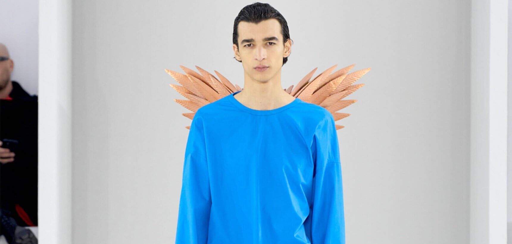 Each look often focused on a singular garment. Standout, swollen overcoats which had to be stepped into walked alongside silky boxer shorts, bulbous suede coats and undergarment-style tops, unbuttoned at the back, which were worn with spiked angel wings – Anderson’s own Renaissance protagonists. The whole thing was quietly sensual and challenged how we see and respond to clothing in an utterly genius way, devoid of gimmicks. “I hope we’re entering a period where we are uncomfortable with design,” said Anderson, “in order to find something completely new.”