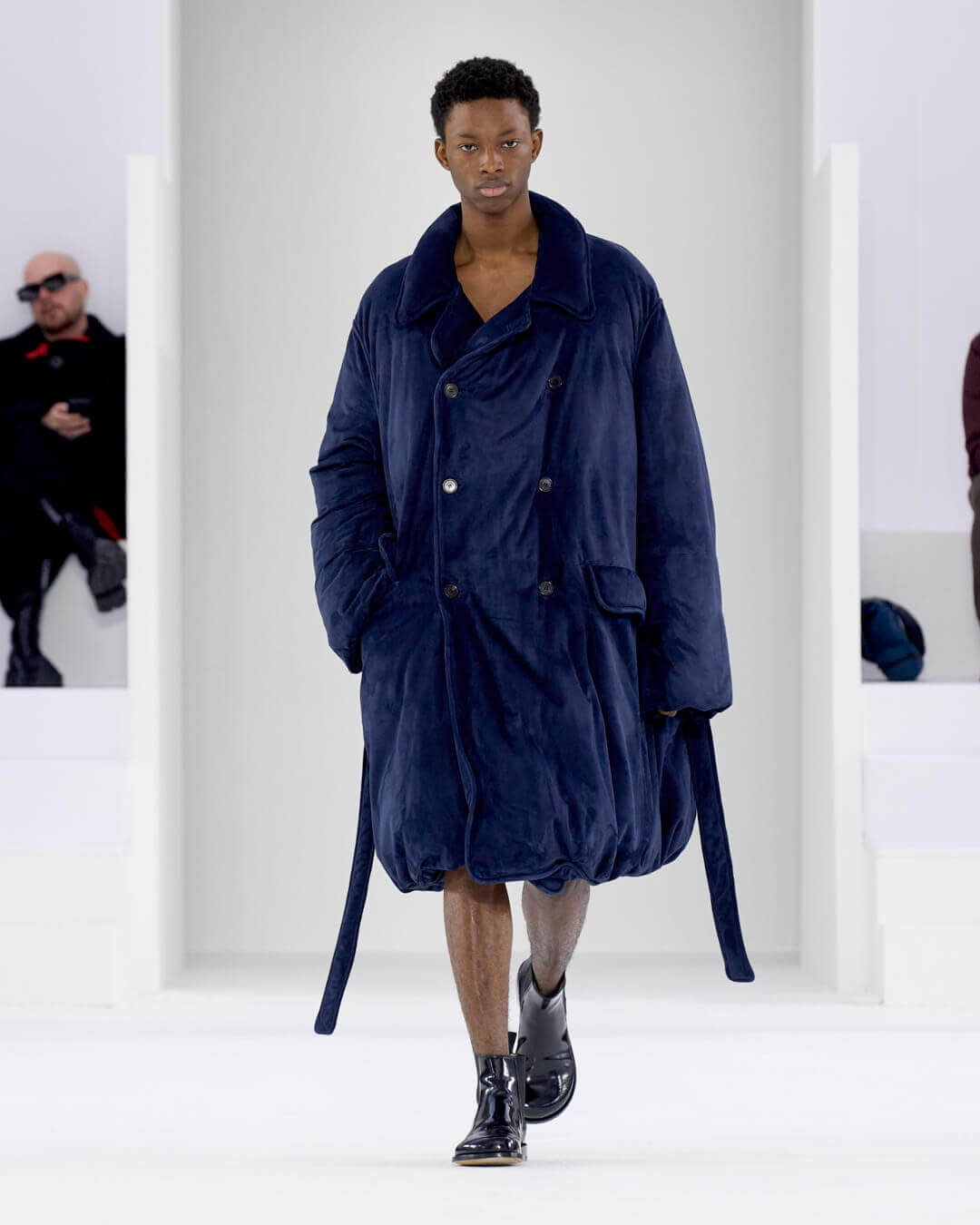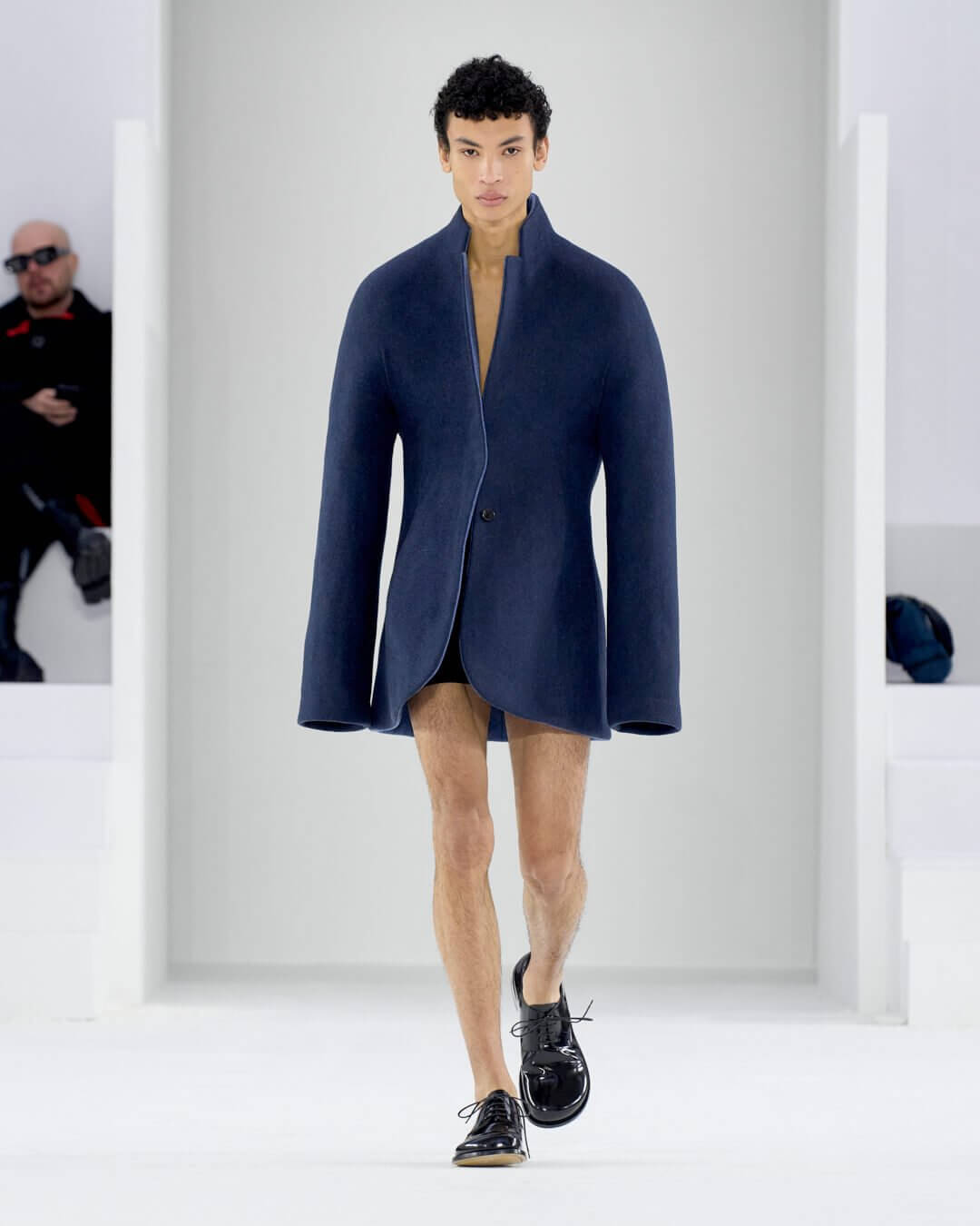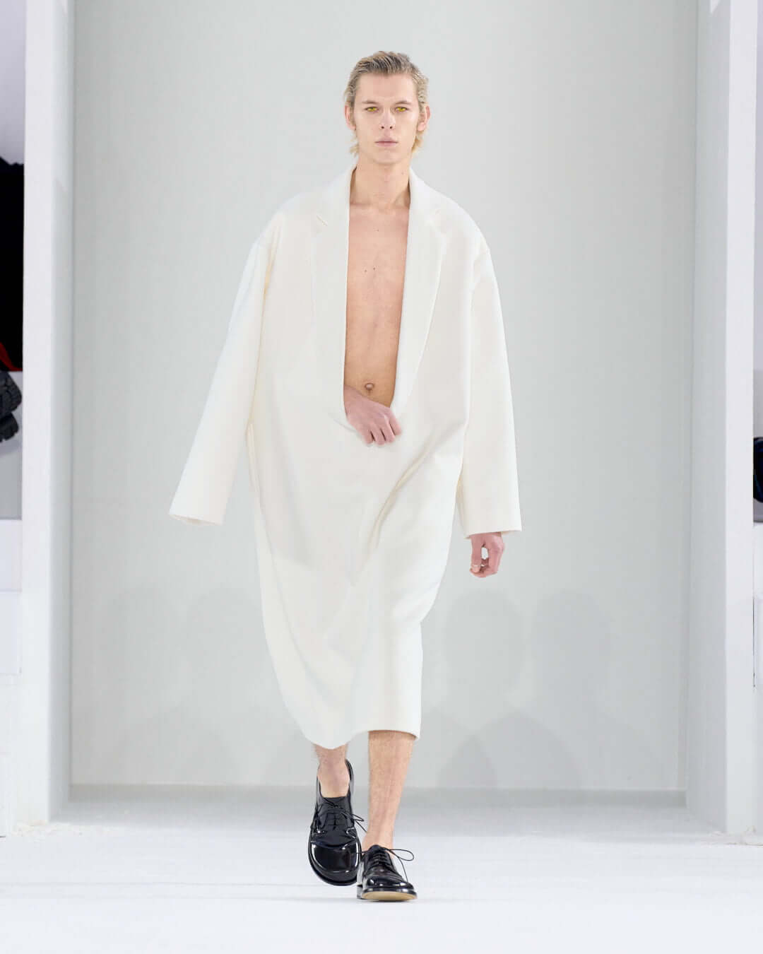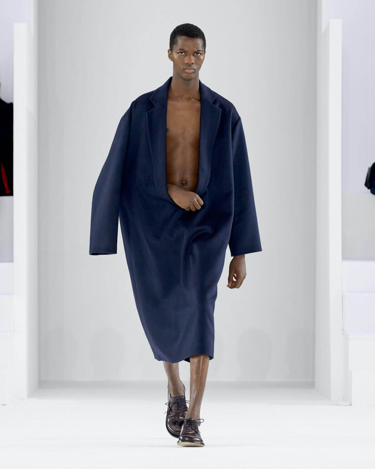 Each look often focused on a singular garment. Standout, swollen overcoats which had to be stepped into walked alongside silky boxer shorts, bulbous suede coats and undergarment-style tops, unbuttoned at the back, which were worn with spiked angel wings – Anderson’s own Renaissance protagonists. The whole thing was quietly sensual and challenged how we see and respond to clothing in an utterly genius way, devoid of gimmicks. “I hope we’re entering a period where we are uncomfortable with design,” said Anderson, “in order to find something completely new.”