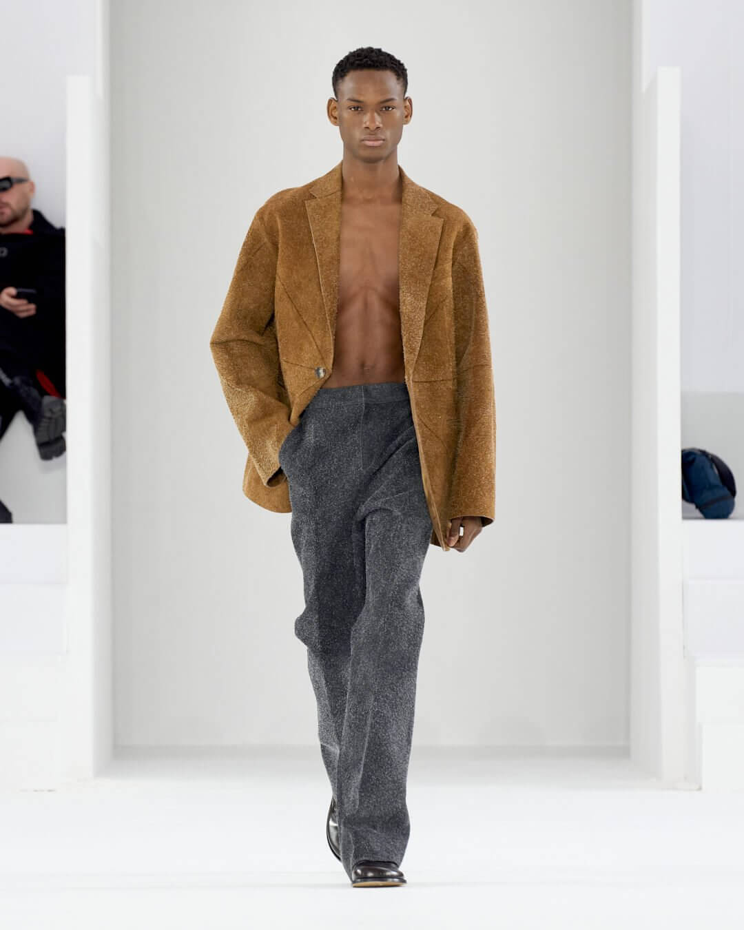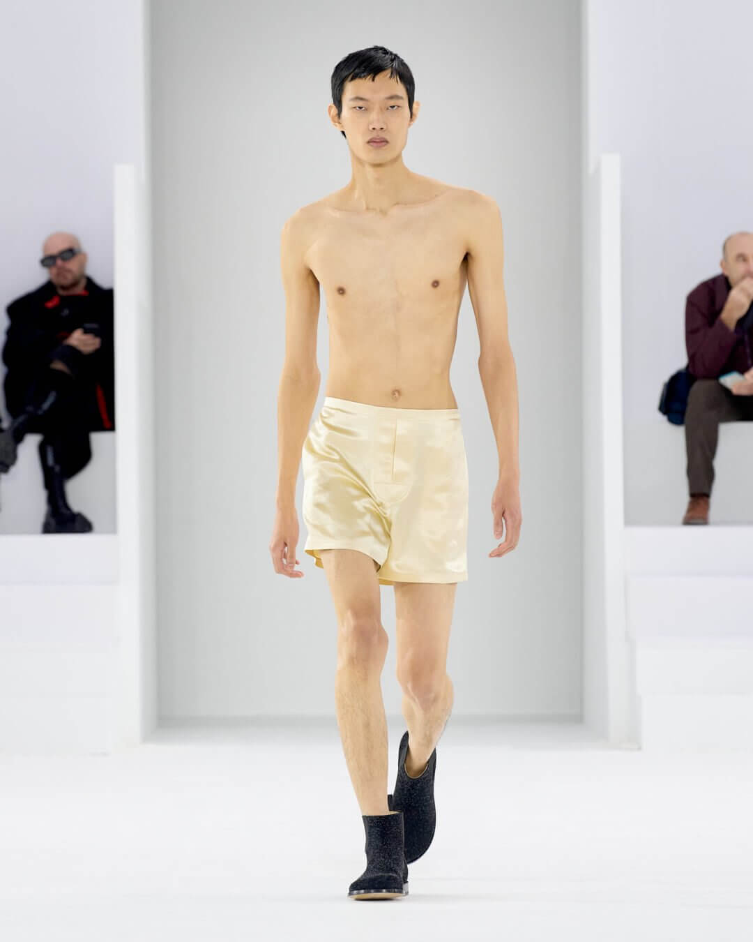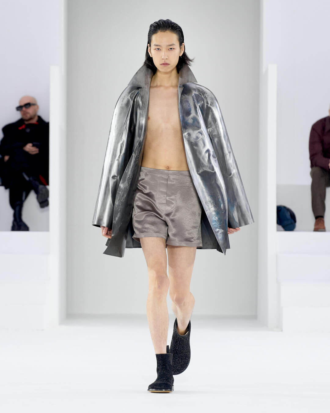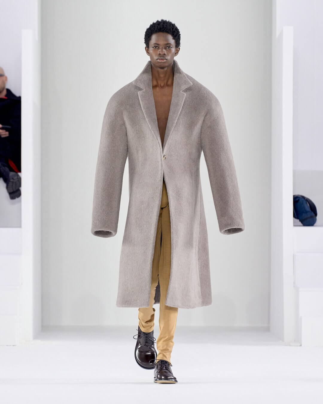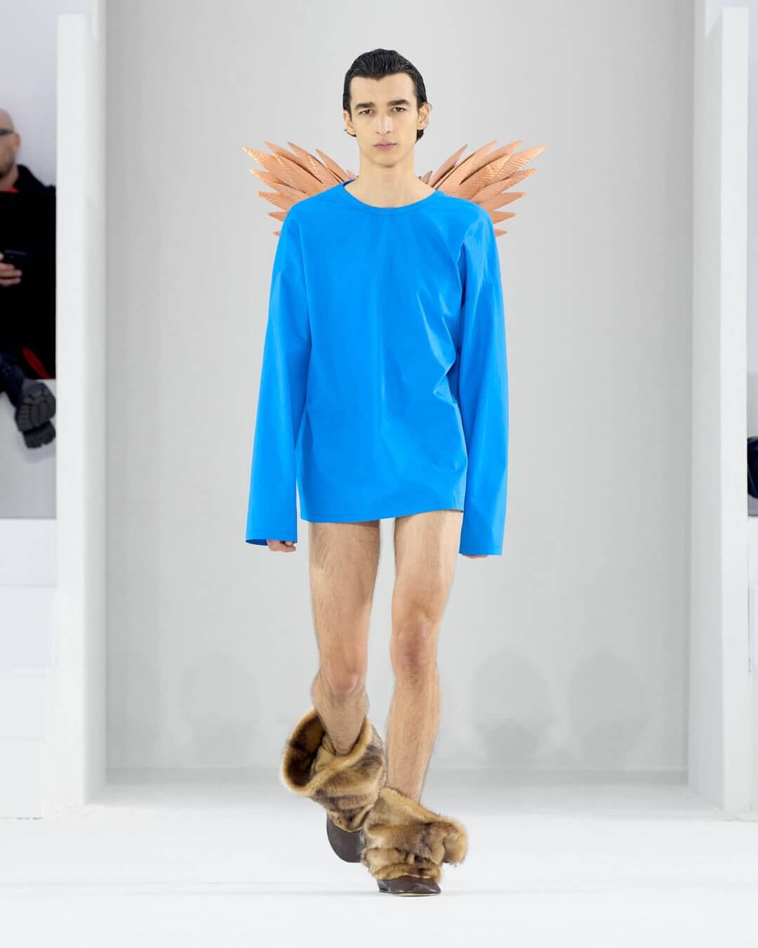 Each look often focused on a singular garment. Standout, swollen overcoats which had to be stepped into walked alongside silky boxer shorts, bulbous suede coats and undergarment-style tops, unbuttoned at the back, which were worn with spiked angel wings – Anderson’s own Renaissance protagonists. The whole thing was quietly sensual and challenged how we see and respond to clothing in an utterly genius way, devoid of gimmicks. “I hope we’re entering a period where we are uncomfortable with design,” said Anderson, “in order to find something completely new.”