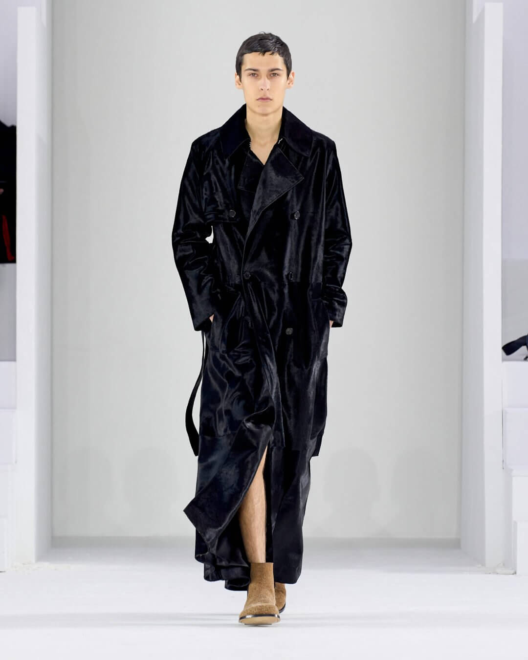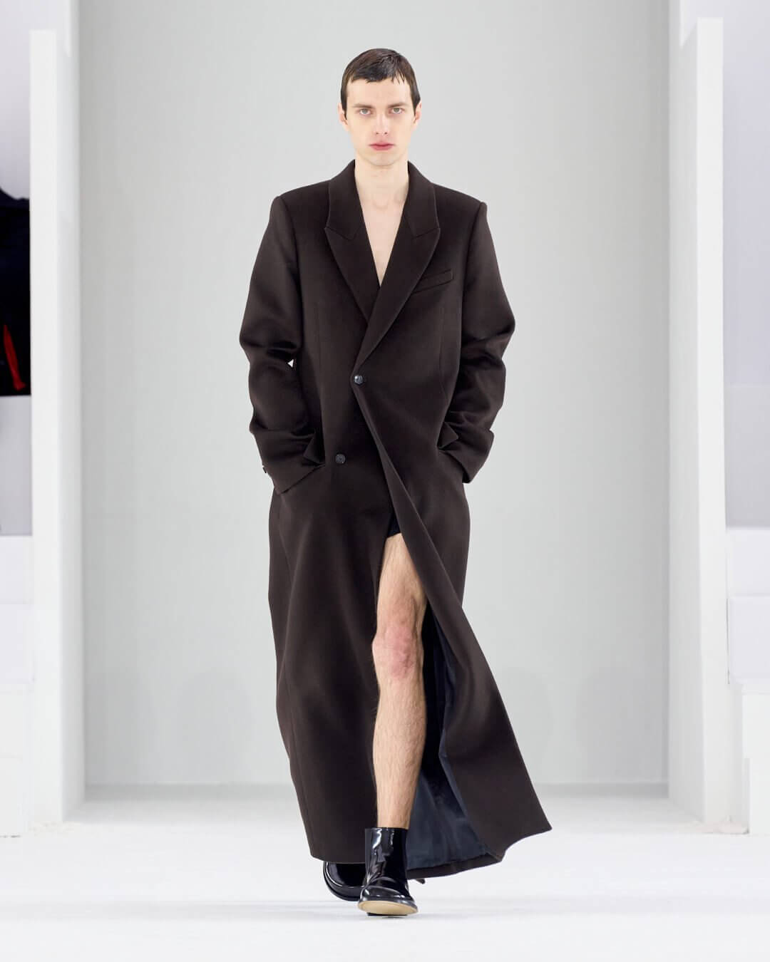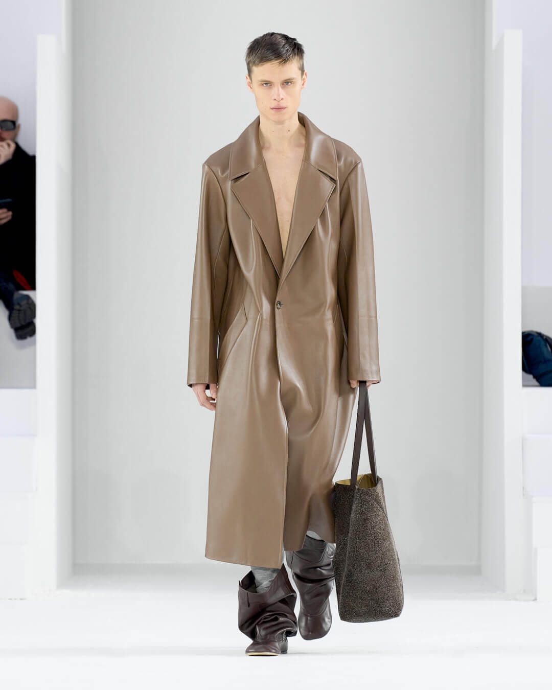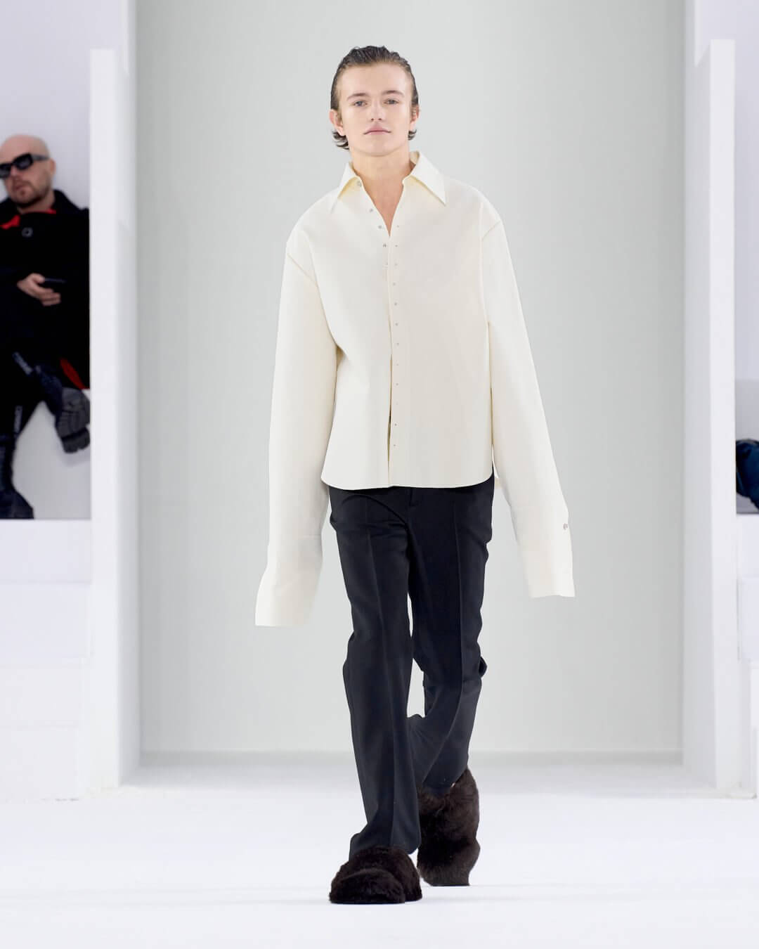 Each look often focused on a singular garment. Standout, swollen overcoats which had to be stepped into walked alongside silky boxer shorts, bulbous suede coats and undergarment-style tops, unbuttoned at the back, which were worn with spiked angel wings – Anderson’s own Renaissance protagonists. The whole thing was quietly sensual and challenged how we see and respond to clothing in an utterly genius way, devoid of gimmicks. “I hope we’re entering a period where we are uncomfortable with design,” said Anderson, “in order to find something completely new.”