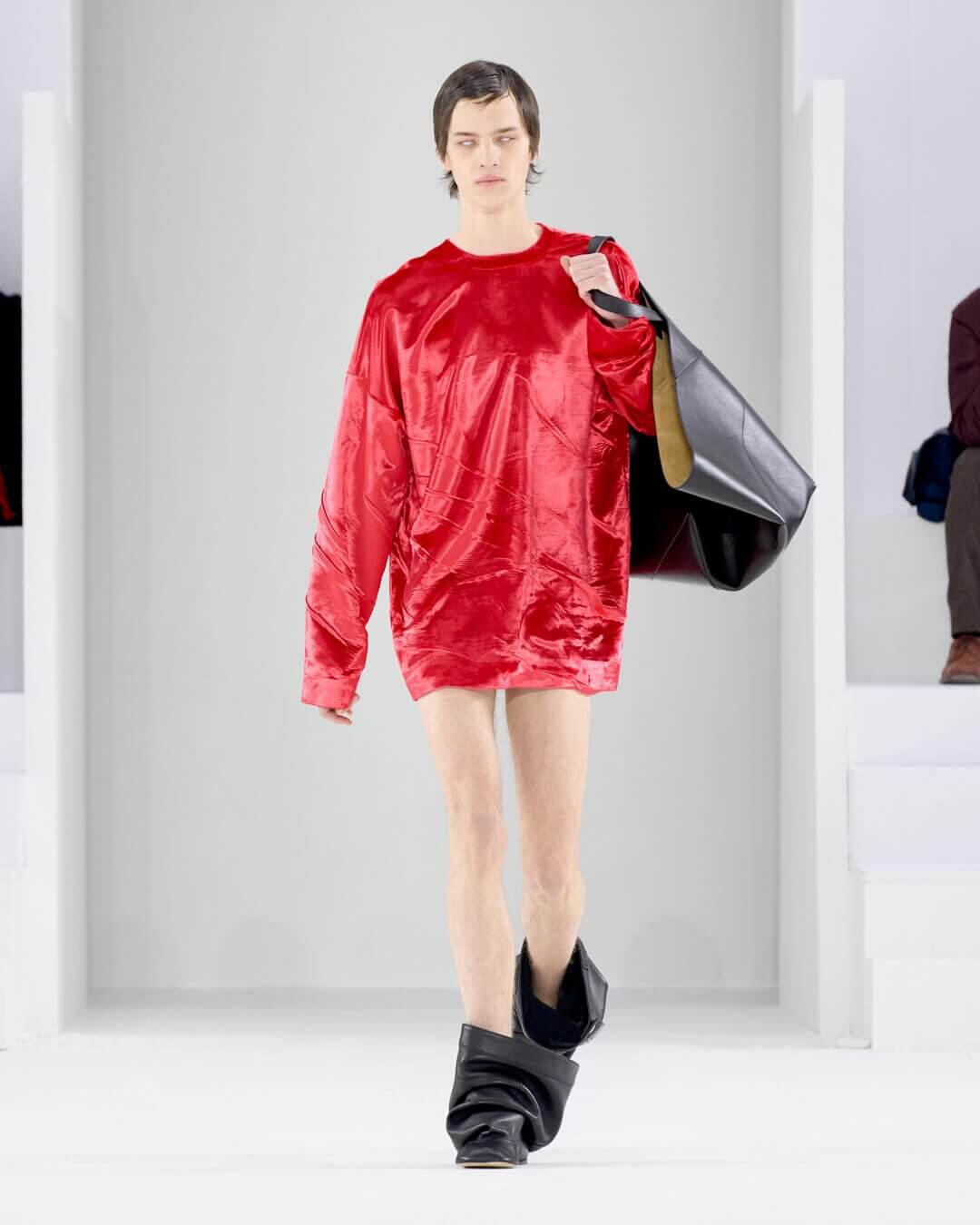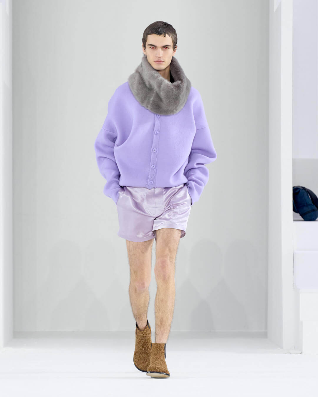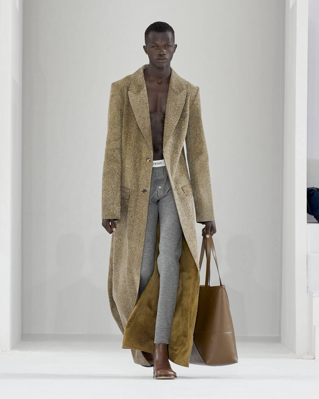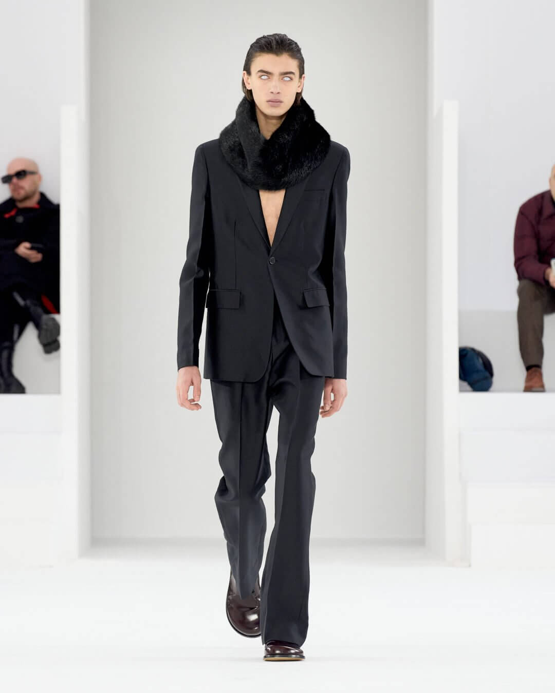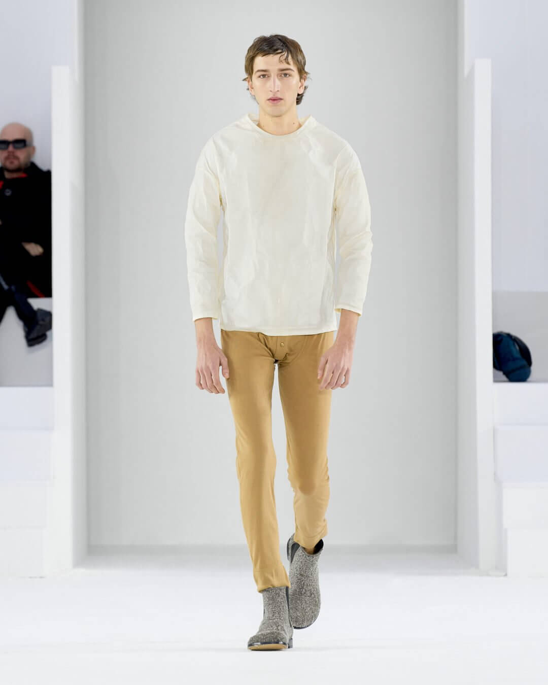 Each look often focused on a singular garment. Standout, swollen overcoats which had to be stepped into walked alongside silky boxer shorts, bulbous suede coats and undergarment-style tops, unbuttoned at the back, which were worn with spiked angel wings – Anderson’s own Renaissance protagonists. The whole thing was quietly sensual and challenged how we see and respond to clothing in an utterly genius way, devoid of gimmicks. “I hope we’re entering a period where we are uncomfortable with design,” said Anderson, “in order to find something completely new.”