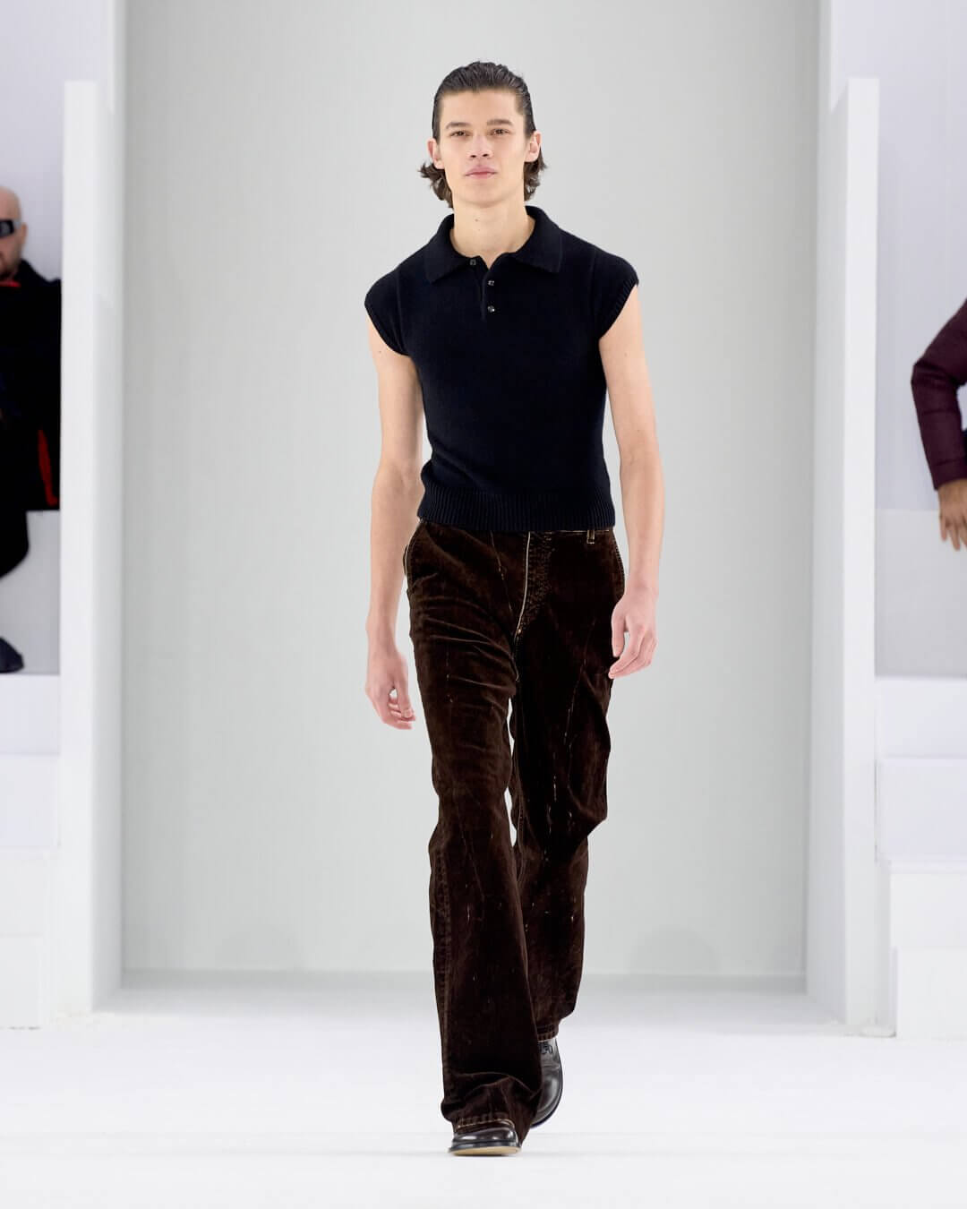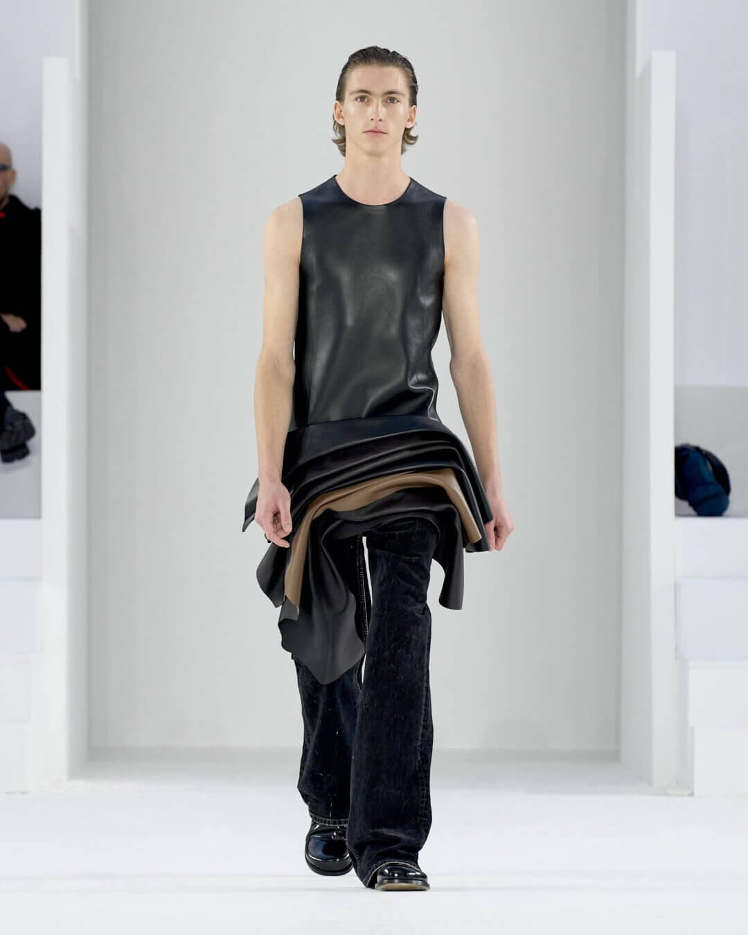 It might come as a surprise, then, to hear that Anderson has pulled back on the bonkers with a collection he dubbed “A reductionist act”. In a stark white cube – featuring two, intimate artworks of brand muse Nikos by Julien Nguyen – he focused on defined silhouettes. Devoid of any print and blunt in its colour palette, the collection wowed in its use of unexpected materials once “used by, or depicted by” Old Master painters. Whether it was jackets fashioned from hammered copper, or contoured, parchment shirts which came frozen in time – as if “thrown into -40 degrees”.