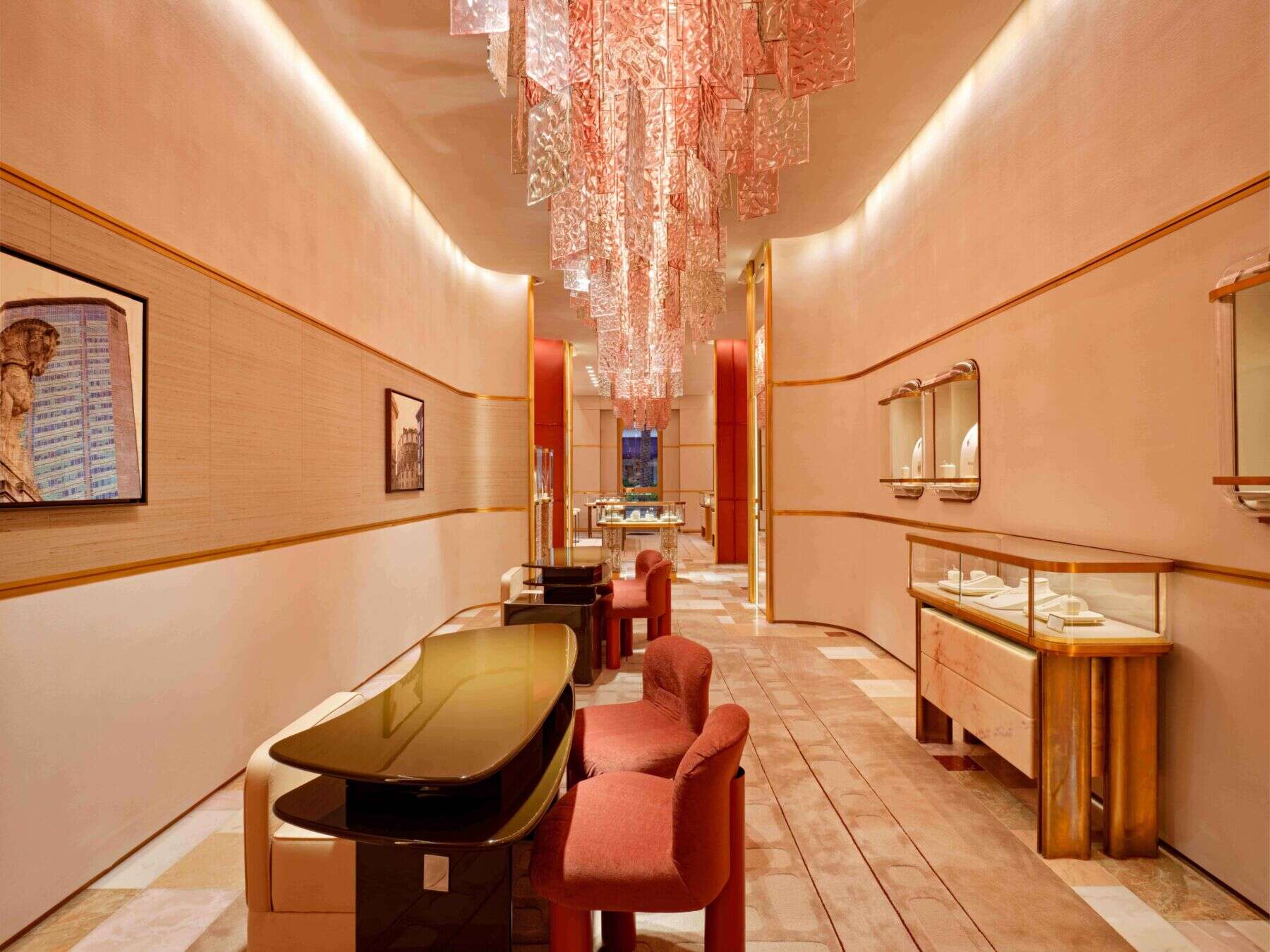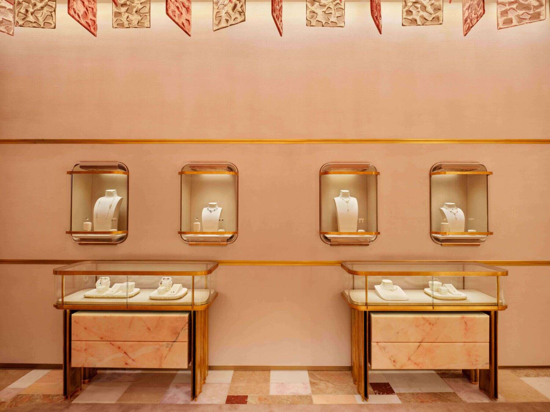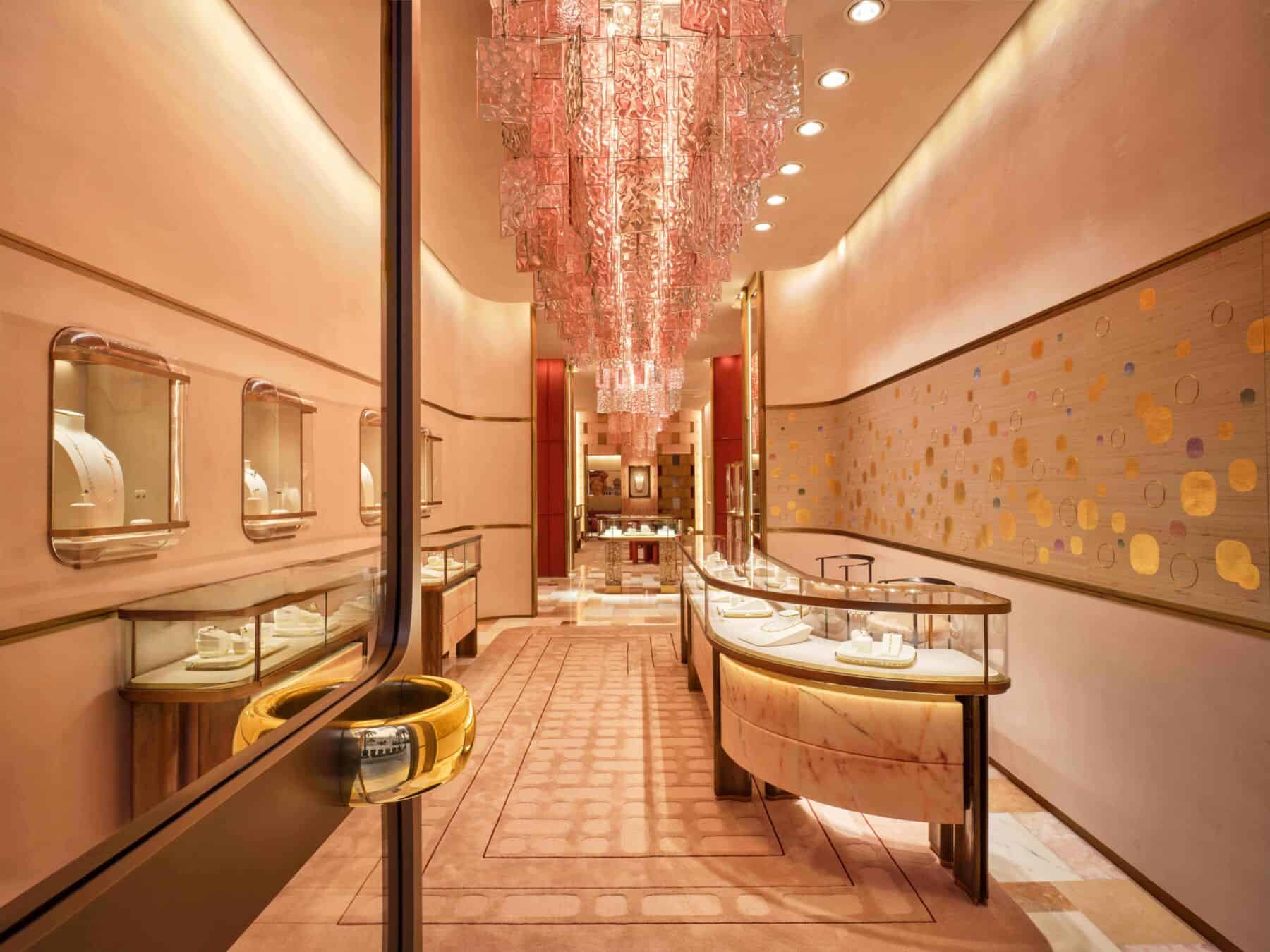 West Coast sunshine proved to be too alluring for Pomellato as they recently opened a new flagship boutique on Rodeo Drive. Featuring a fusion of Hollywood glamour and Northern Italian sophistication, the space was designed by the brand’s Milan-based architecture team with a focus on craftsmanship. From hand-painted MISHA Milano silk panels to Murano glass chandeliers and pink marble floors inspired by the Duomo, every detail pays homage to Pomellato’s heritage while embracing a modern attitude.