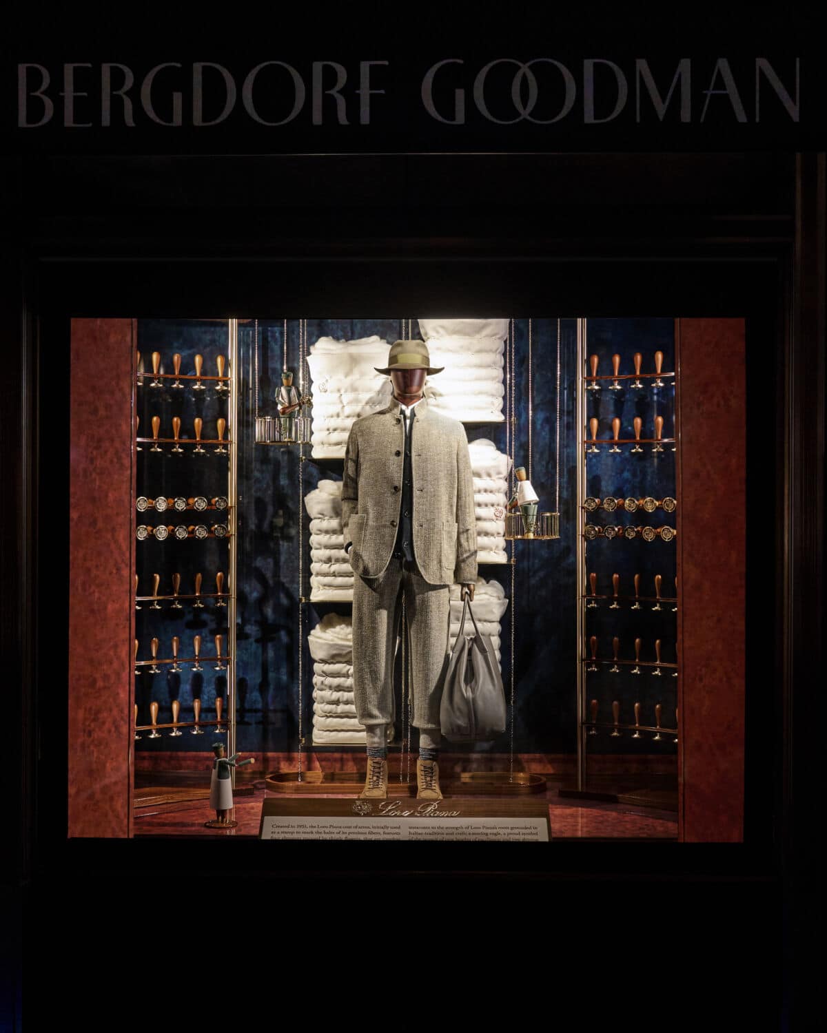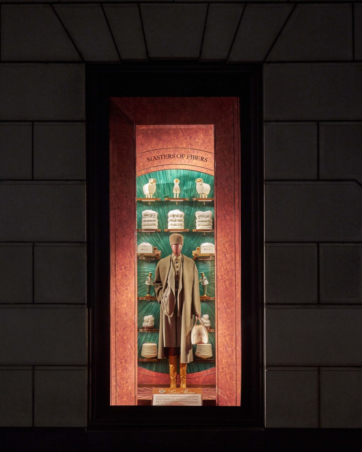 What could be more ideal this time of year than swaddling yourself in luxurious cashmere? For all of your cozy needs comes Loro Piana’s Bergdorf Goodman installation which takes over the legendary department store’s men’s and women’s windows from now through November 3rd. With an Art Deco feel, you’ll see a series of wooden puppets that are meant to represent Loro Piana’s artisans with each scene designed to chronicle the brand’s 100-plus year history. On the women’s side you’ll find setups like “Master of Fibers”, which tells the story of raw materials like cashmere or another that highlights baby cashmere and features miniature goats that float across a cloudy sky. The thistle flower, integral to the brand’s coat of arms, gets its own moment while sketches by Marcello Dudovich populate another window. In honor of New York City, one display has the skyline taking center stage against a kummel background as the little dolls perform quality control with miniature magnifiers and needles, while another shows an exclusive foulard created by the department store. To round it, in the evening there will be an illuminated light show that spans the facade.