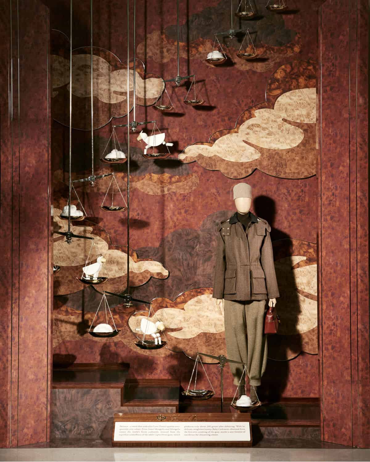 Over on the men’s side, the scenery is equally as clever with one window featuring miniature vintage cars driving along Loro Piana’s signature Suitcase Stripes. Another has eight bales of fiber and are marked with the coat of arms. The third includes a quote from Pier Luigi Loro Piana “Luxury is inextricably linked to quality” woven with a wooden loom against a dark green background. Regardless of which store you enter, expect to shop plenty of exclusive products from a men’s wool overshirt to a leopard print women’s cloche hat to the Grande Unita scarf and Unito blanket, both of which can be personalized.