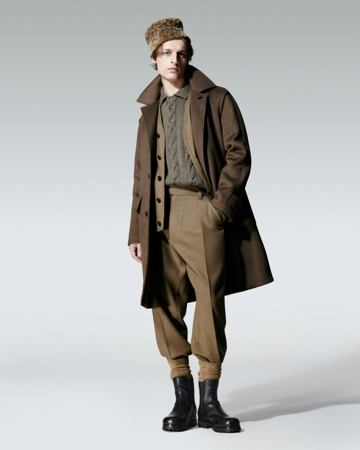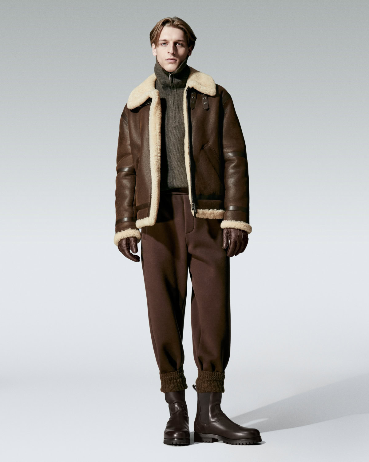 The silhouettes feel assembled on the move. Long dusters skim over fluid tailoring. Cable knits in Baby Cashmere and Gift of Kings wool are layered over silk-satin slips trimmed with lace. Cinched culottes and wide skirts bring shape without stiffness. For men, relaxed double-breasted coats, easy suiting and revived icons like the Roadster and Traveller jackets come in buttery wool and silk technical blends. A shearling blouson is cut round and generous, almost snowball soft.