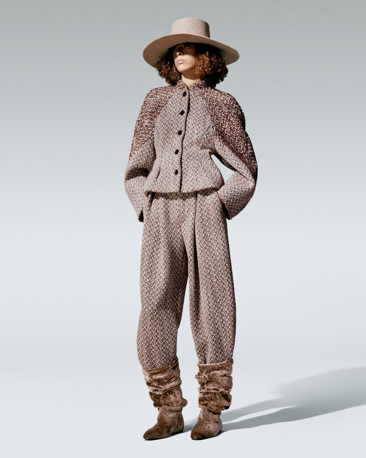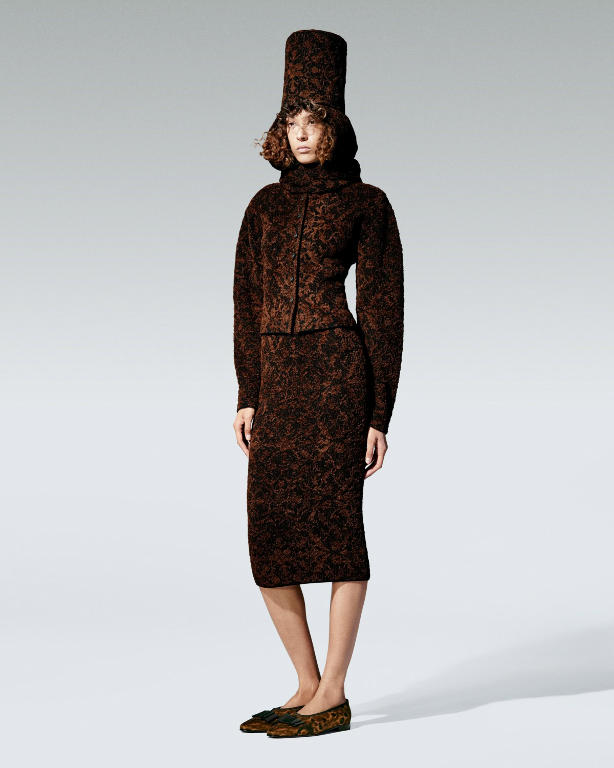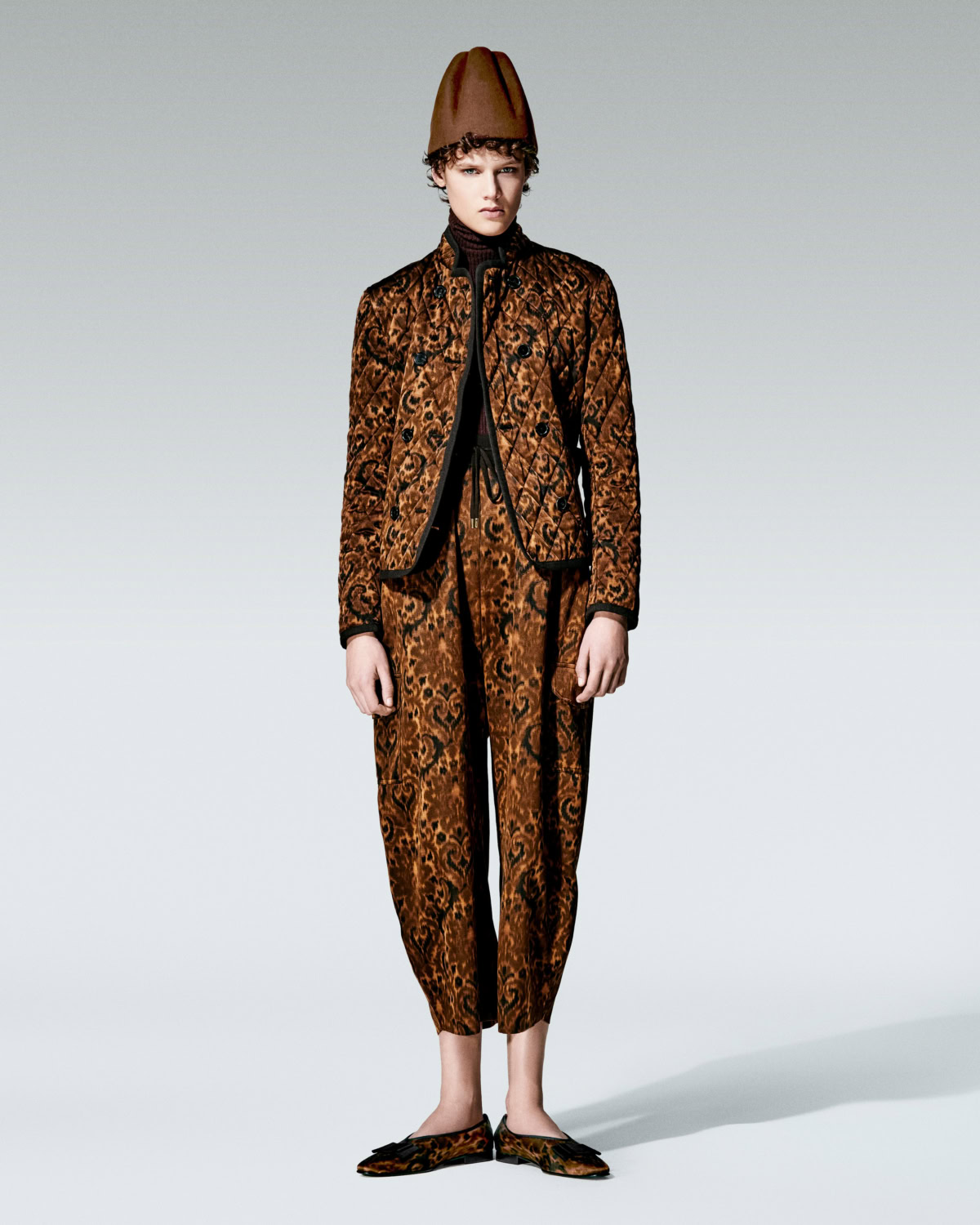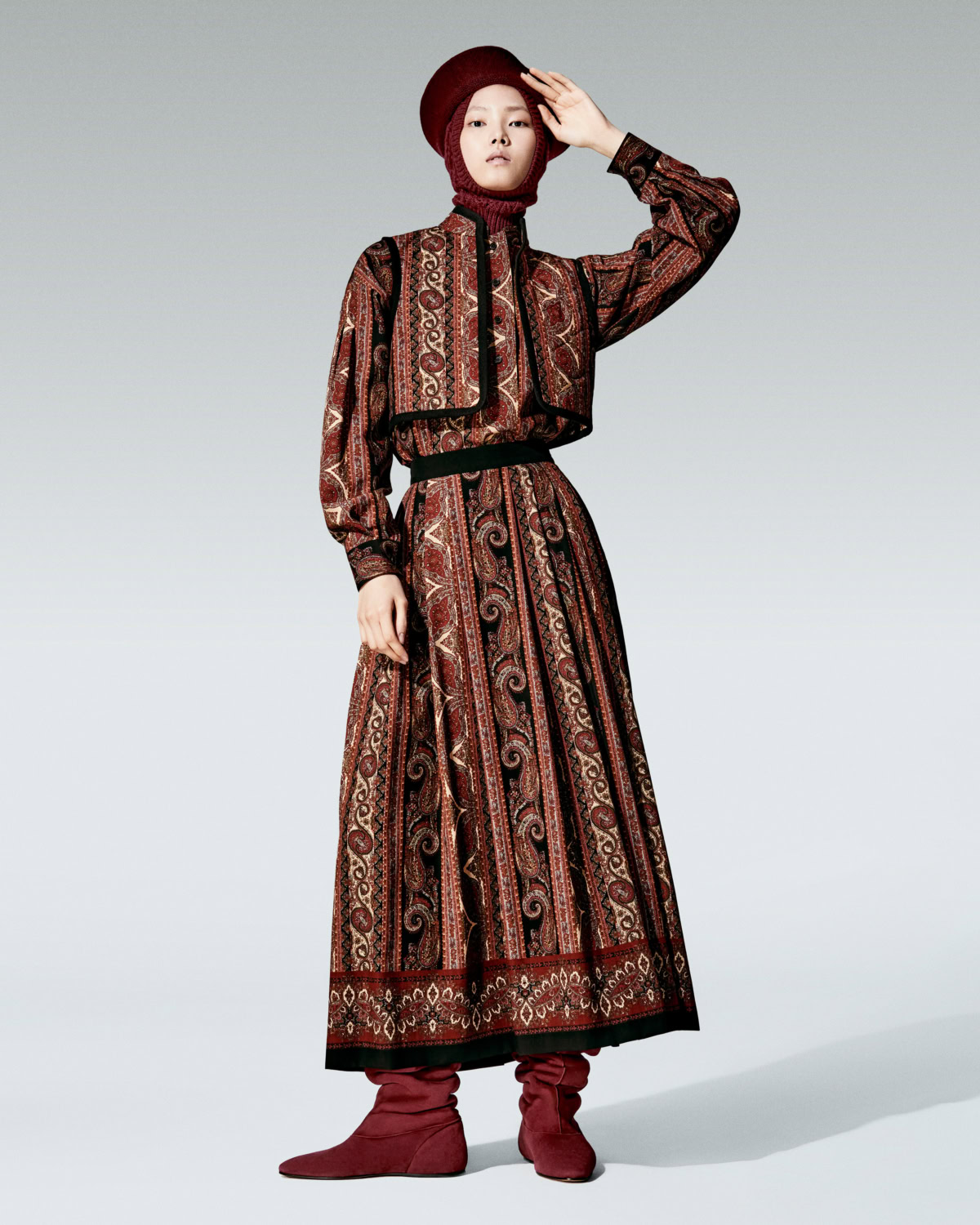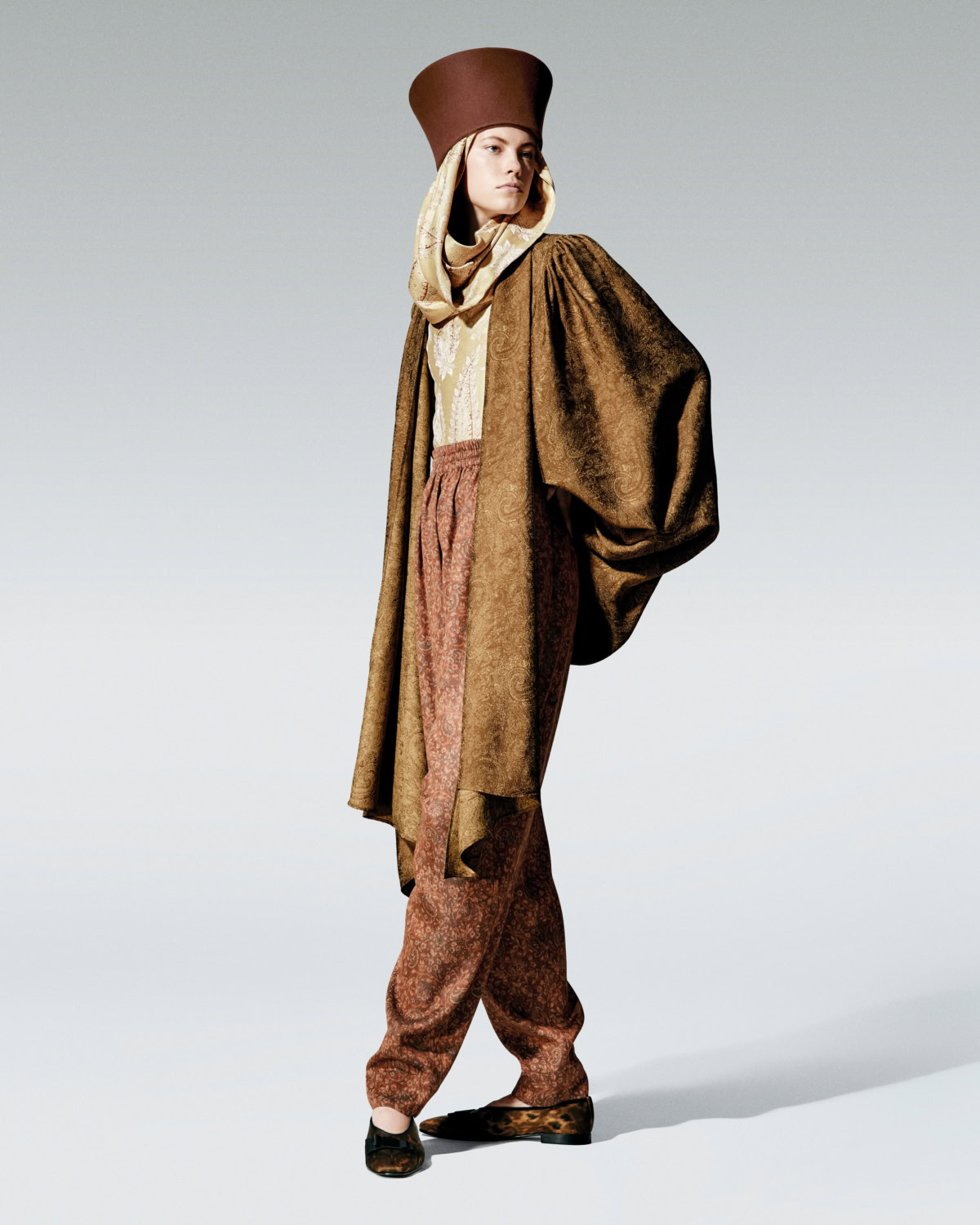 Paisley anchors the story. The house’s archival teardrop motif, first explored in the late ‘60s and ‘70s, reappears on shawls and scarves and woven through jacquards in pumpkin, ochre and tobacco. The colour palette shifts like scenery outside a train window – terracotta and gold warming into beige and grey, deepening to tundra, midnight and finally black and white. It is subtle but deliberate.