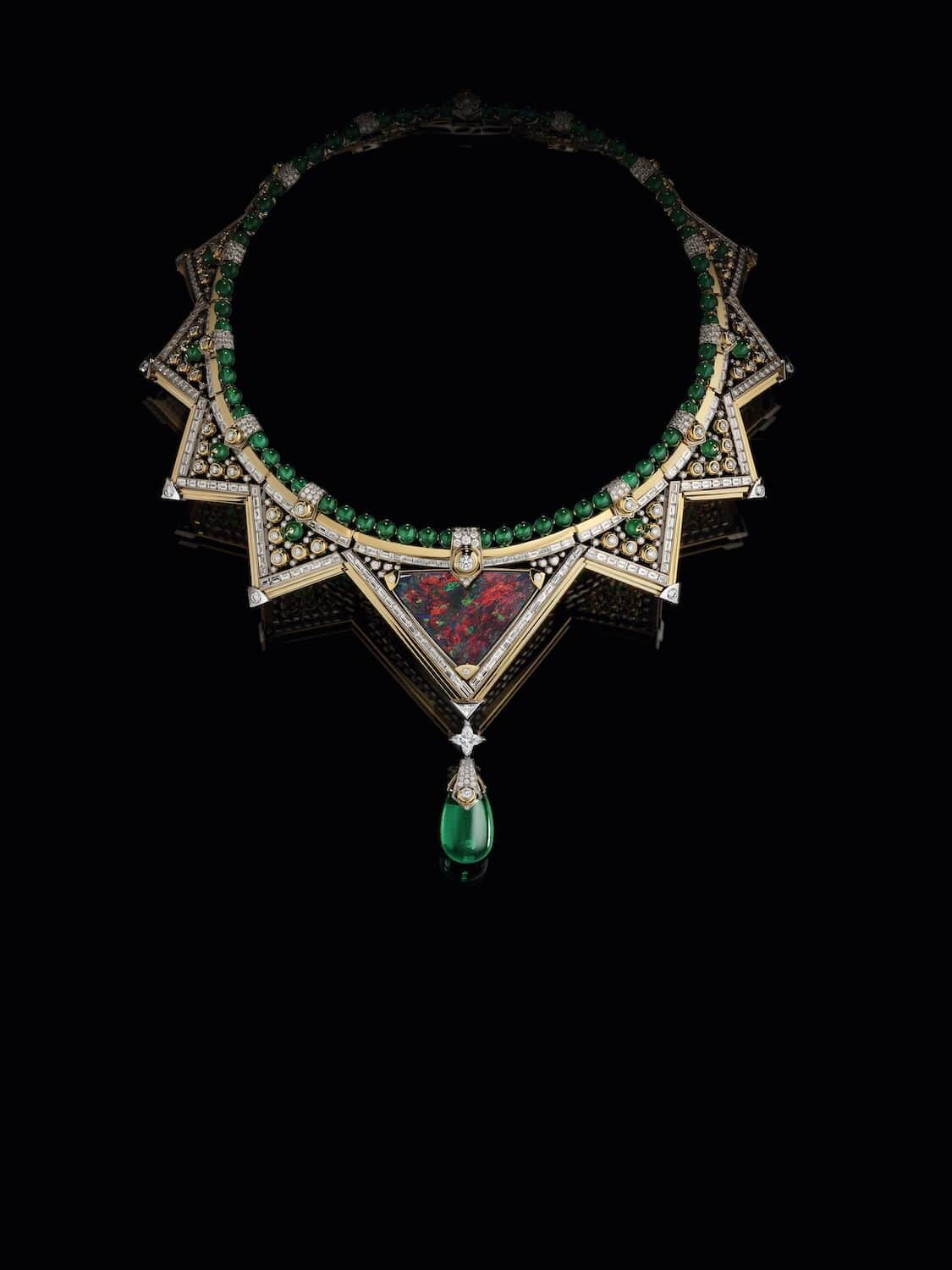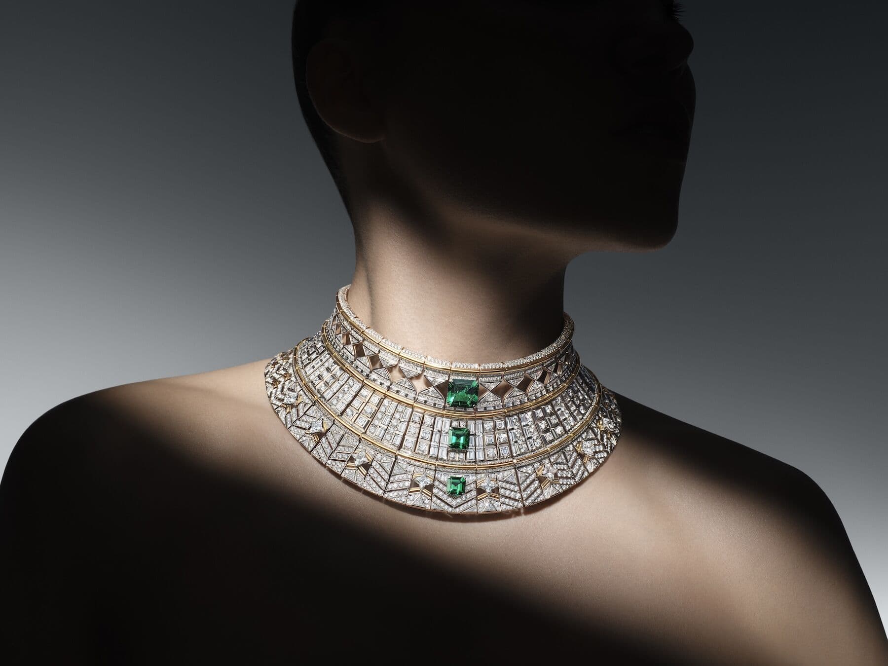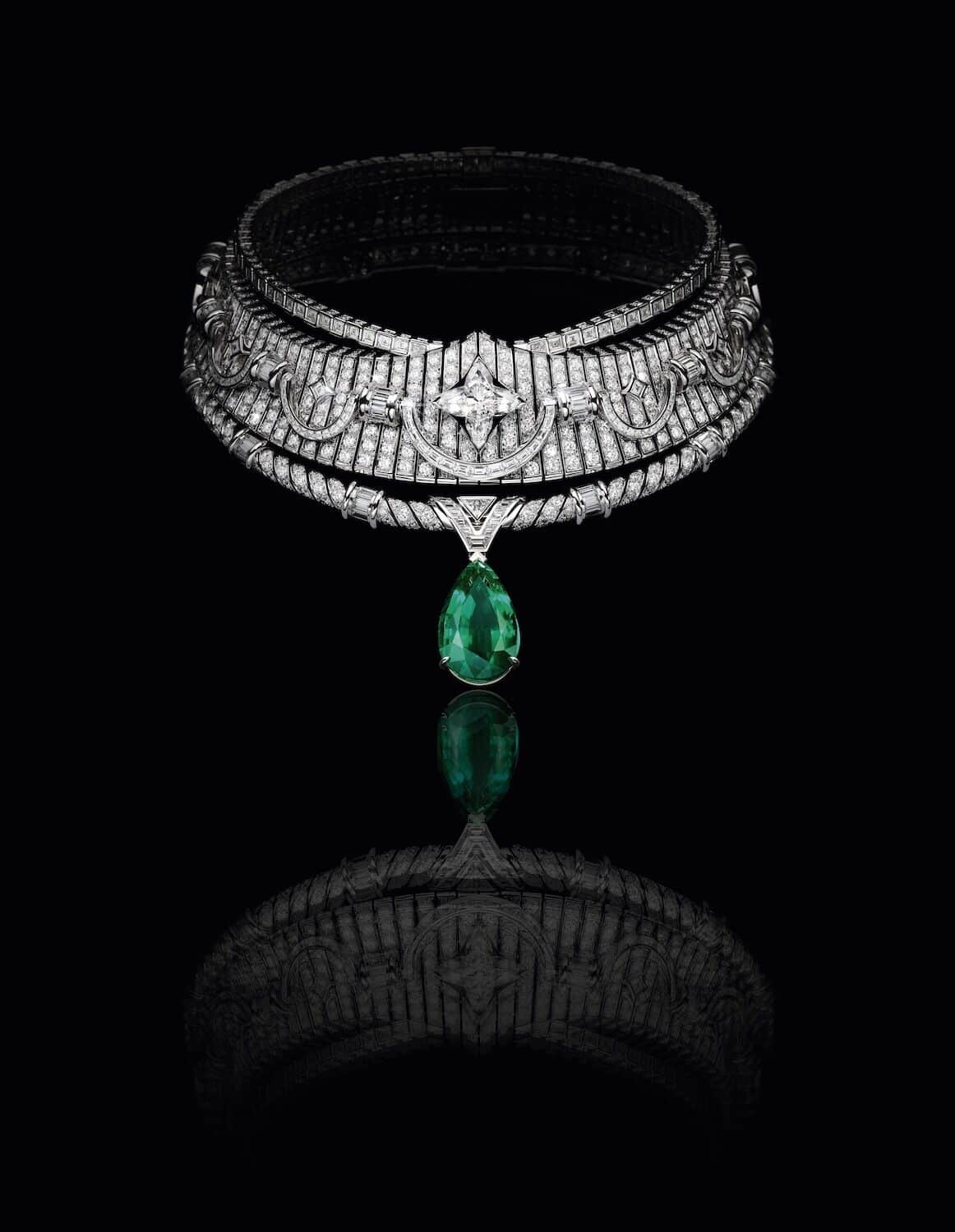 The World of Mastery showcases seven themes rooted in Louis Vuitton’s savoir-faire. It begins with Savoir, where knowledge is revered and guarded. Highlights include a striking 30.56-carat Australian black opal, set within angular designs inspired by Louis Vuitton’s iconic trunks. Following this is Protection, featuring shield motifs and an array of rubies and pearls, symbolising sacred wisdom. Themes such as Keeper, with its bold cabochon sapphires and genderless designs, and Monumental, showcasing intricate Damier patterns of onyx and emeralds, celebrate the brand’s architectural precision. The culmination is Apogée, epitomized by a necklace featuring a 30.75-carat Brazilian emerald.