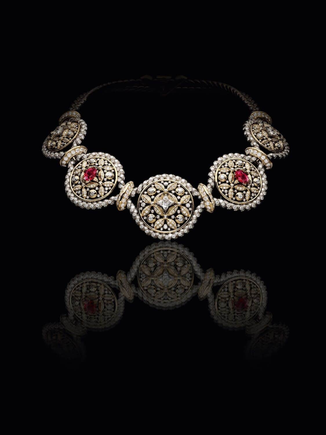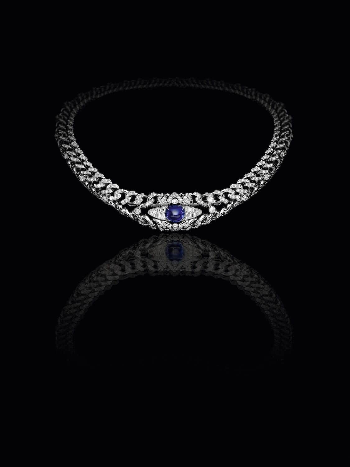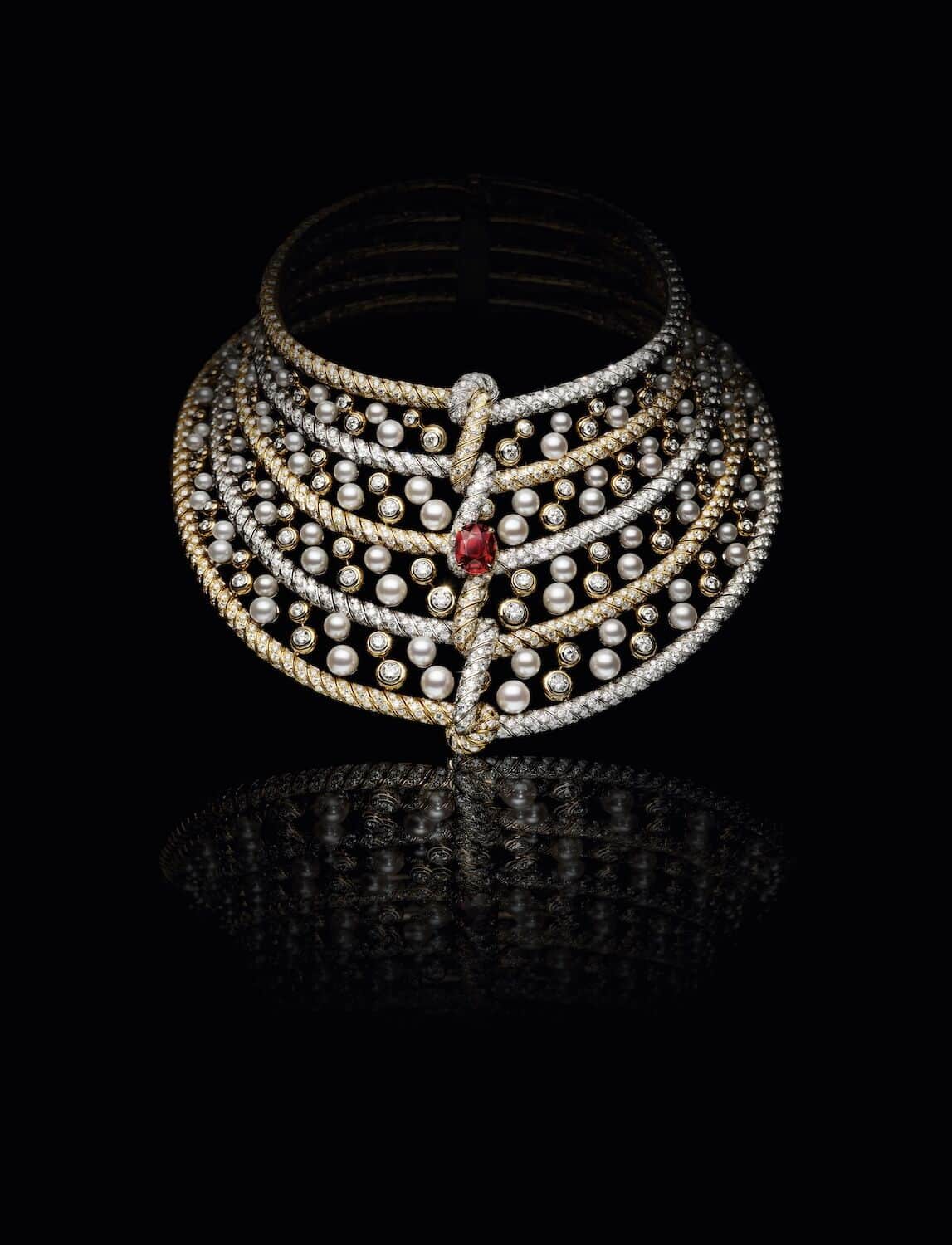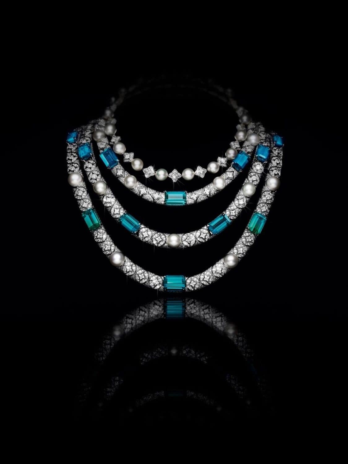 The World of Mastery showcases seven themes rooted in Louis Vuitton’s savoir-faire. It begins with Savoir, where knowledge is revered and guarded. Highlights include a striking 30.56-carat Australian black opal, set within angular designs inspired by Louis Vuitton’s iconic trunks. Following this is Protection, featuring shield motifs and an array of rubies and pearls, symbolising sacred wisdom. Themes such as Keeper, with its bold cabochon sapphires and genderless designs, and Monumental, showcasing intricate Damier patterns of onyx and emeralds, celebrate the brand’s architectural precision. The culmination is Apogée, epitomized by a necklace featuring a 30.75-carat Brazilian emerald.