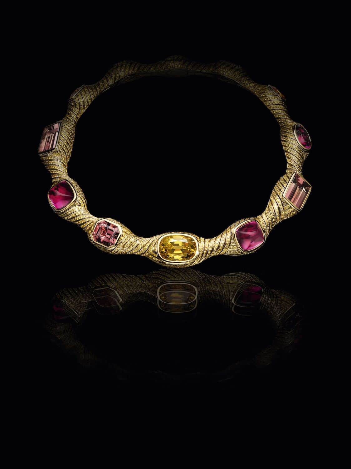 The transition to The World of Creativity is marked by Connection, symbolizing fluidity and imagination with a breathtaking diamond-and-pearl necklace. The narrative progresses through themes like Motion, with wave-inspired sapphire designs, and Florescence, where vivid colors and forms bloom into life. Another standout is Joy, a radiant combination of yellow sapphires and pink tourmalines, infused with Louis Vuitton’s signature rope motif. Finally, Aura and Eternal Sun encapsulate the journey’s end. Aura dazzles with blush-toned tourmalines and celestial LV Monogram flowers, while Eternal Sun celebrates creativity with vibrant yellow diamonds.