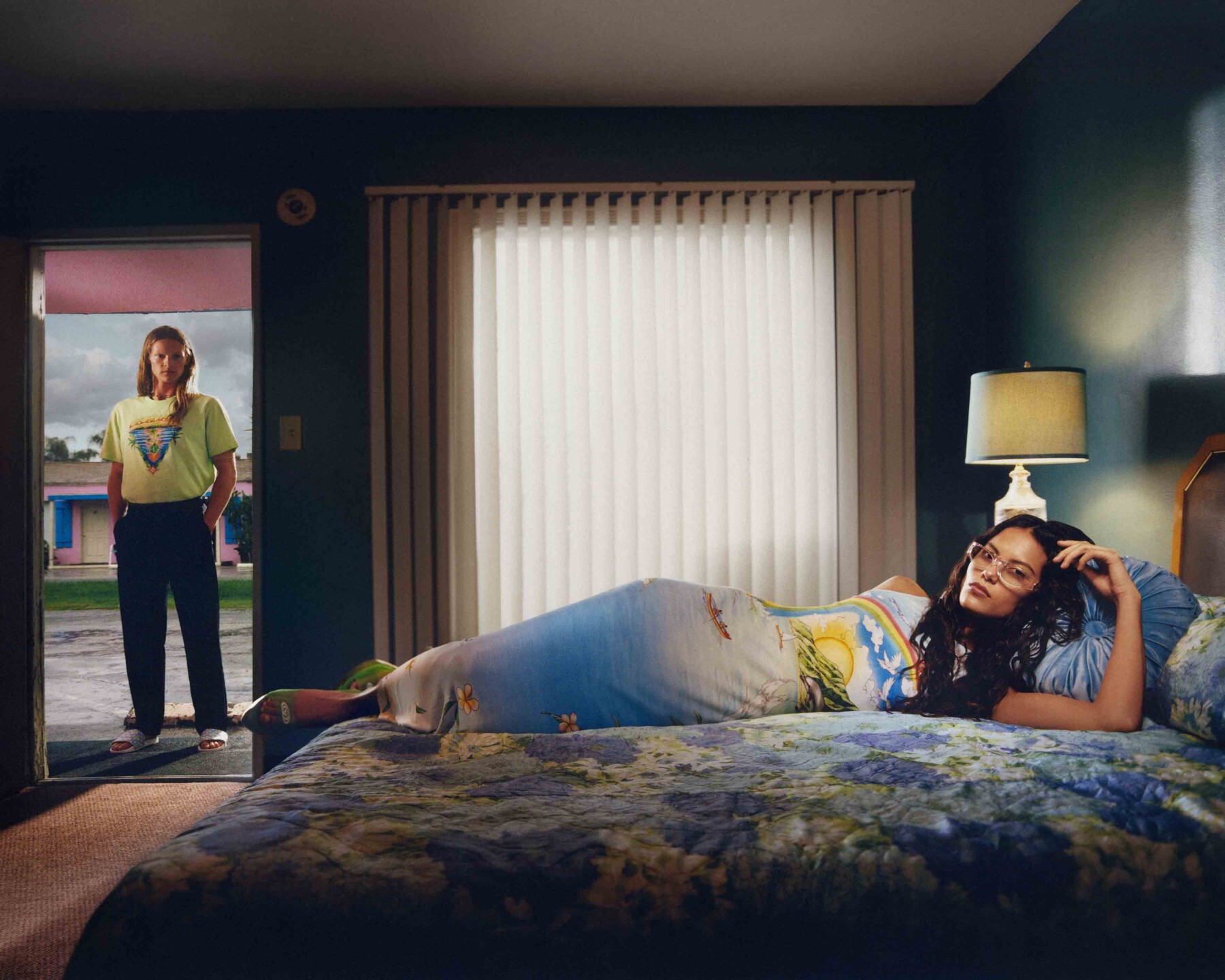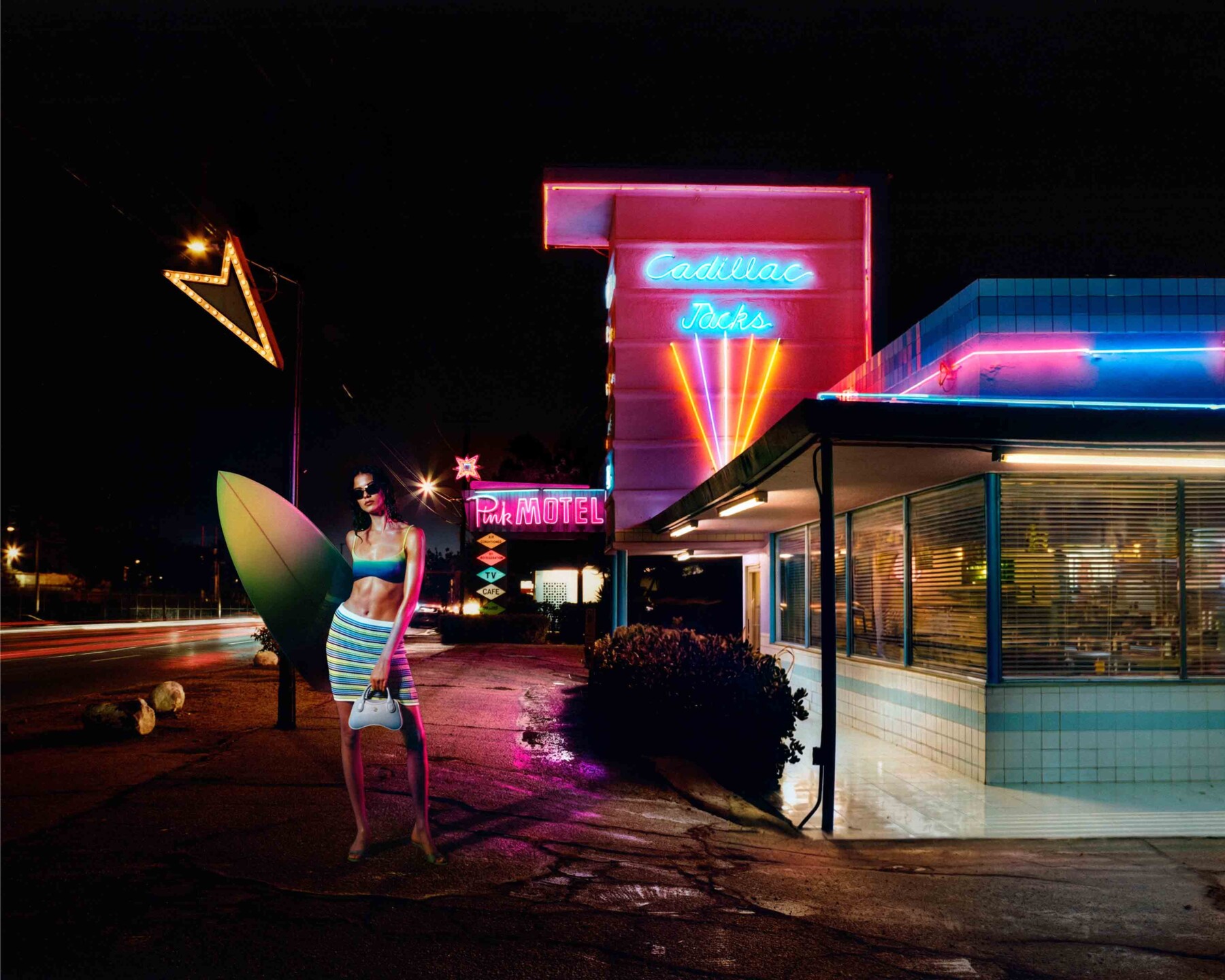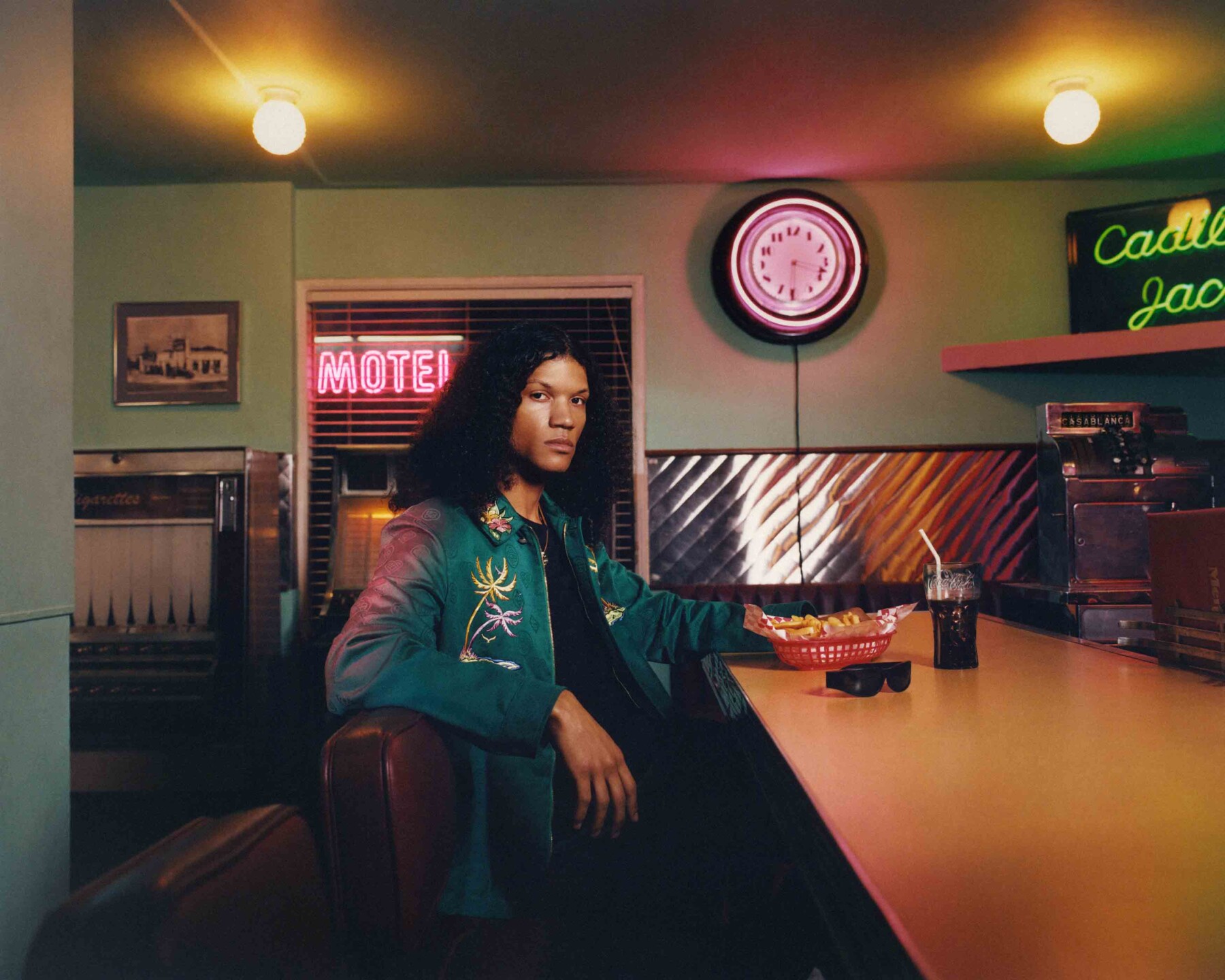 After dropping a Los Angeles-inspired campaign starring Iris Law last week. Casablanca is back with another California-infused series of imagery. Called Casablanca Beach Club, the photos draw from skate and surf culture and are set at the Pink Motel, a common film location. Shot by Corentin Leroux and Myles Hendrik and starring the likes of Zoe Panis, Luke Champion, Grayson Harivel, and Antonio Macek, the series of cinematic shots span from the rooms themselves to the parking lot to a 1950s-style diner to, naturally, a swimming pool that doubles as a skate bowl. Clad in graphic pieces featuring lush tropical plants, you’ll find everything from knit dresses to crochet to coordinating silk sets, all ideal for a warm weather vacation. To complete the beach vibe there’s swimwear alongside terry cloth towel-style separates, and even a surfboard. Consider your next holiday wardrobe sorted.