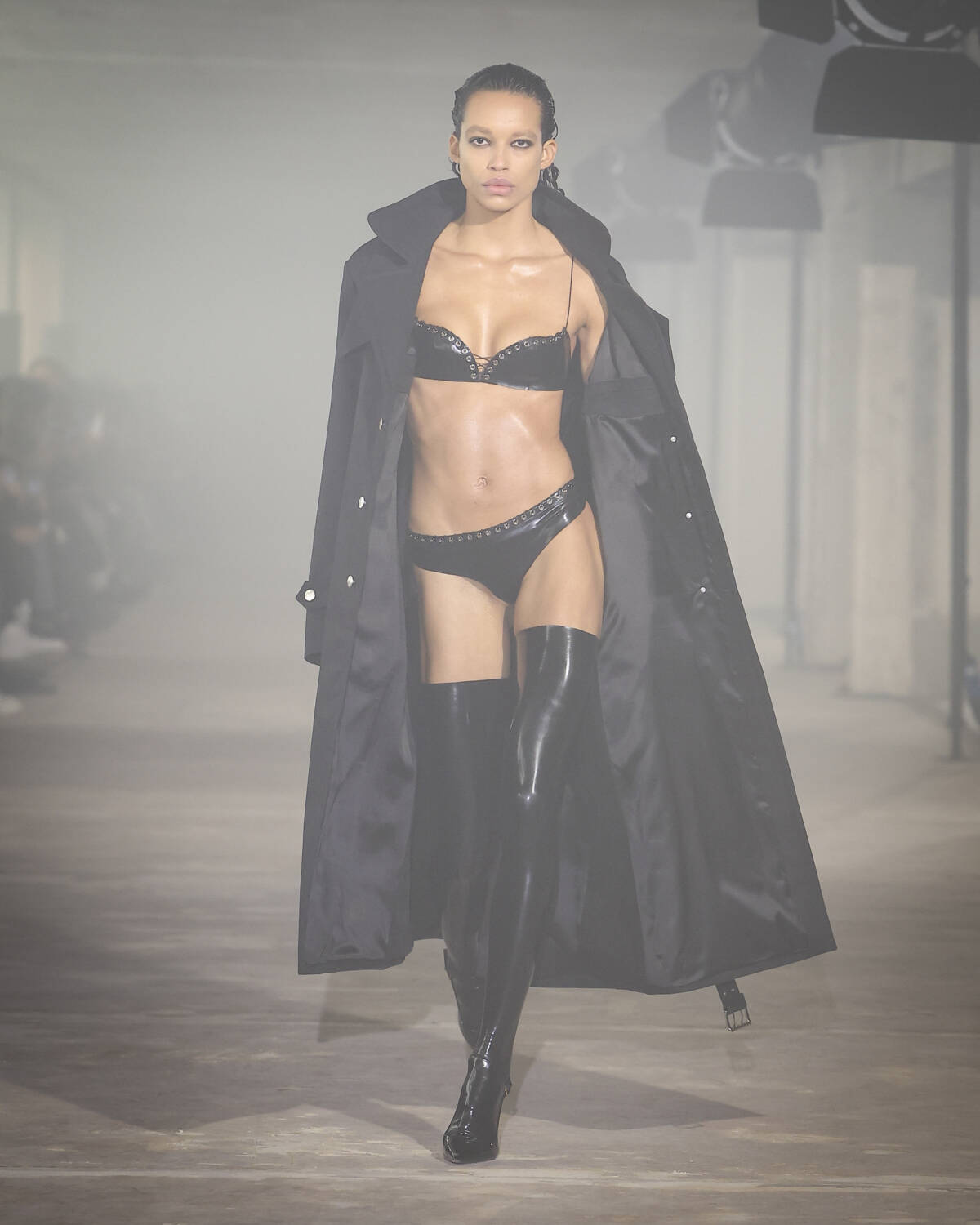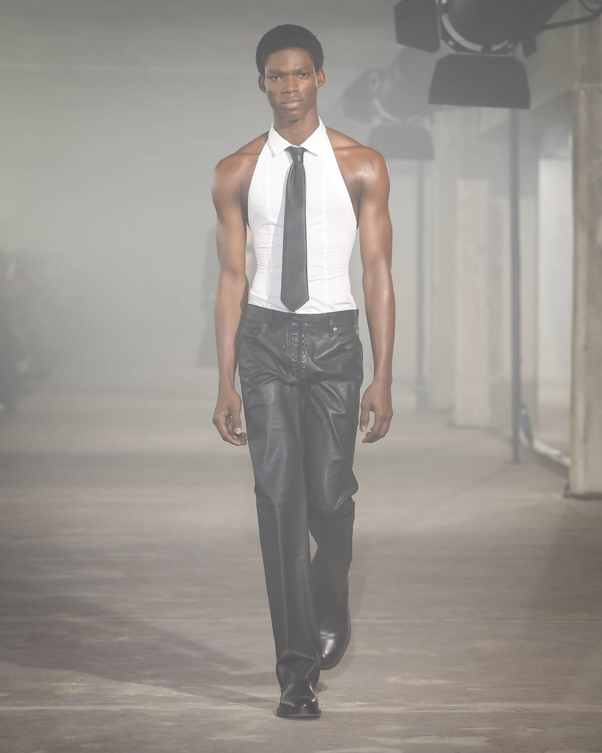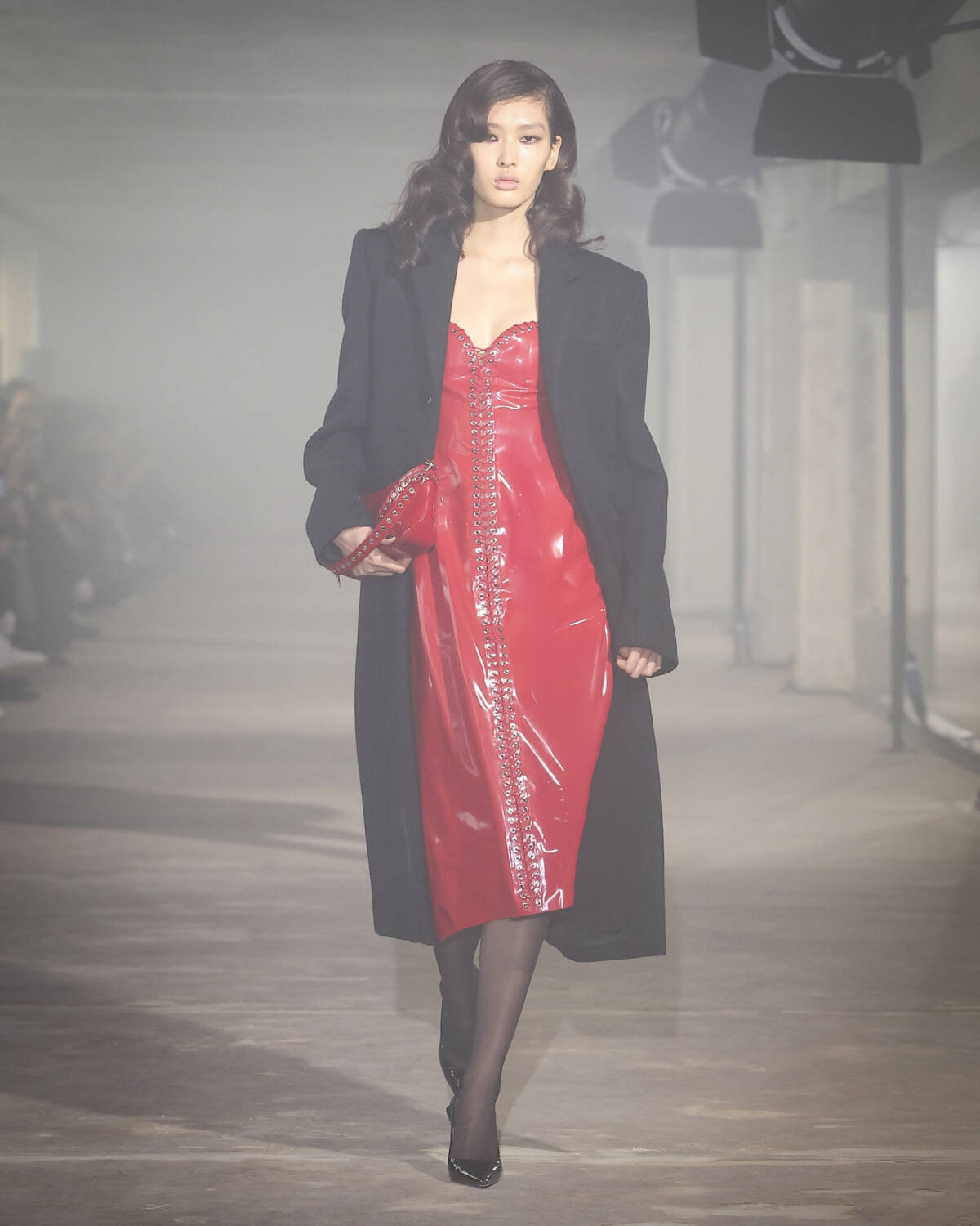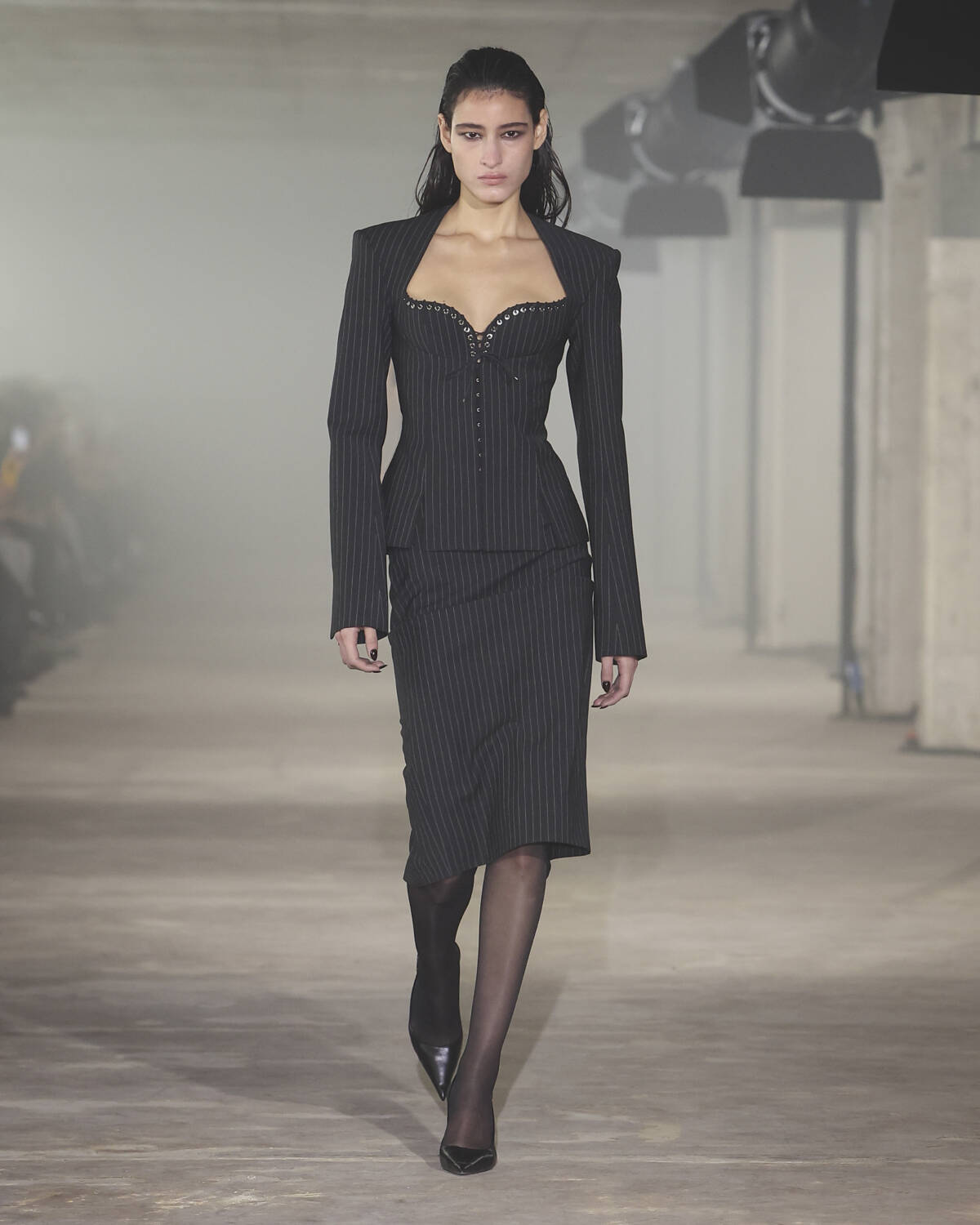 Pinstripe skirts, body-hugging dresses and latex creations played with the tension between authority and allure. Front-laced closures brought a severity that could easily shift from boardroom to dungeon. Modest shirts were peeled back to reveal risqué halters, turning daytime restraint into late-night temptation.