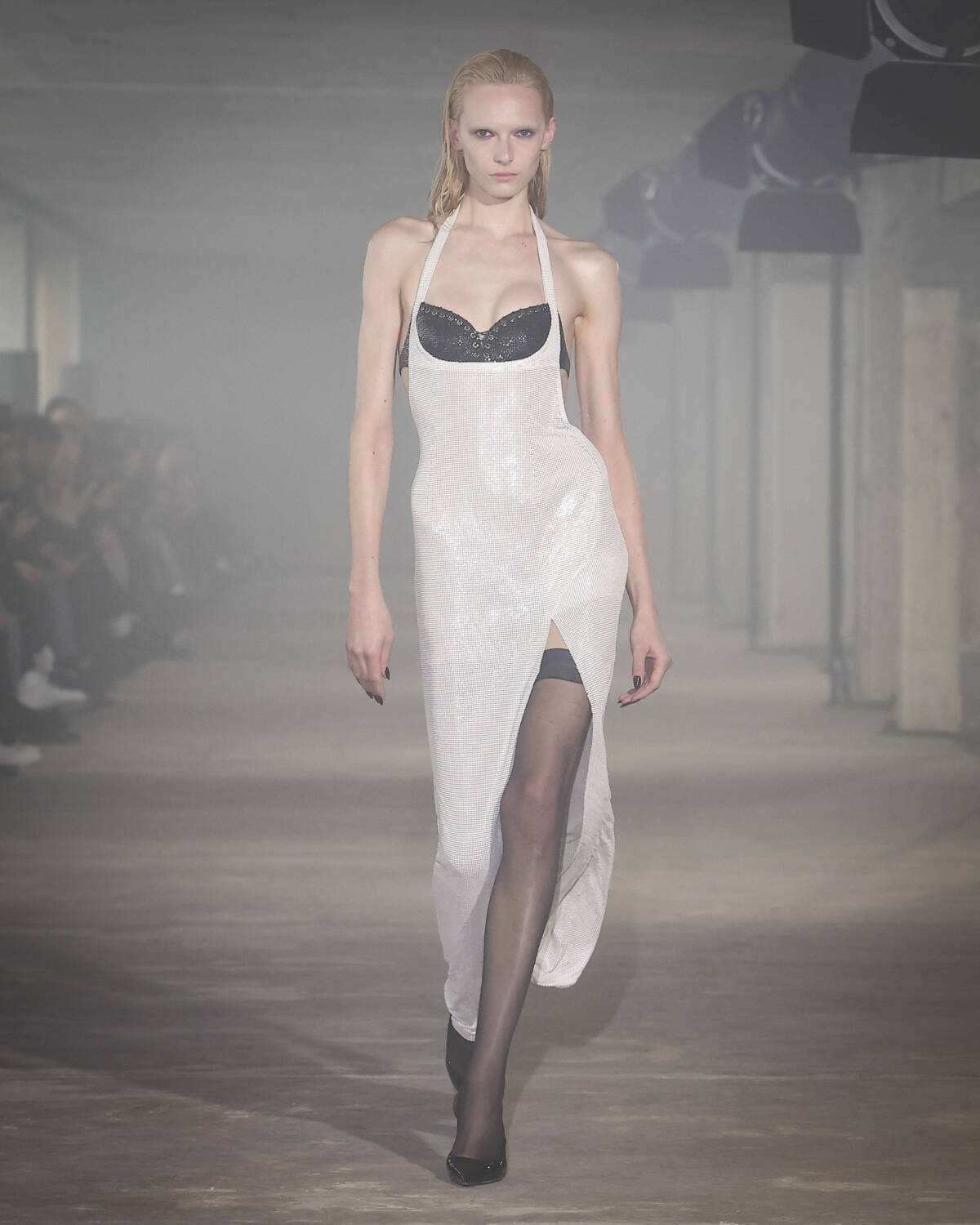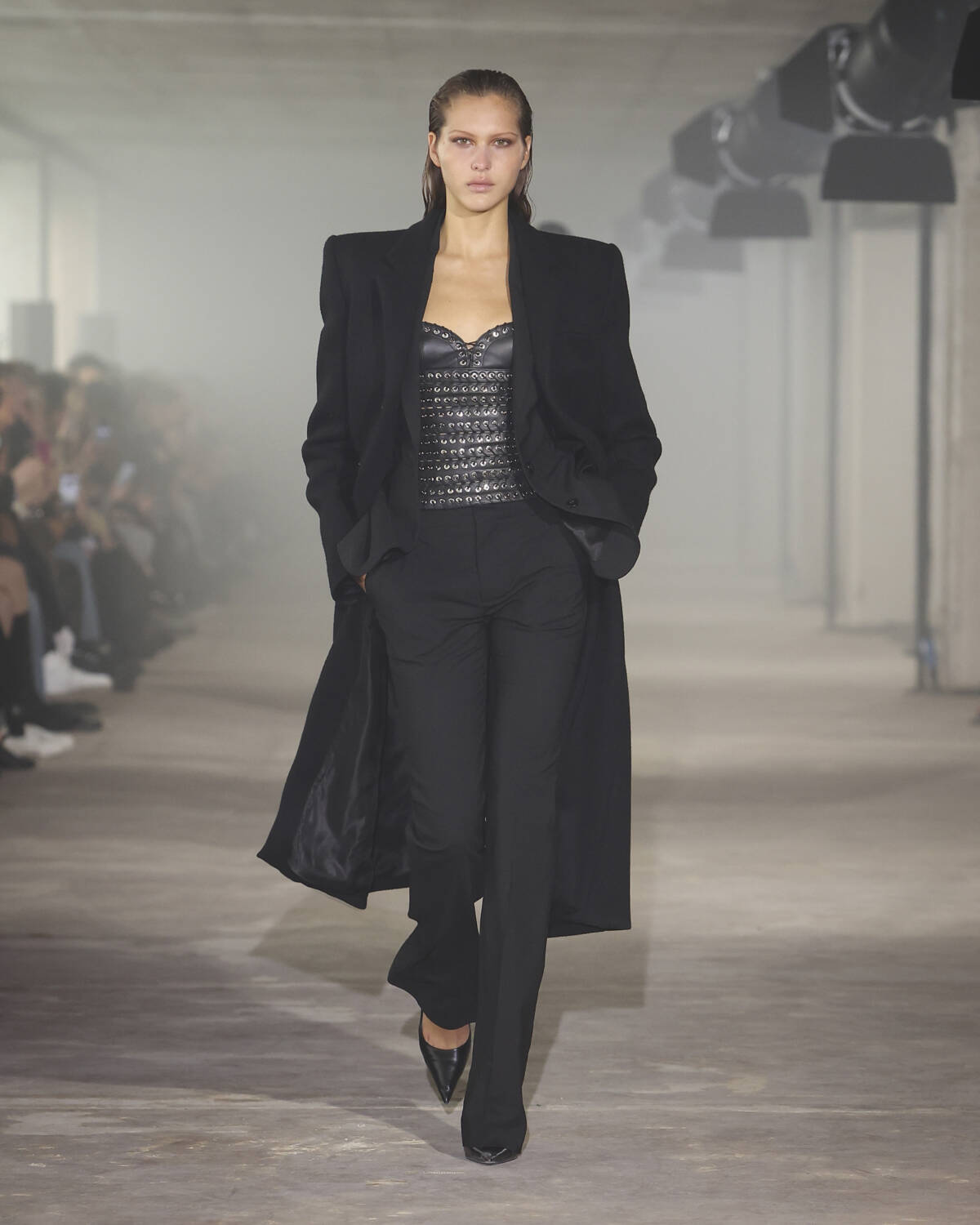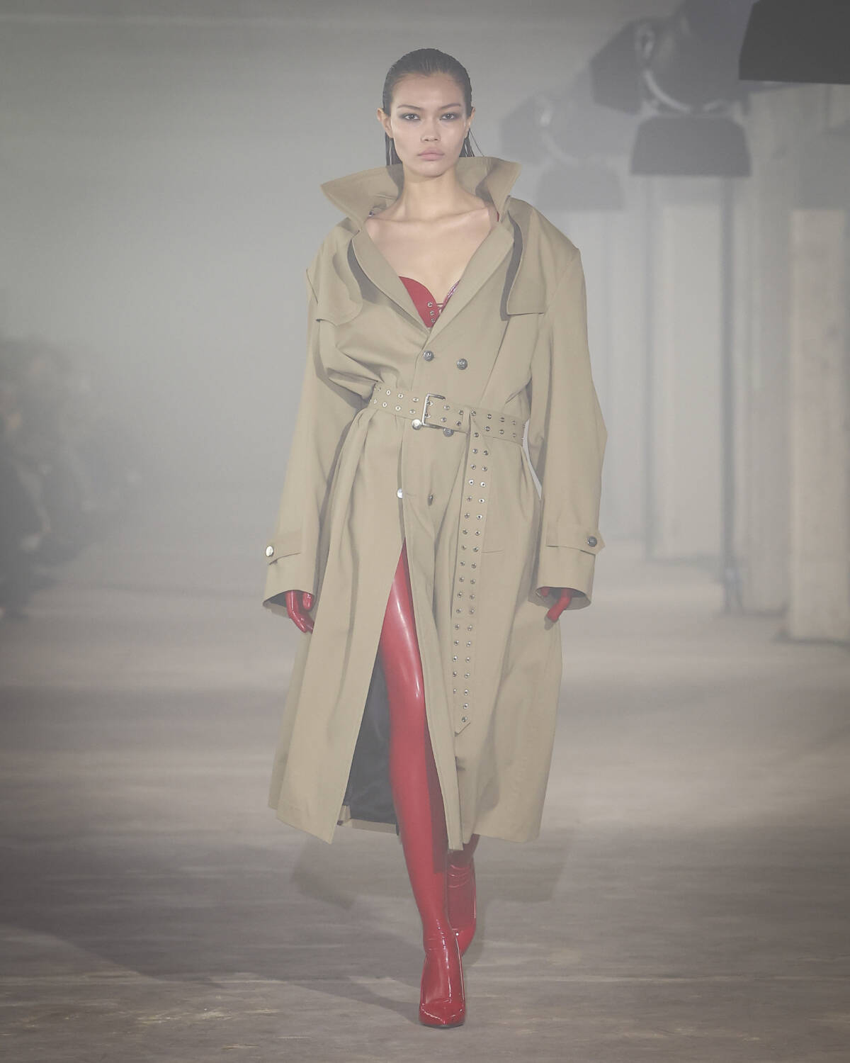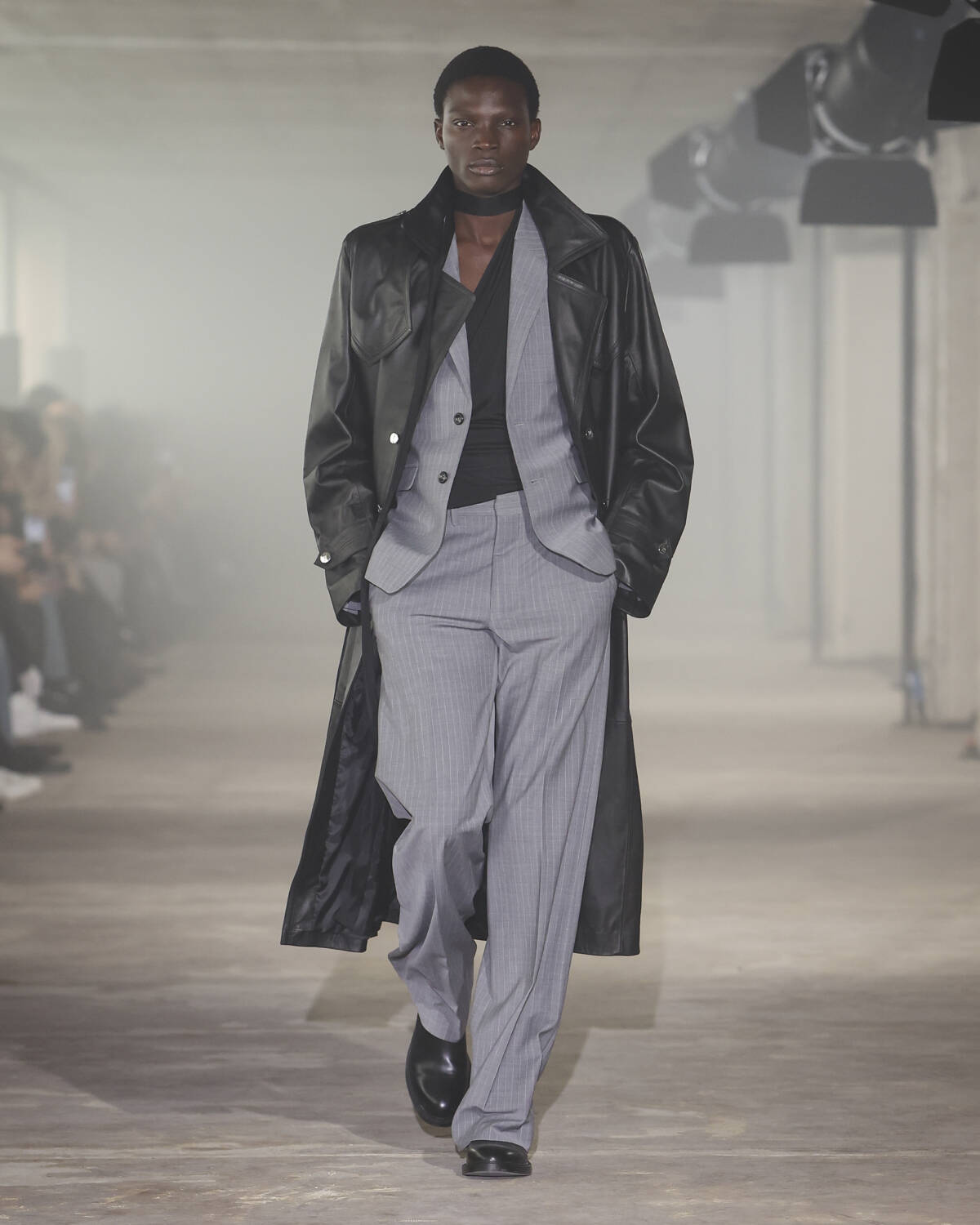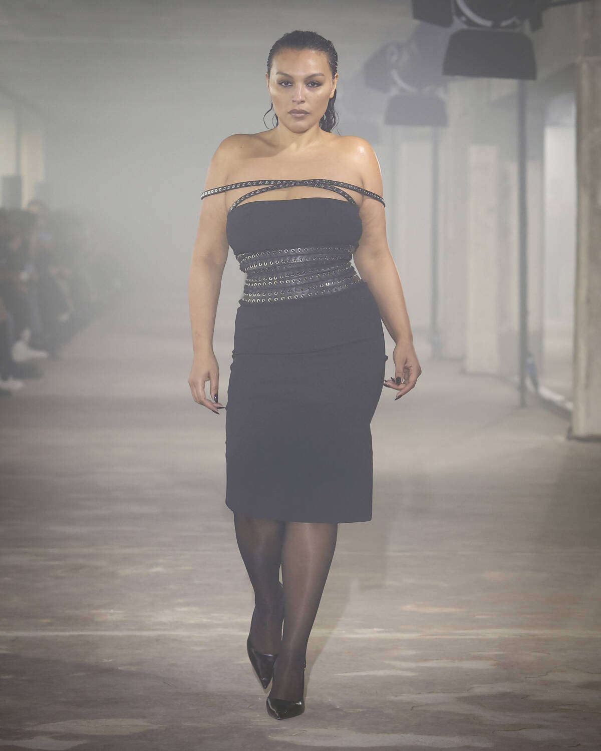 Pinstripe skirts, body-hugging dresses and latex creations played with the tension between authority and allure. Front-laced closures brought a severity that could easily shift from boardroom to dungeon. Modest shirts were peeled back to reveal risqué halters, turning daytime restraint into late-night temptation.