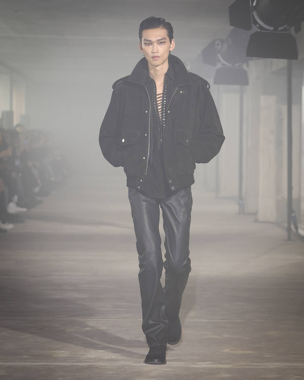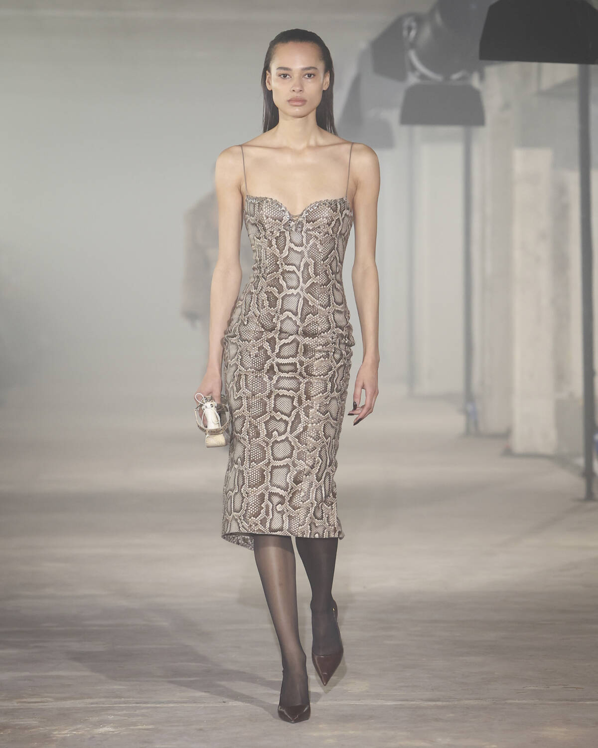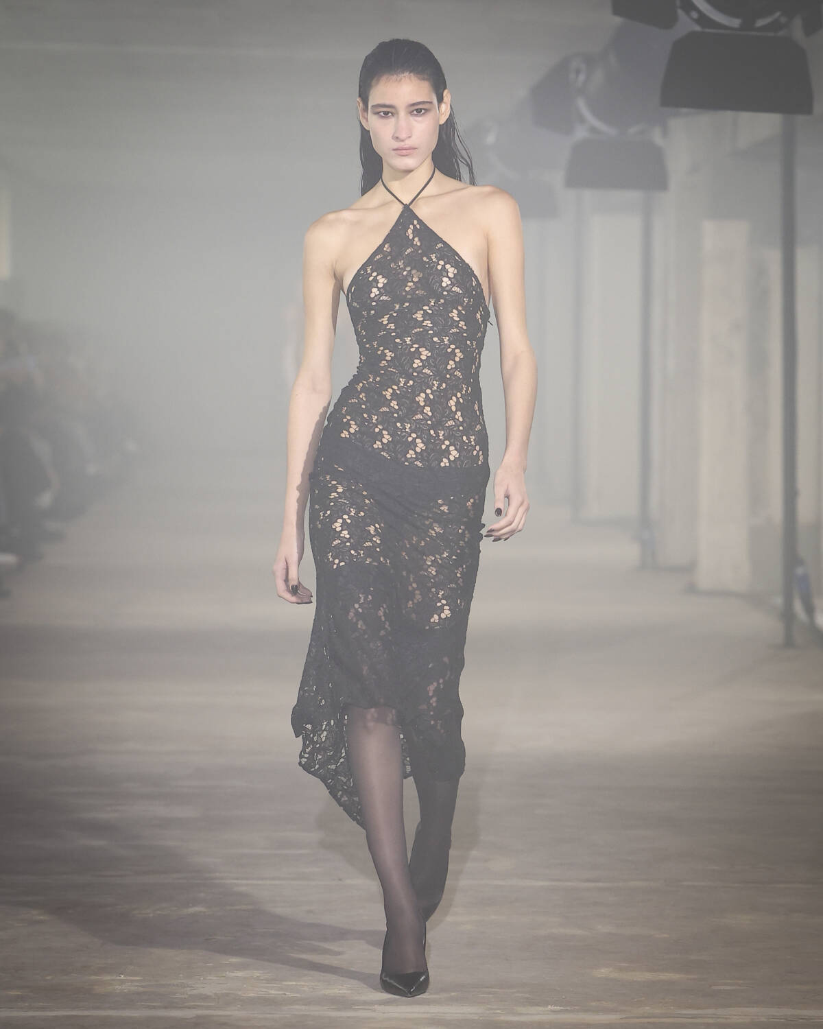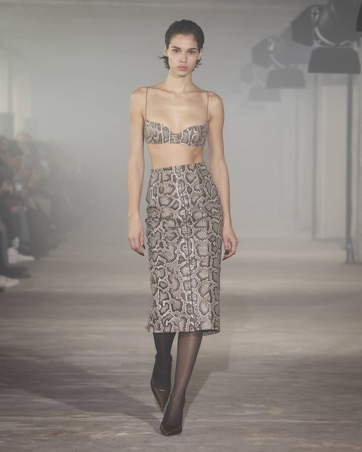 Pinstripe skirts, body-hugging dresses and latex creations played with the tension between authority and allure. Front-laced closures brought a severity that could easily shift from boardroom to dungeon. Modest shirts were peeled back to reveal risqué halters, turning daytime restraint into late-night temptation.
