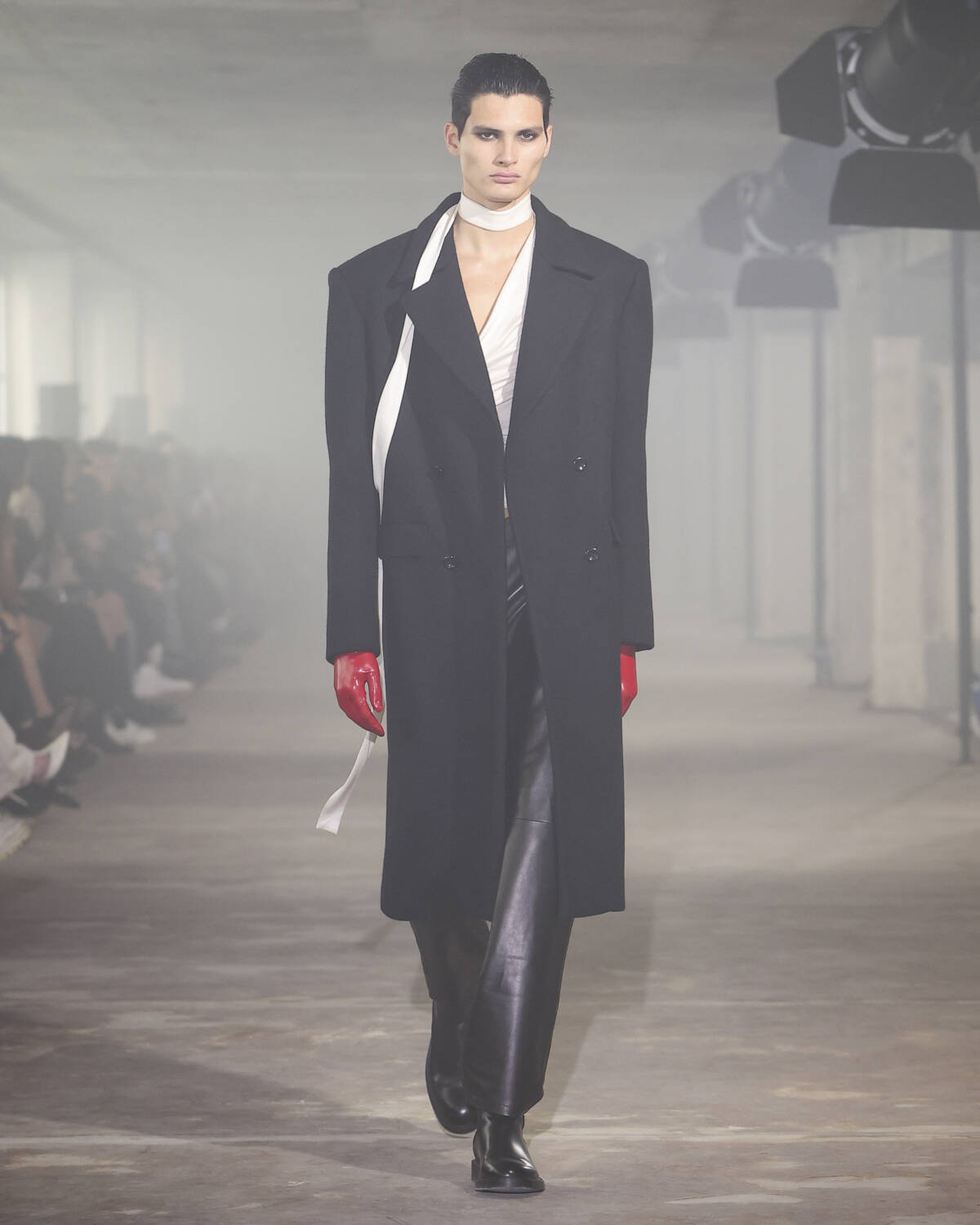 Ludovic de Saint Sernin’s L’Entretien collection for AW25 was a sharp, unapologetic collision of power dressing and raw sensuality. Models strode in bold-shouldered suits and cashmere-blend coats – the unmistakable marks of 9-to-5. But look closer, and the after-hours spirit was undeniable: peekaboo leather micro-dresses and rubber-clad calves hinted at a wilder side beneath the corporate shell. This was business with a devilish twist.