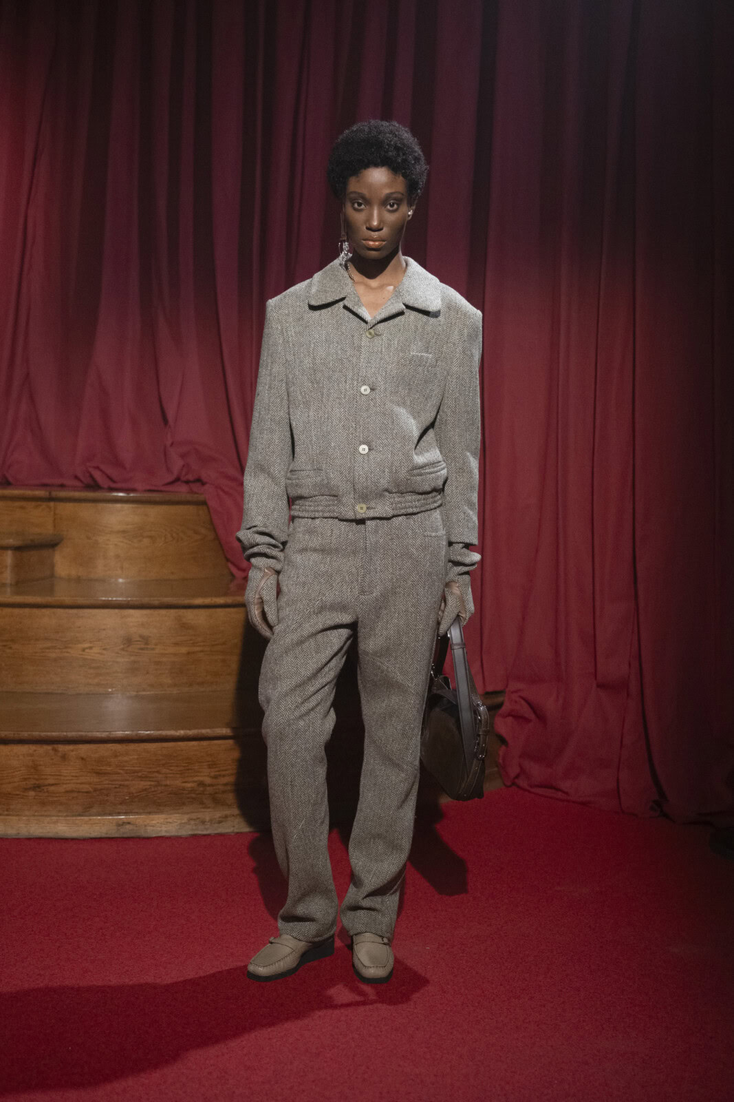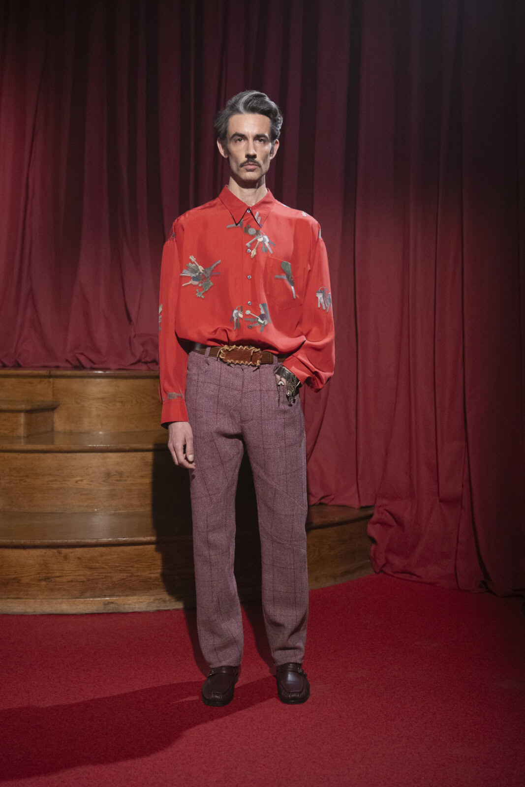 Fabric did much of the talking. Tartan – folksy and familiar – was draped generously, while tropical polyester appeared reworked with dense, shearling-like finishes that added weight and texture. Shetland, Harris tweed and mohair grounded the collection, lit up by jolts of colour in ’90s-leaning tailoring and twin sets that leaned more restless than refined. Prints of crystal glasses and jangling keys on silk shirts nodded to domestic rituals and personal space, worn lightly and without fuss.