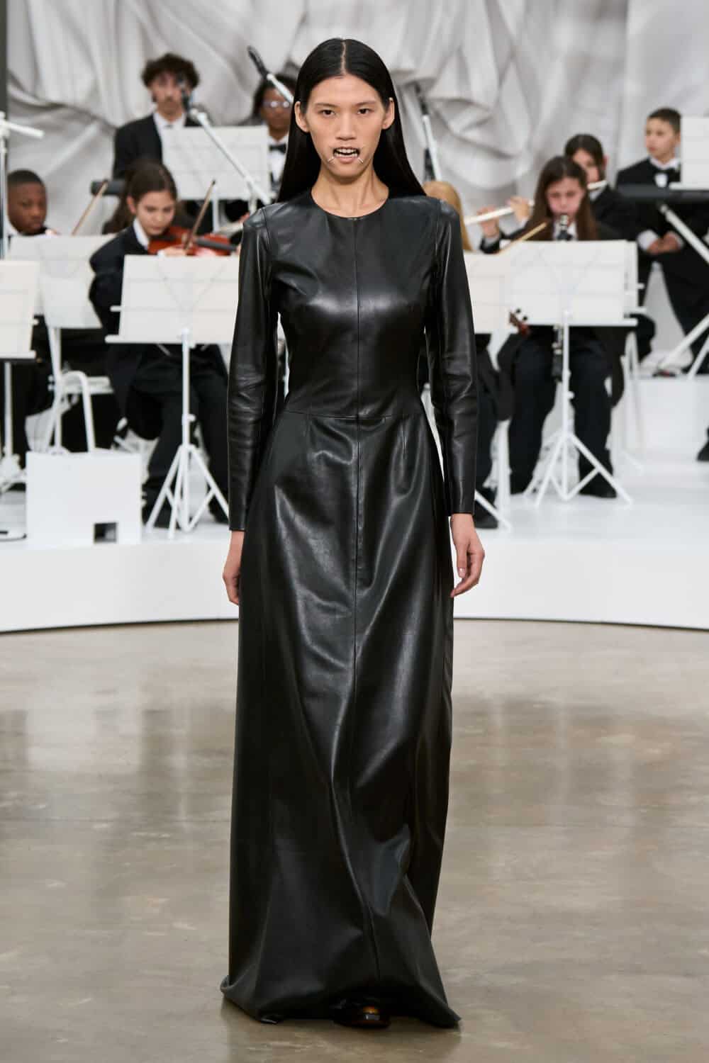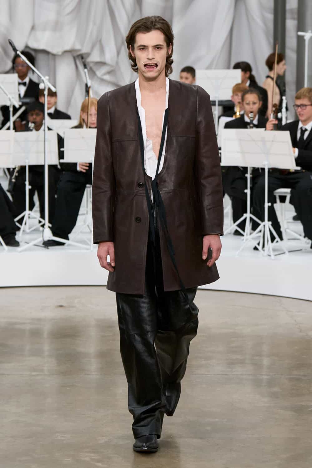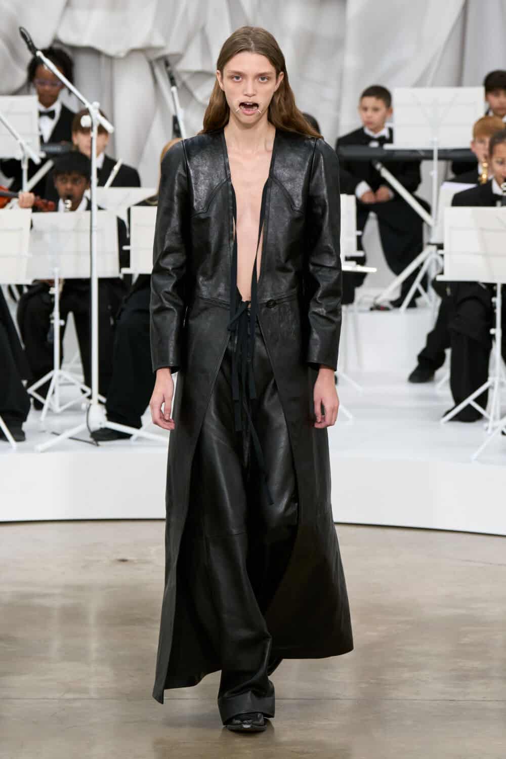 The first of those came with his approach to tailoring. Opening the show, a collarless leather coat fastened with ties, worn with nothing but a pair of leather jeans, the coat was modelled on the simple blouse blanche that is the uniform of everyone who works at the house. Cut like a scooping tuxedo waistcoat at the front, it also bore the new Margiela shoulder construction, sharply rounded with a dart, with the armhole tracing the line of the socket. That same tuxedo front and shoulder shape appeared across mens and women’s pieces in leather, wool and especially denim. McQueen had a signature shoulder shape, so did Saint Laurent and Givenchy so why not Glenn? It showed Martens is serious about silhouette and the importance of tailoring to this house.