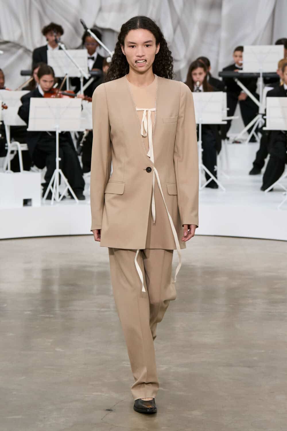 But before we talk about fashion, first, a cute moment: a children’s orchestra took to the stage. Wearing black suits that were too big, they tuned up and then began, plinking, plonking and kettle drumming their way through classical hits by Strauss, Tchaikovsky and Mozart – the odd bum note added to the charm.