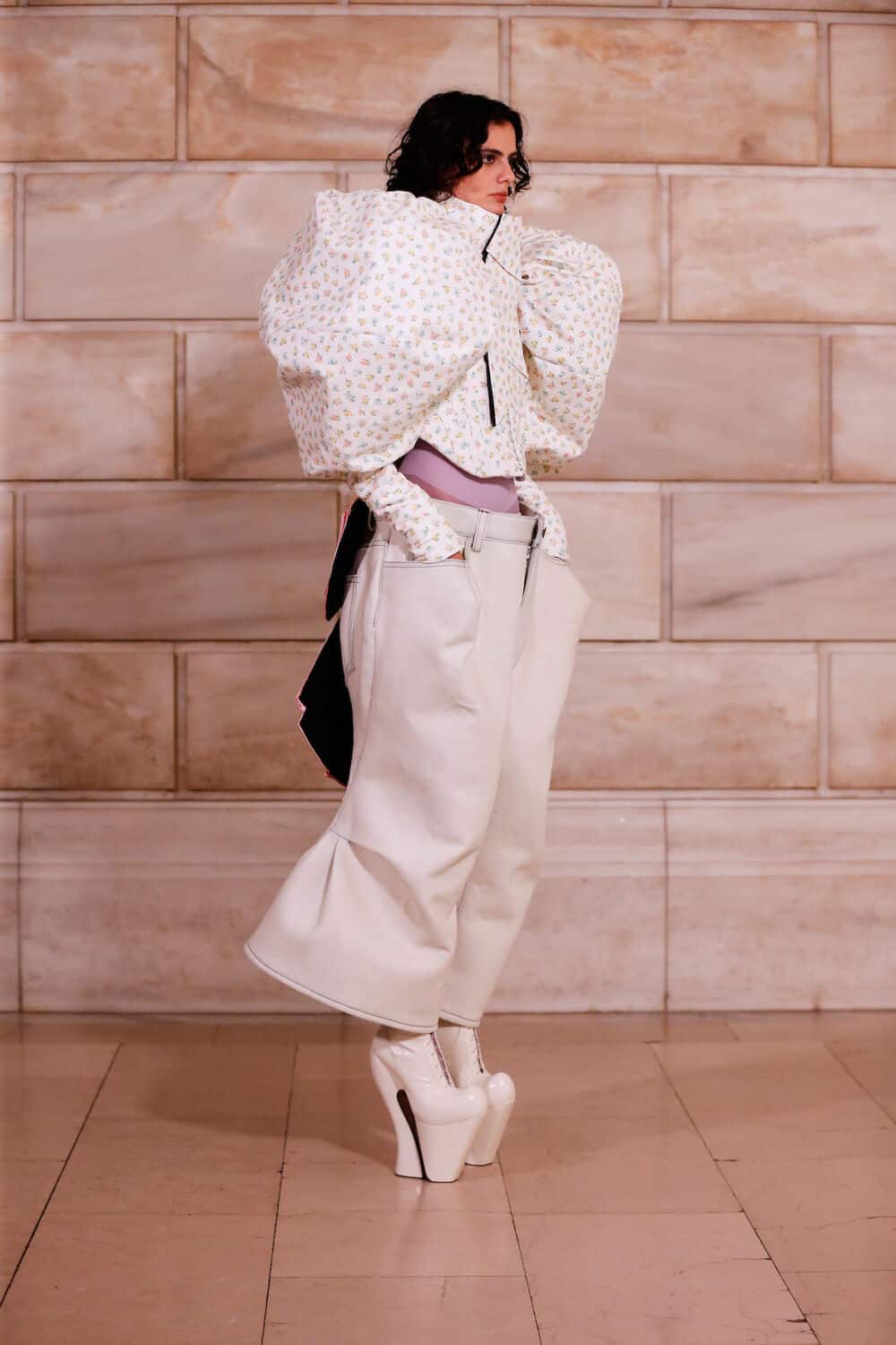 Marc Jacobs returned to the marble corridors of the New York Public Library Monday evening for a swift five-minute show that felt like stepping into a hall of mirrors. His fall 2025 collection, titled Beauty, opened with a lavender lace bodysuit featuring sleeves so dramatically puffed they resembled inflated orchids, paired with cargo pants whose volume defied practicality.