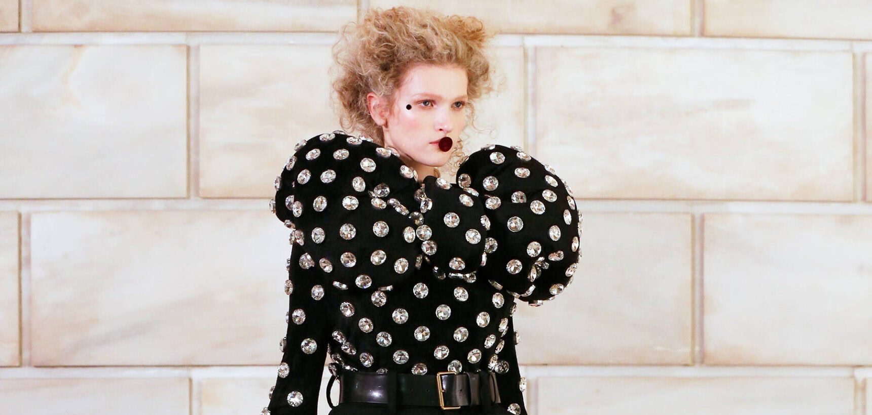 Despite being a concise, six-minute affair, the offering left a truly lasting impression thanks to its swollen silhouettes. Jacobs showcased uber-voluminous outfits that drew a parallel to Comme des Garçons’ famed Lumps and Bumps collection, emphasising exaggerated forms and challenging what’s considered traditional. That meant models – faces speckled with two-dimensional shapes courtesy of Pat McGrath – strode across the catwalk in bulbous dresses and jackets, huge structured skirts and balloon-like babydolls, atop giant platform boots with fiercely spiked and curled toes. Looks were proportioned like those of paper dolls, bouncing off of the last few seasons’ increasingly bloated collections, but this time with a more elevated, more grown-up twist: think tailored trousers, trench coats and fair isle knits all blown up with the carfree flare of a bouncy castle. To highlight the designer’s exploration of the ordinary, the final looks came in lush, red velvet fabrications with an iridescent tinge and swelled into lumpy evening gowns. As supersized as it all was, it was distinctly Jacobs in its execution.
