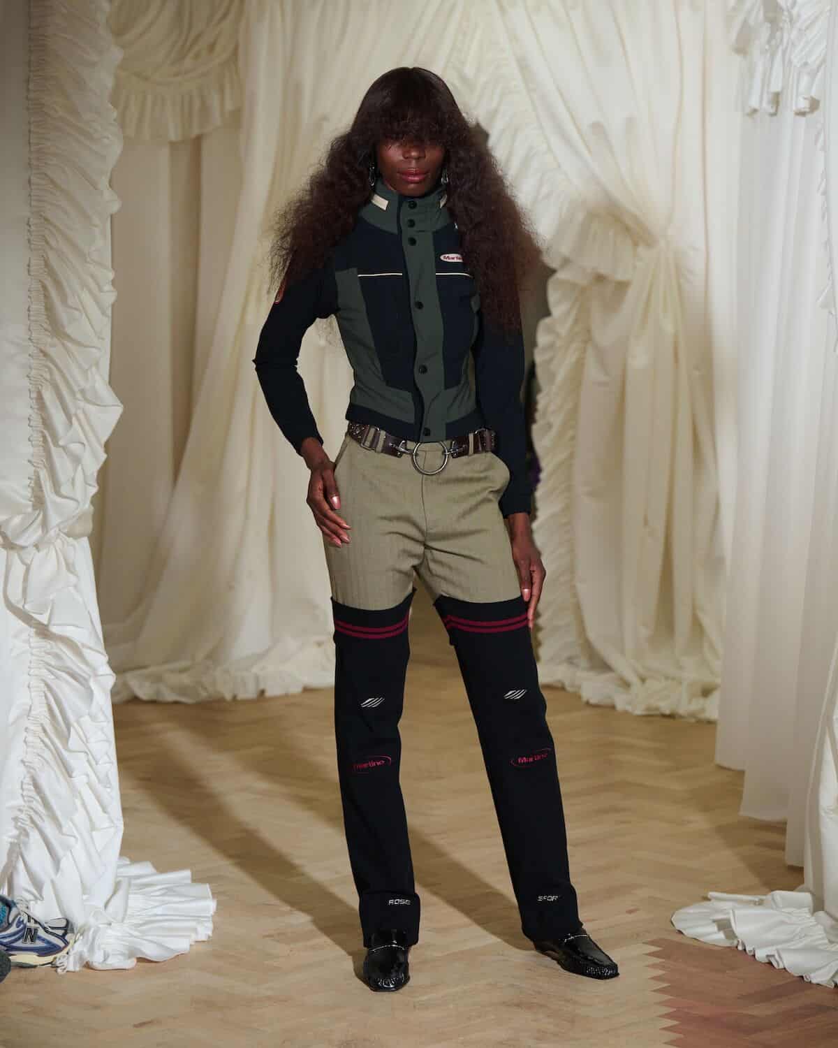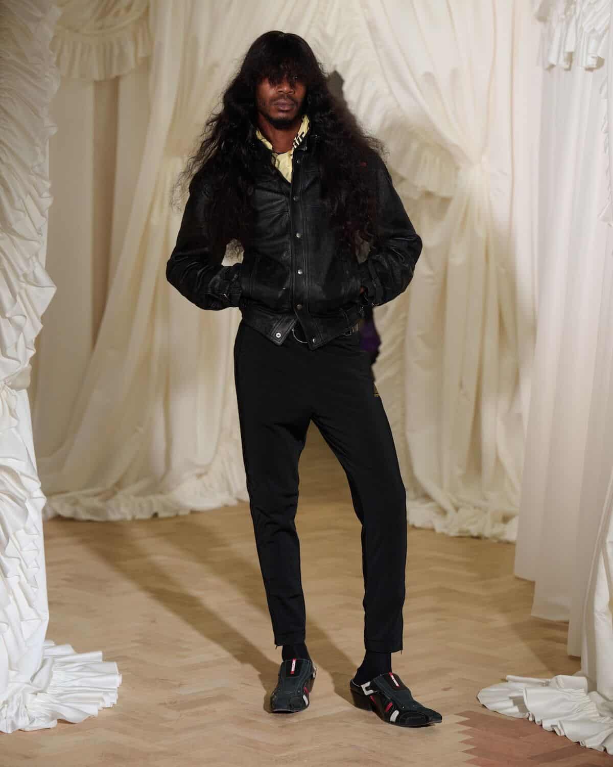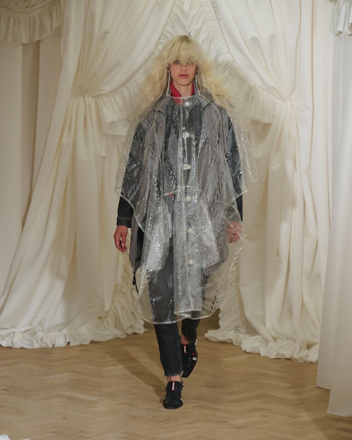 Rose joked after the show that it was her own version of the shape wear that dominates fashion today, unleashing trackie bottoms in drainpipe proportions and leather trousers with motocross knee pants that looked as if they were molded to the models’ legs. She was also thinking of the traders who are at the heart of high streets across the city, cutting ponchos to resemble barber shop capes and envisioning transparent, frilly apron skirts in homage to all those who keep inner city life moving.