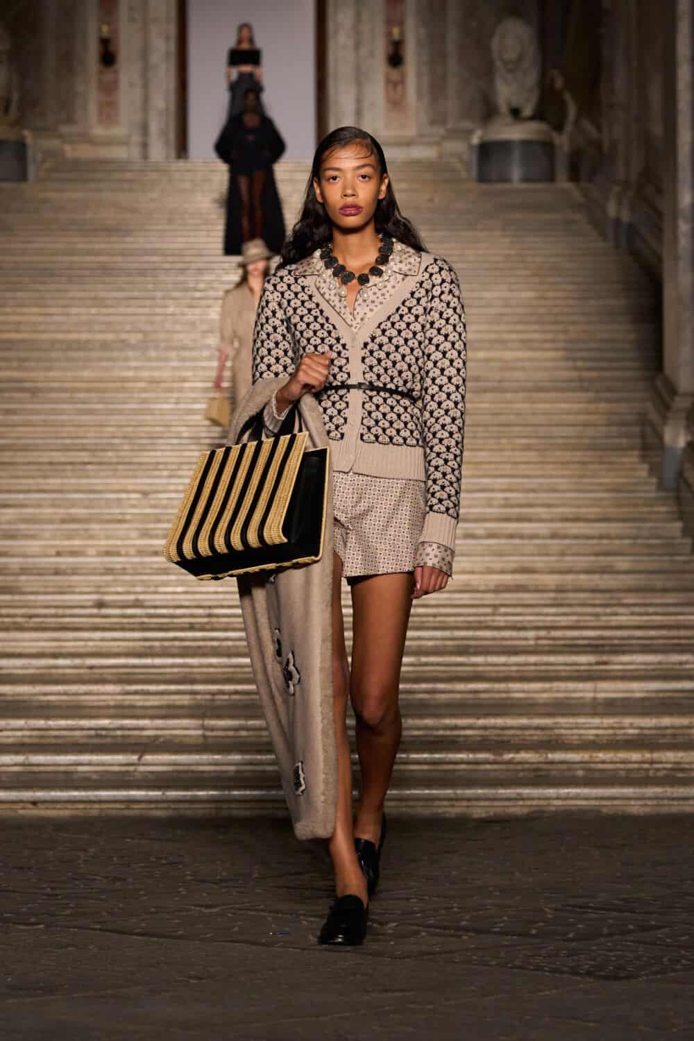 “There’s always a lightness about Italian fashion and elegance and ease of wear. They’re always clothes that you wear. They don’t wear you,” explained the designer who also collaborated with the Naples-based E. Marinella, which specializes in ties and pocket squares. He used four archive paisley fabric designs from 1951, the year Max Mara was founded, for cravats, shorts suits and flaring fifties-style skirts.