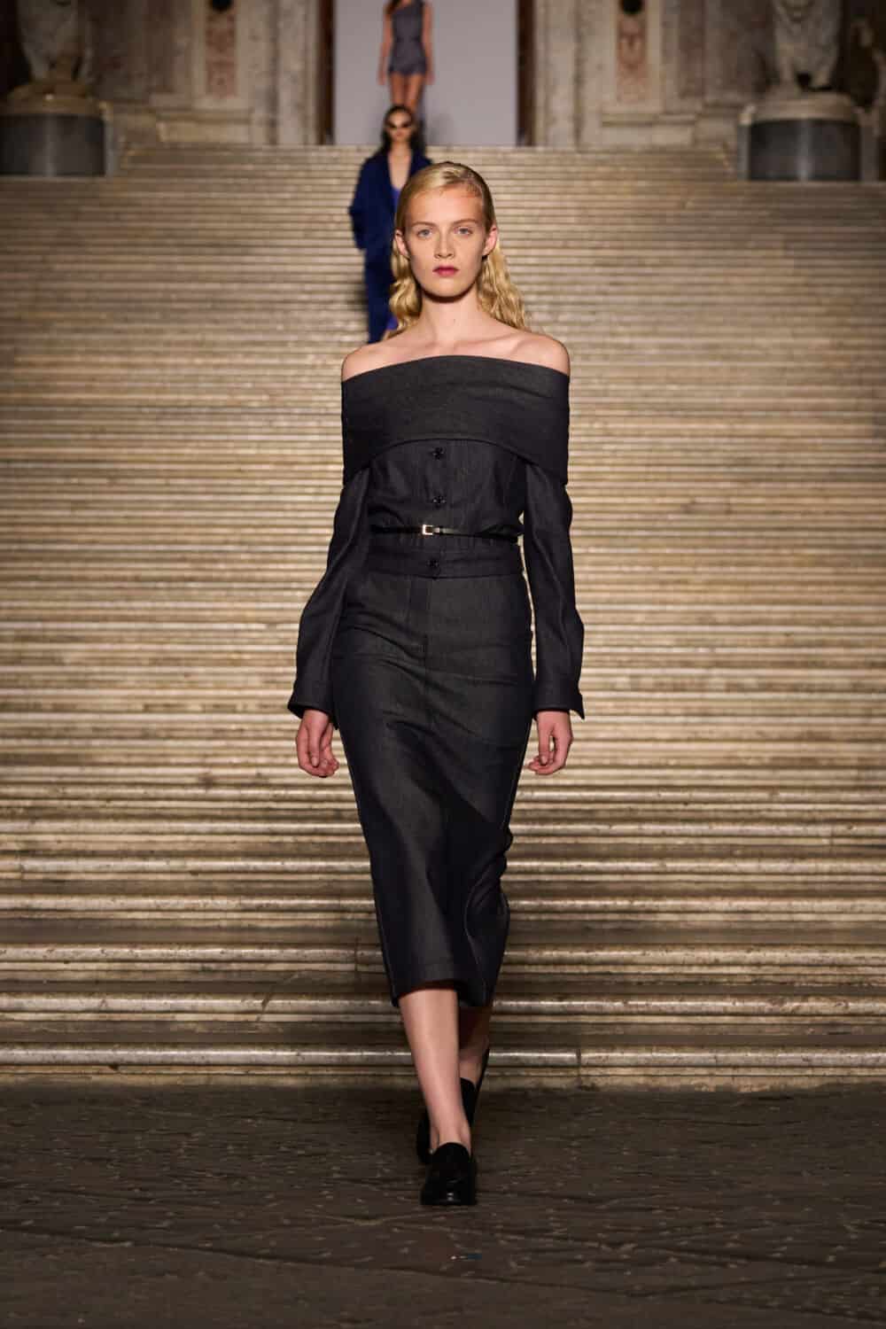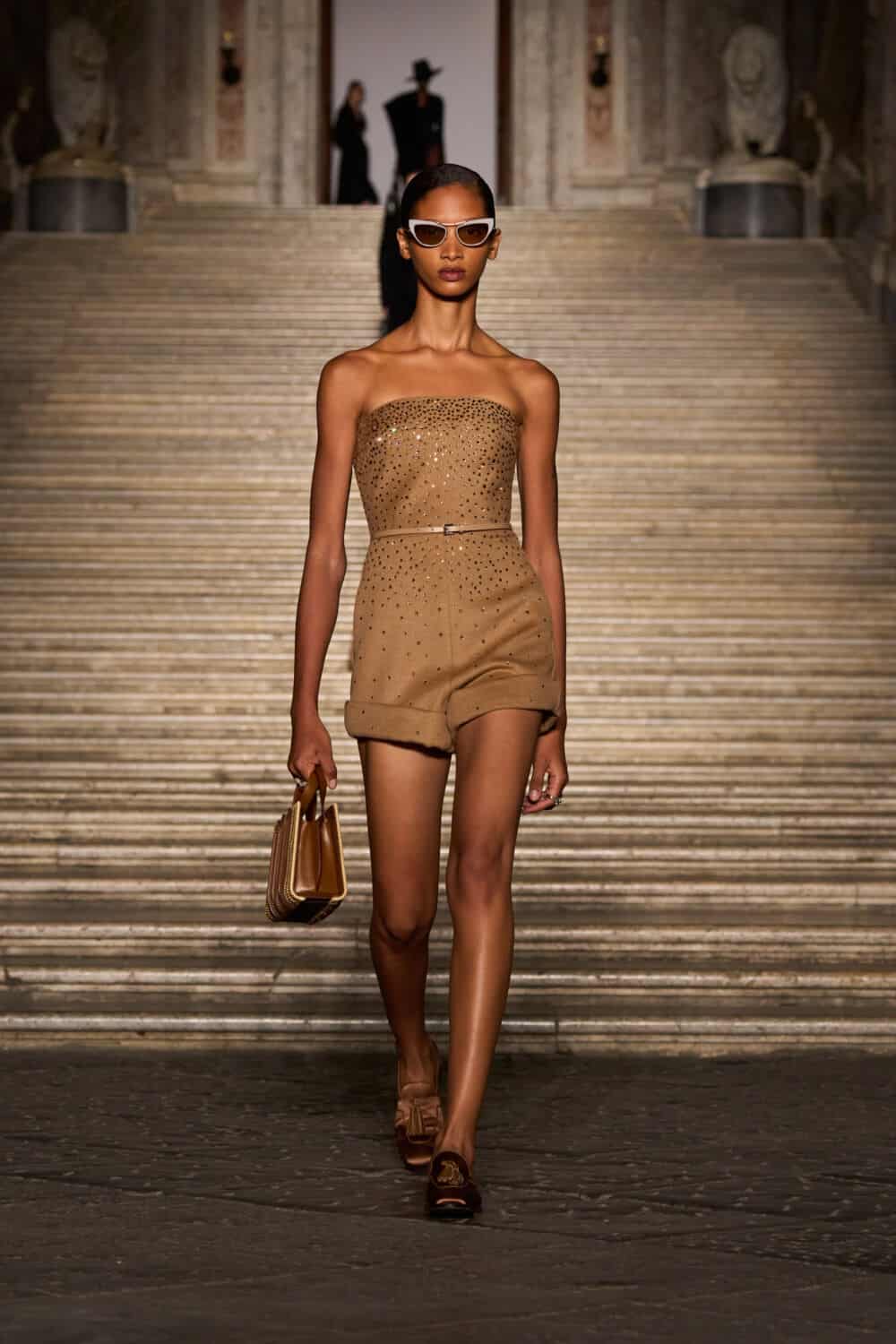 The shawl tops and matching full skirts were inspired by Ruth Orkin’s 1951 photograph American Girl in Italy. Shot the same year Max Mara was founded, it shows a girl walking down the street alone as she’s stared at by men. Twinkling crystal studded pencil dresses with a just a hint of peekaboo of corsetry played into the earthy, Italian sensuality of the collection.