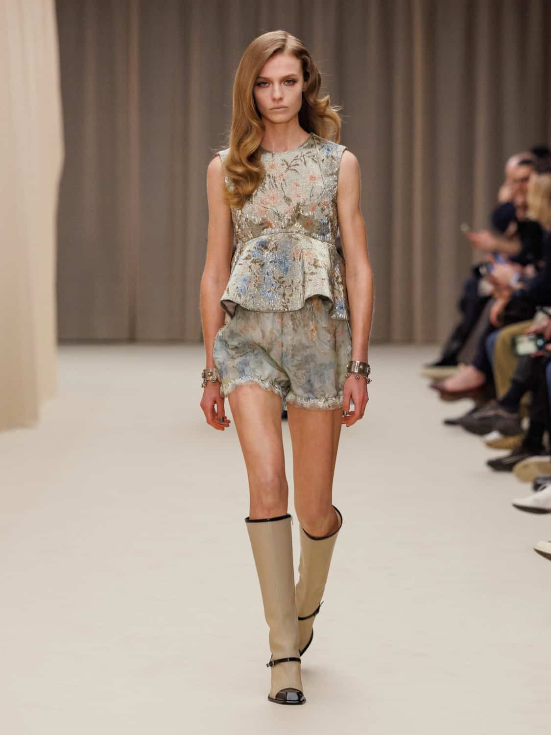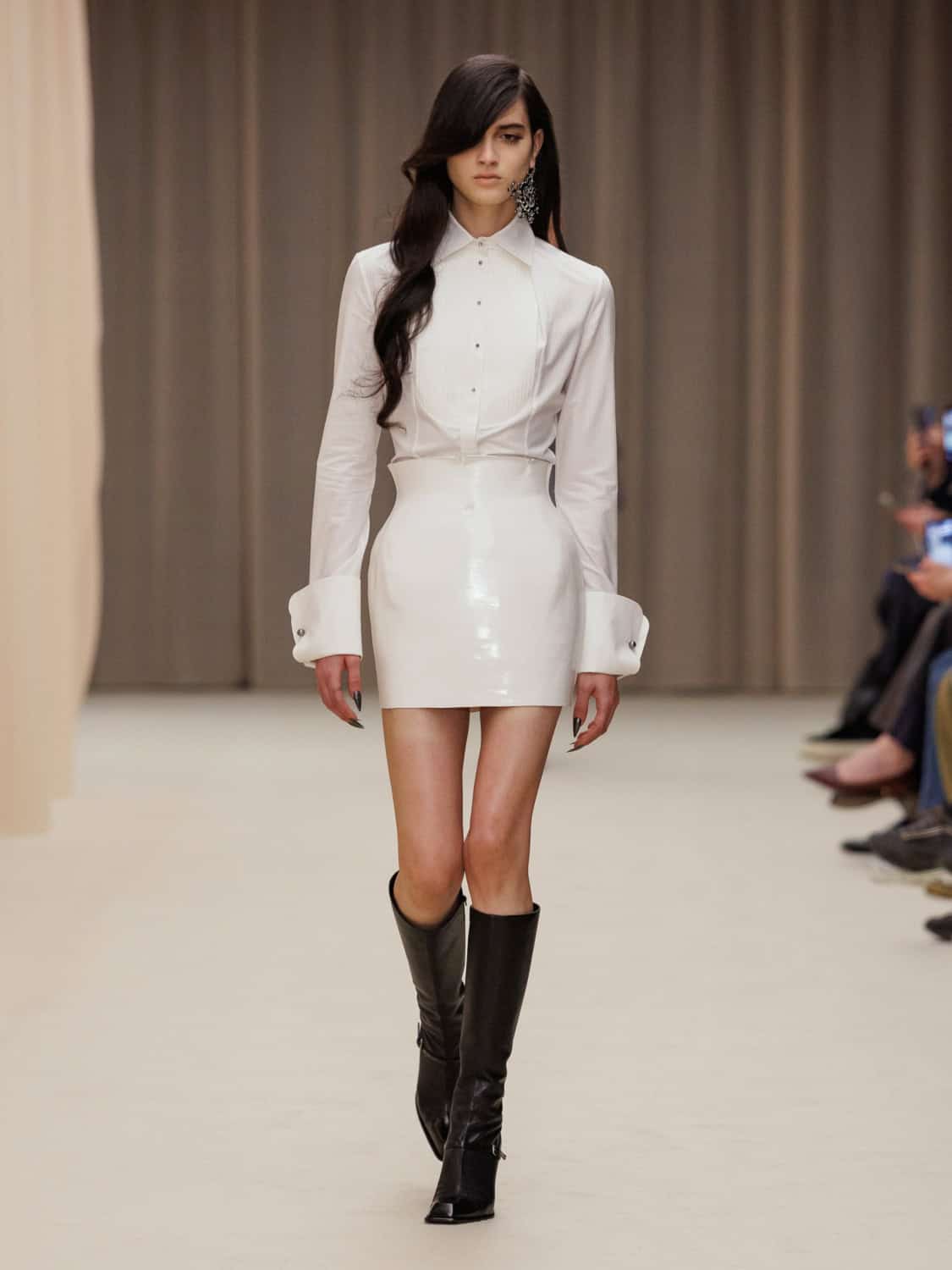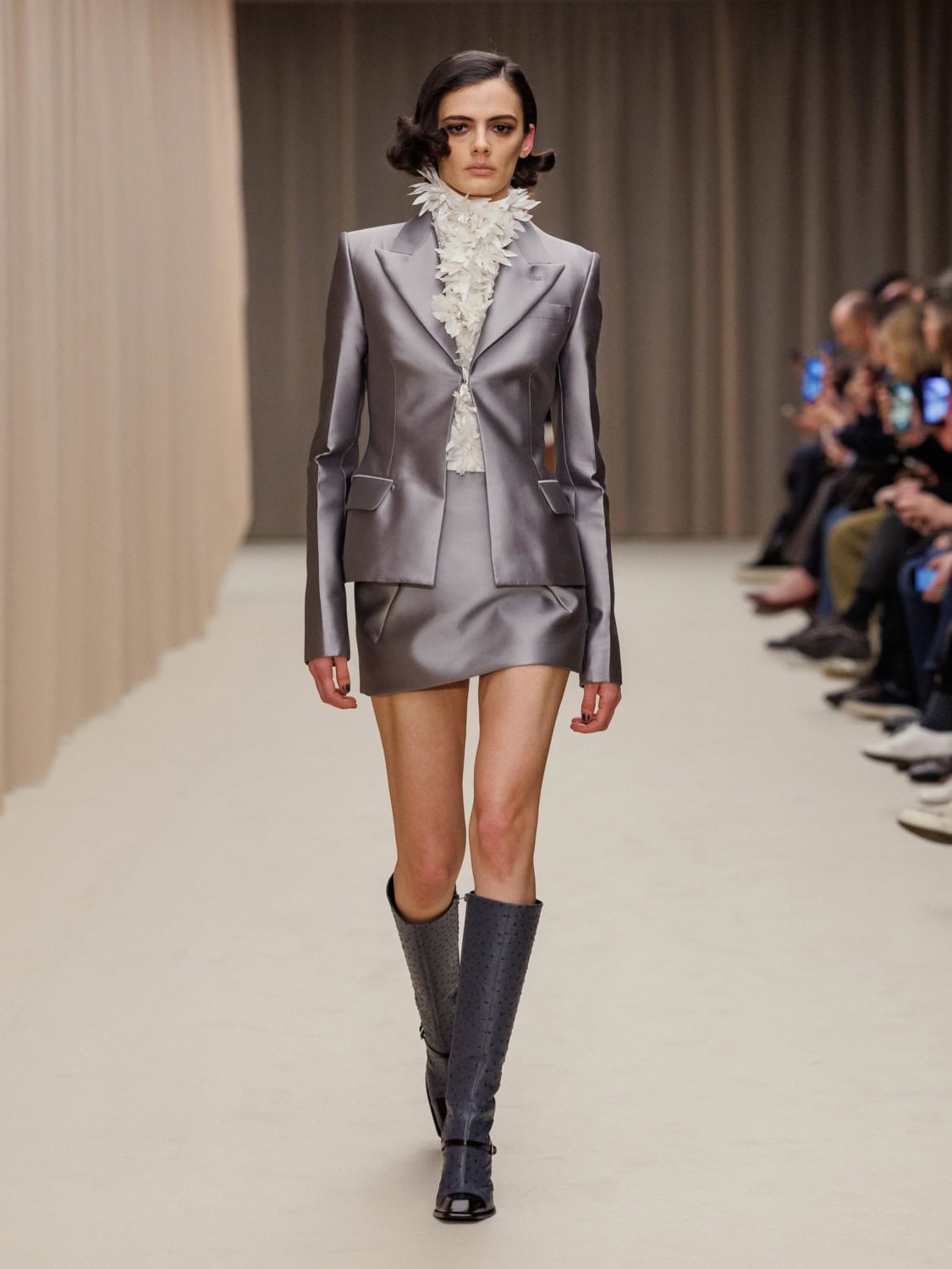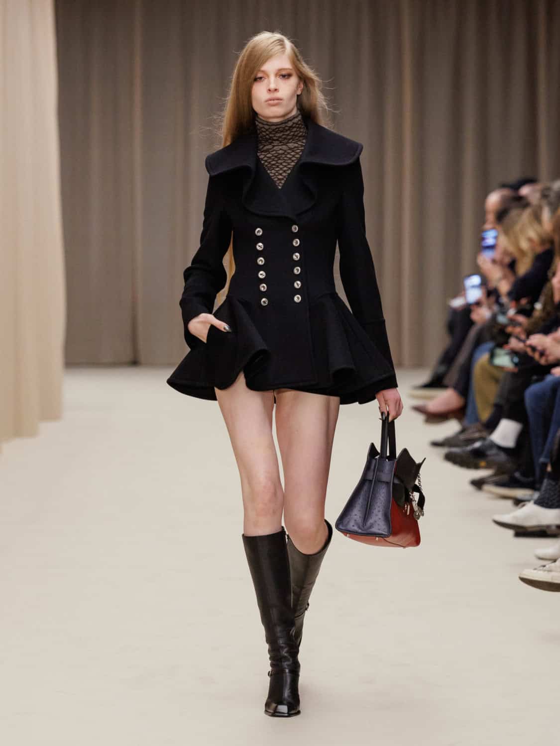 Seán McGirr at Alexander McQueen offered a new take on glamour. The designer leaned in to a softer, prettier side of the brand. The first look out set the tone: a cute, flaring mini coat dress, worn with knee boots and Sharon Tate hair. The designer had looked to Mary Quant (the originator of the miniskirt) and ‘60s noir movies.
