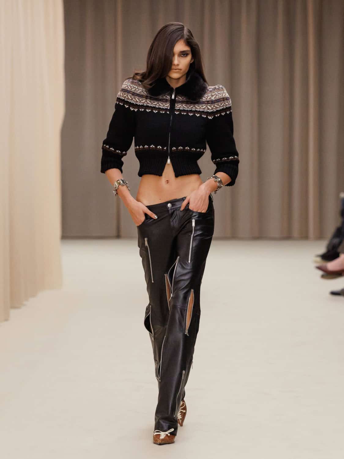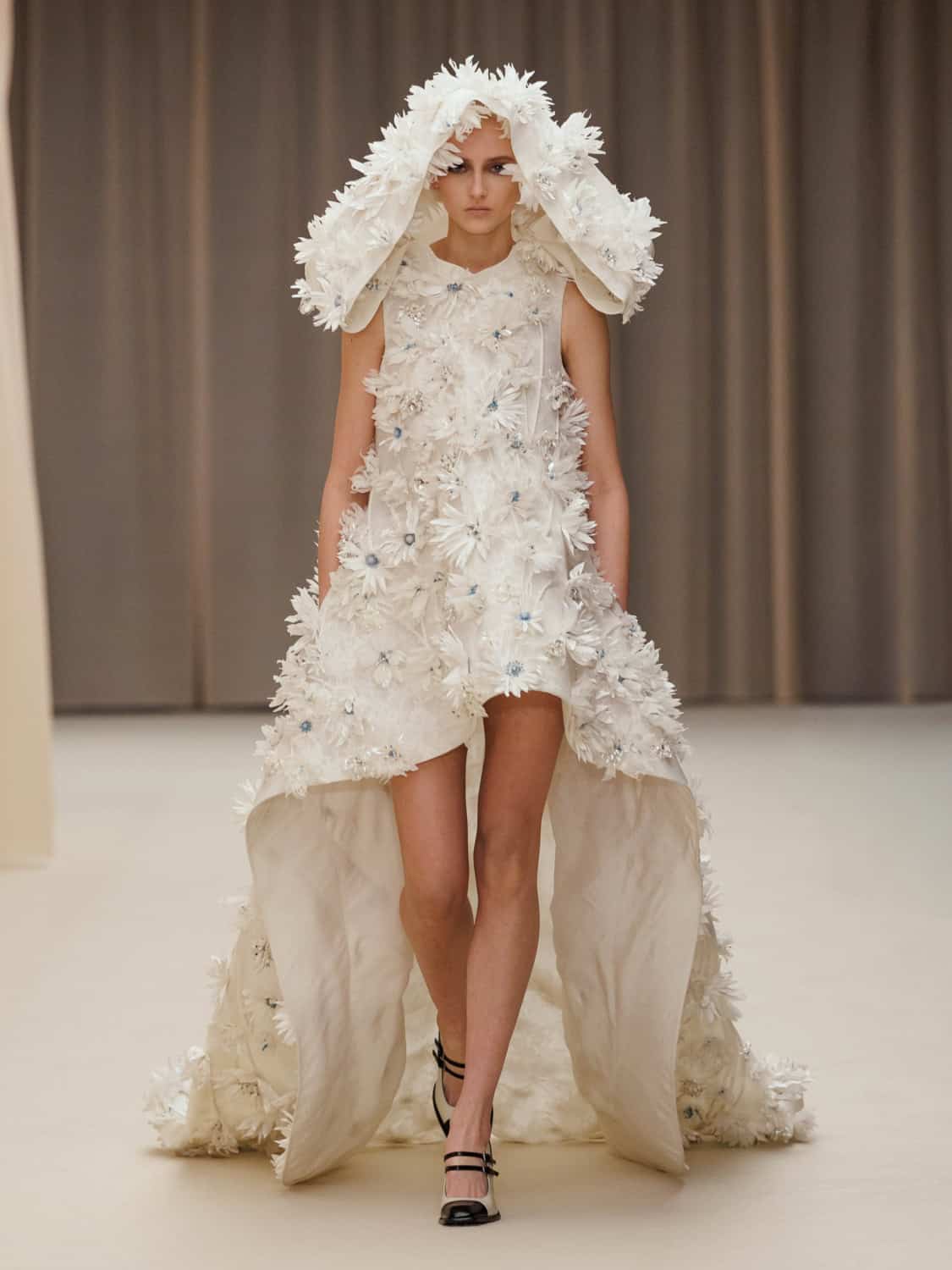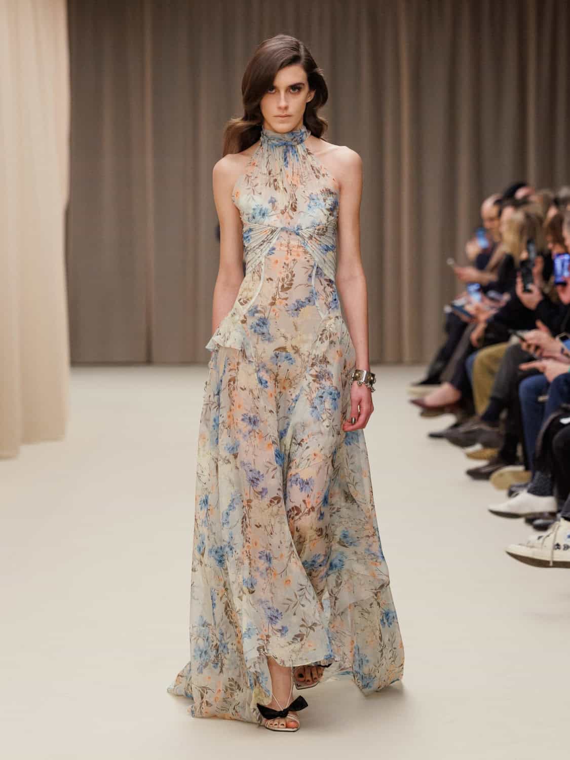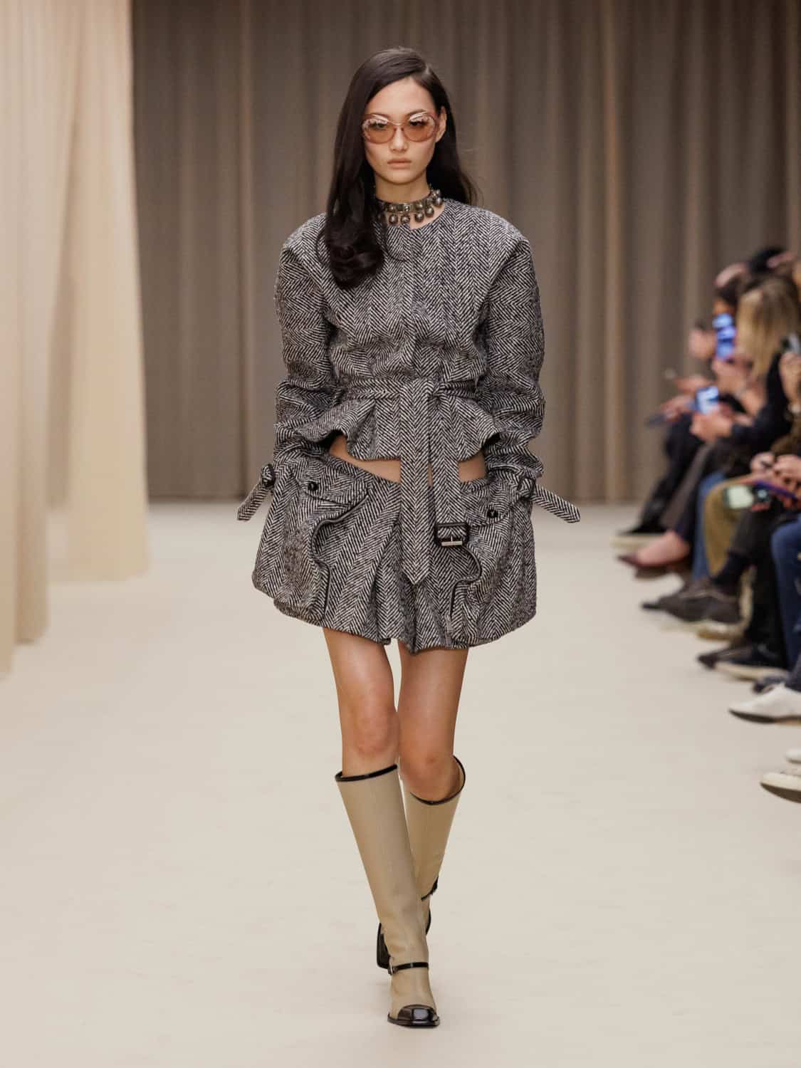 Seán McGirr at Alexander McQueen offered a new take on glamour. The designer leaned in to a softer, prettier side of the brand. The first look out set the tone: a cute, flaring mini coat dress, worn with knee boots and Sharon Tate hair. The designer had looked to Mary Quant (the originator of the miniskirt) and ‘60s noir movies.