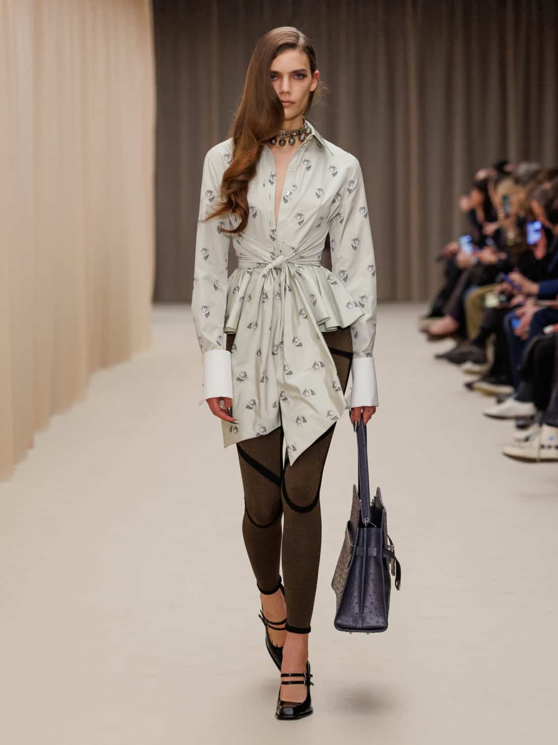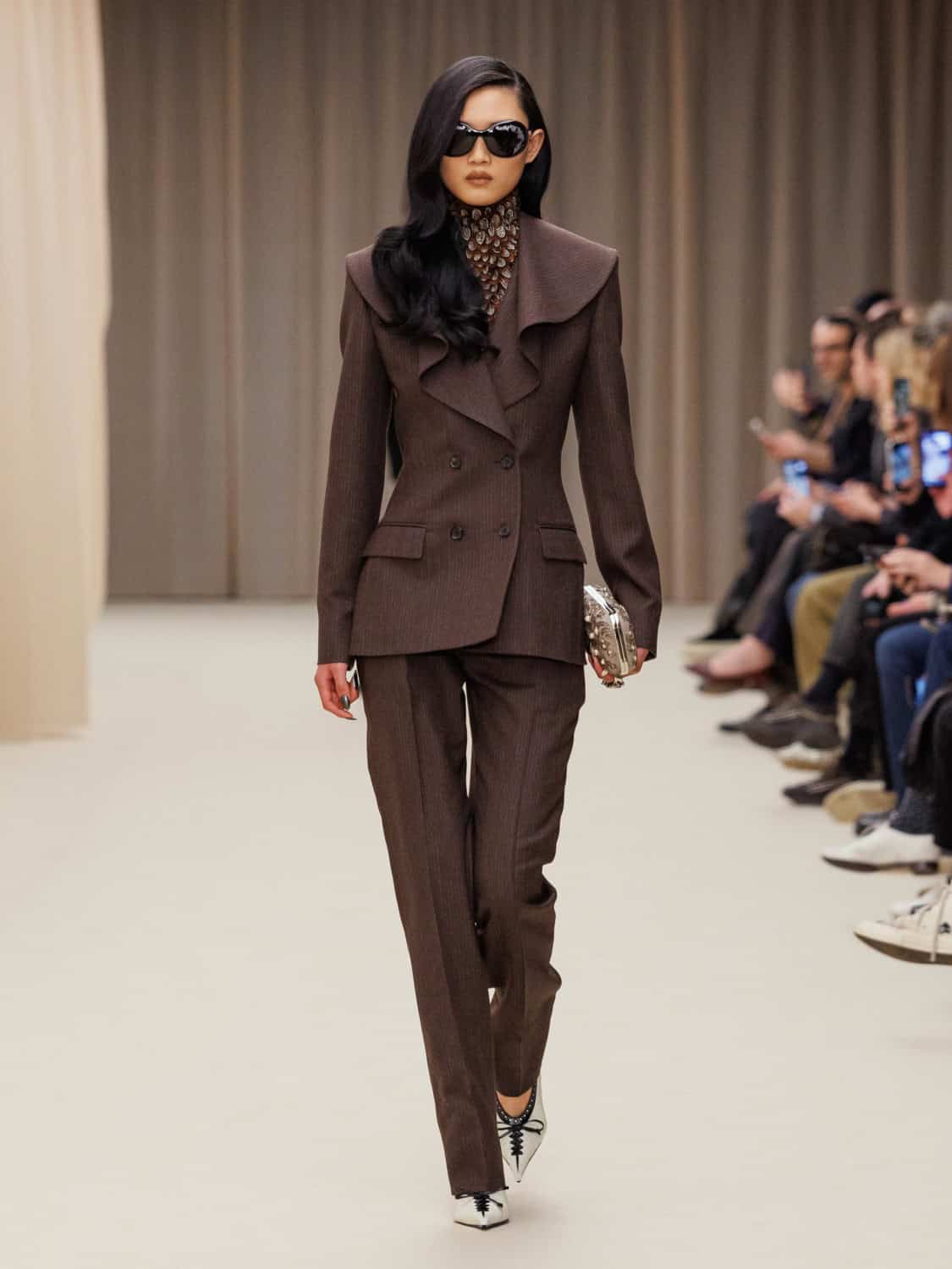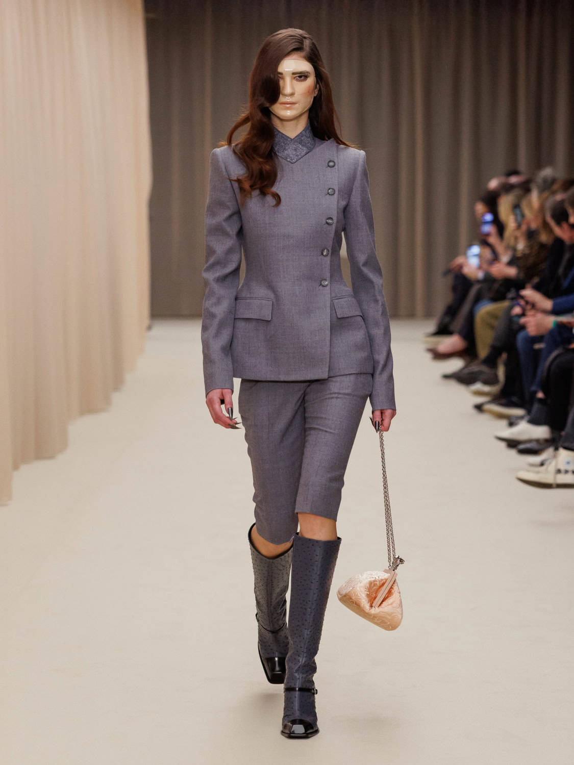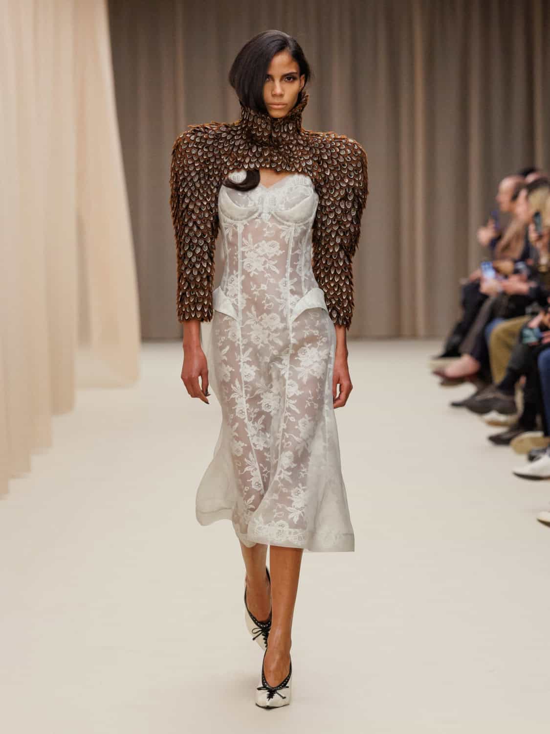 The McQueen iconography is ever present. McGirr brought back bumters last season, and they’re here to stay in leather trimmed wool, dipping in a dramatic heart shape at the back. Single-hook jackets were inspired by the archive. “I looked a lot at the SS97 La Poupée collection for the tailoring,” said the designer who also said he looked at the 2006 Widows of Culloden collection for the embroideries. The brand no longer uses real feathers so, the McQueen atelier hand embroidered chiffon to look exactly like the archive piece. “It became more animated in a way,” noted the designer.