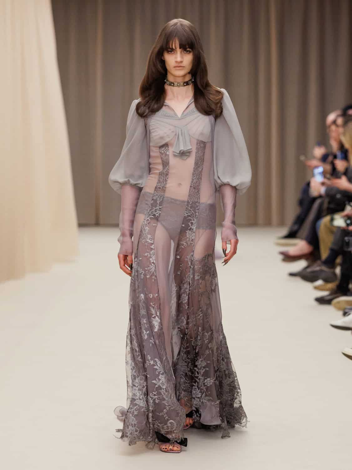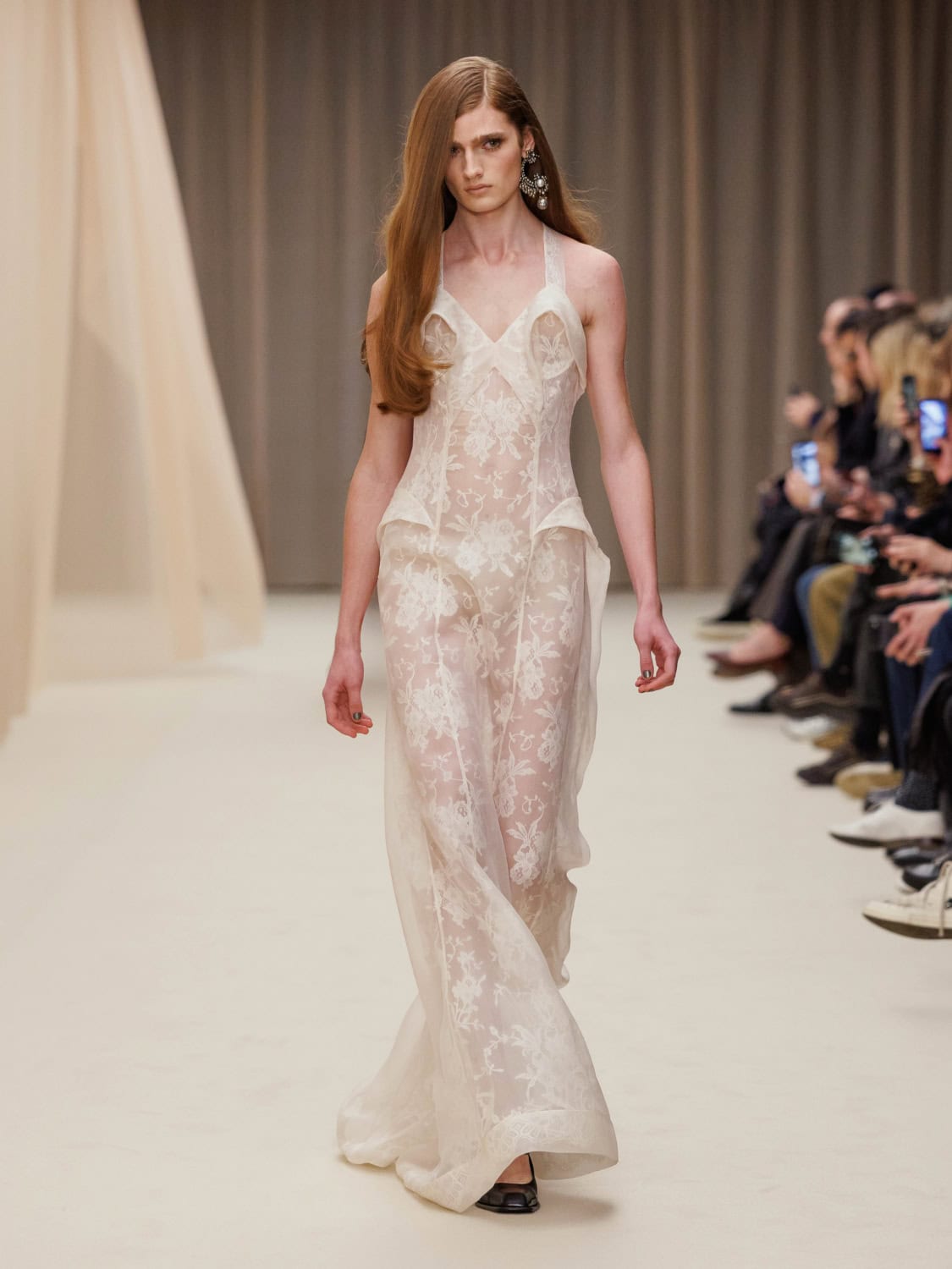 Tension is never far away at McQueen. McGirr mused on ideas of paranoia and perfectionism and how the pressure to conform creates a performative culture. He expressed it with fabric. “I like this idea of lace trapped between layers of organza so it not about lace as a surface decoration more about treating fabrics so they are claustrophobic,” he said of dresses made with sheer layers.