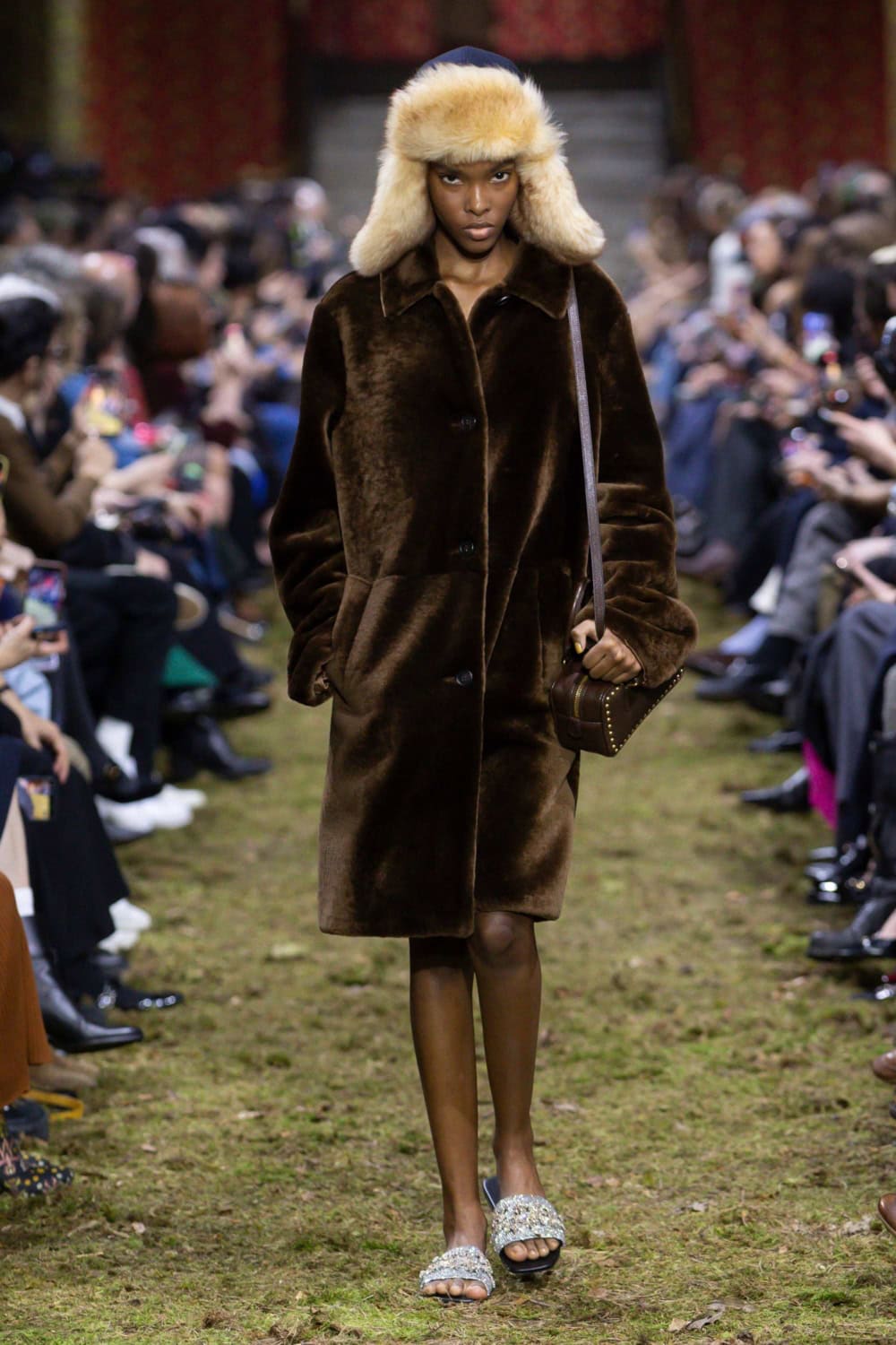 While the clothing spoke to simplicity and protection, the accessories told a different story. Embellished fur-lined trapper hats, crystal-studded belts, Y2K claw headbands, bedazzled footwear, and rhinestone-studded details injected some look-at-me energy.