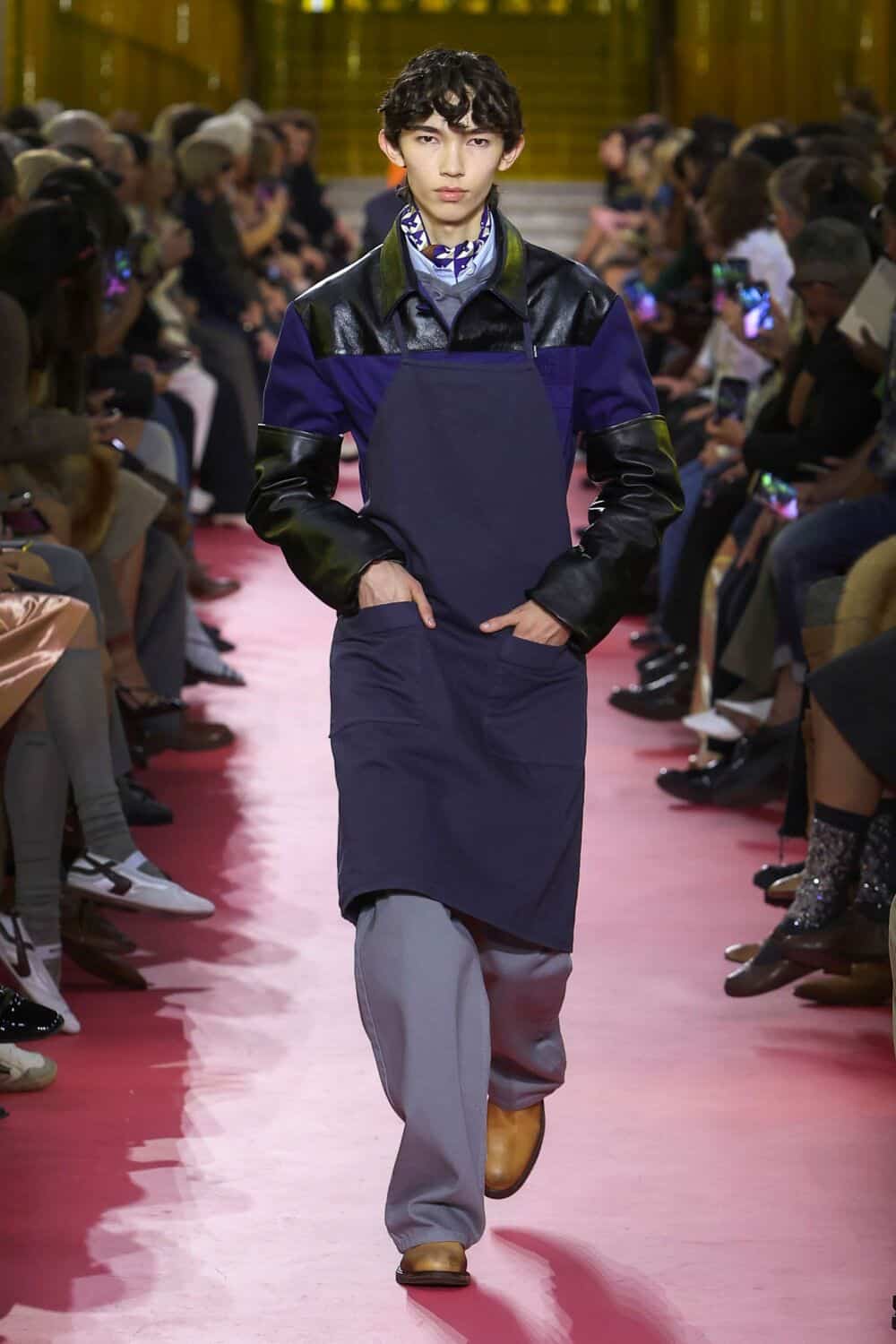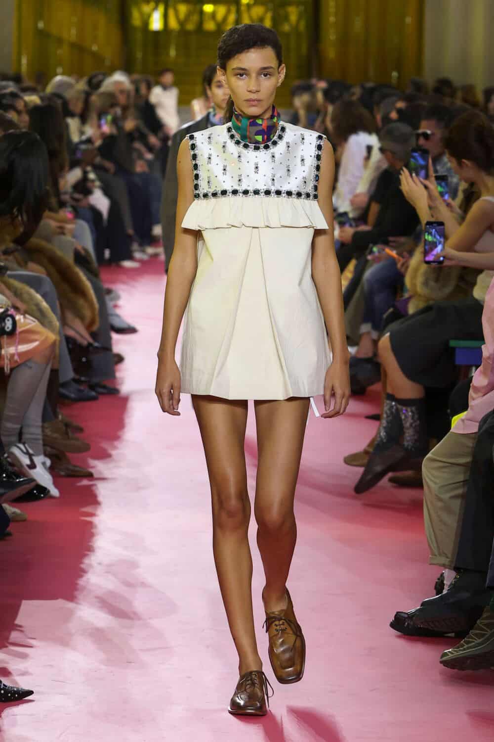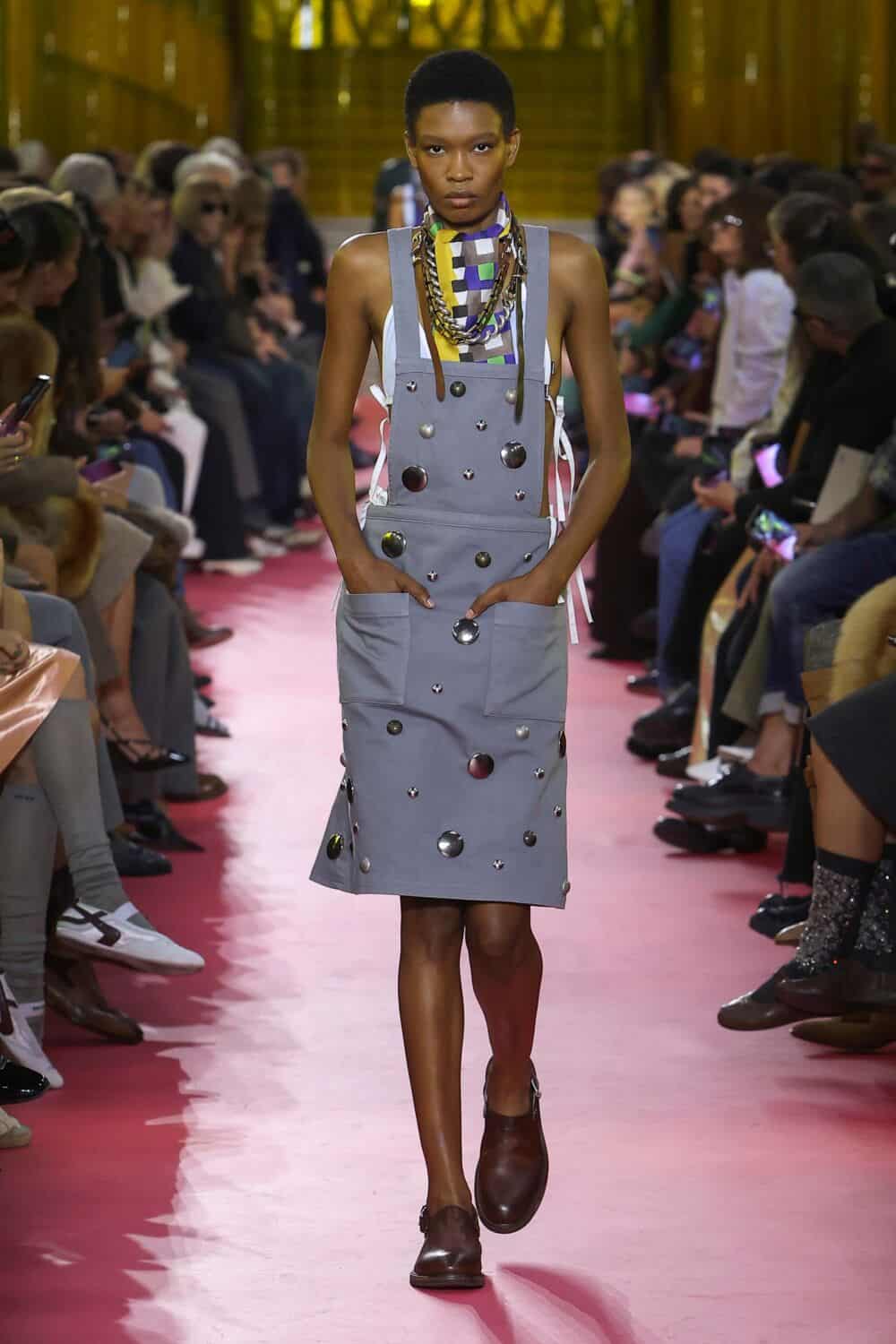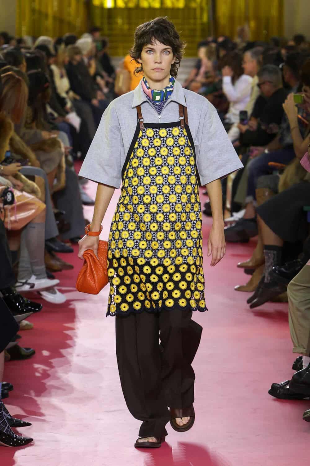 If anyone can make the humble apron a high-fashion must have it is Mrs Prada at Miu Miu. “The apron is my favorite piece of clothing in general,” said the designer backstage, but there’s a serious reason why. “In fashion, we always talk about glamour and rich people, but we have to recognise also that life is very different,” she said. “For me, the apron [symbolises] the real, difficult life of women in history, from factories to home.”