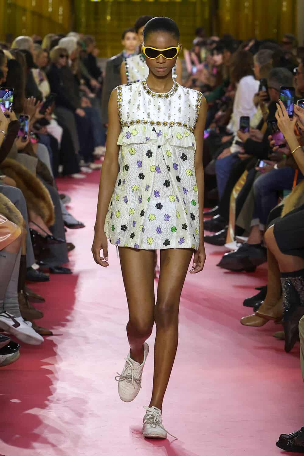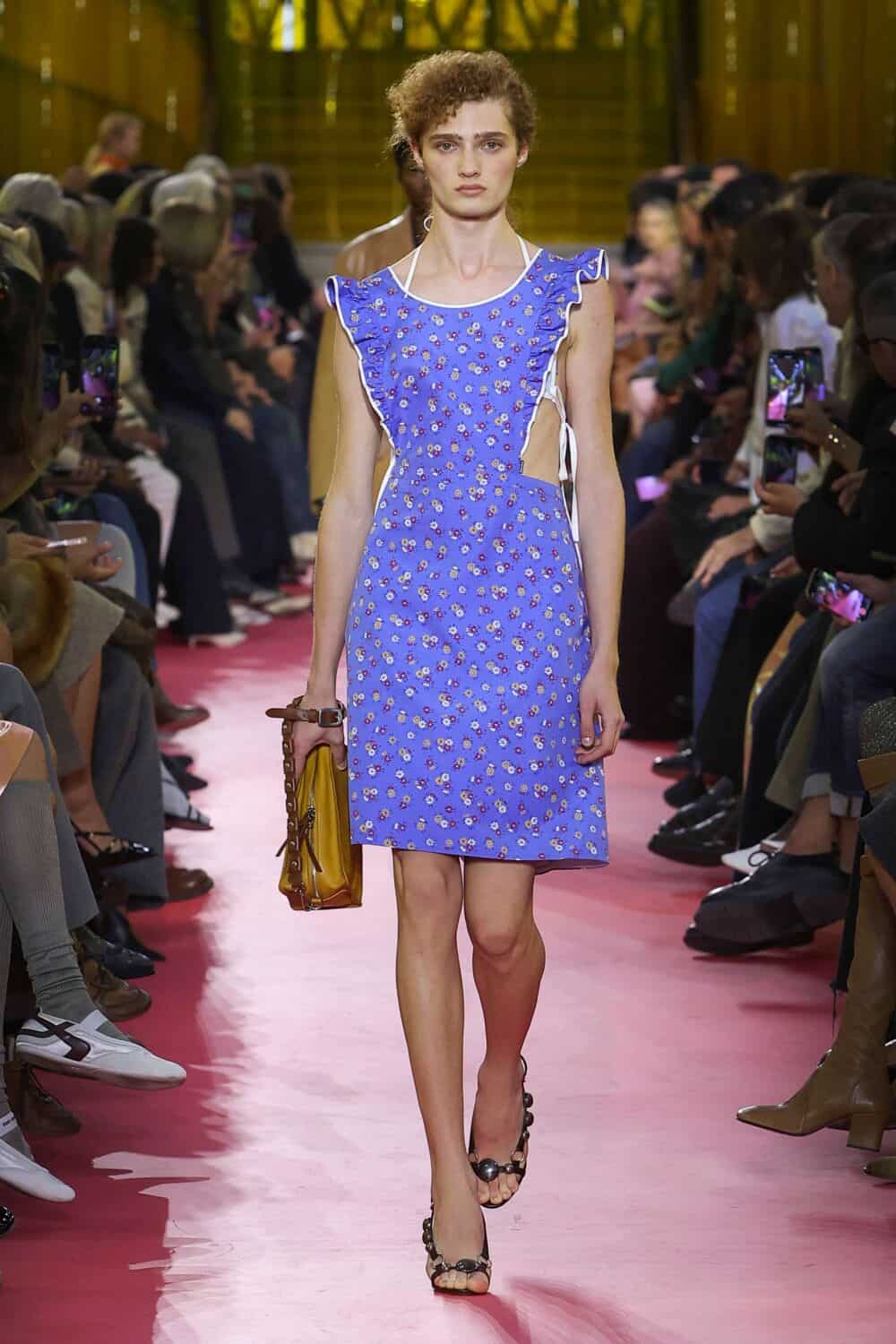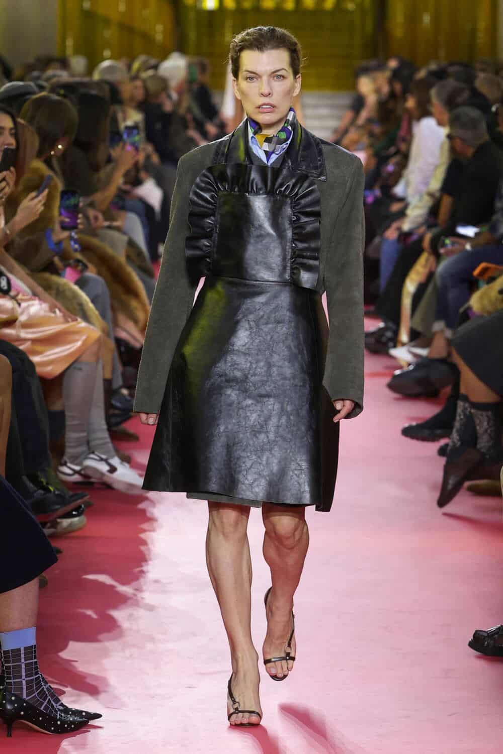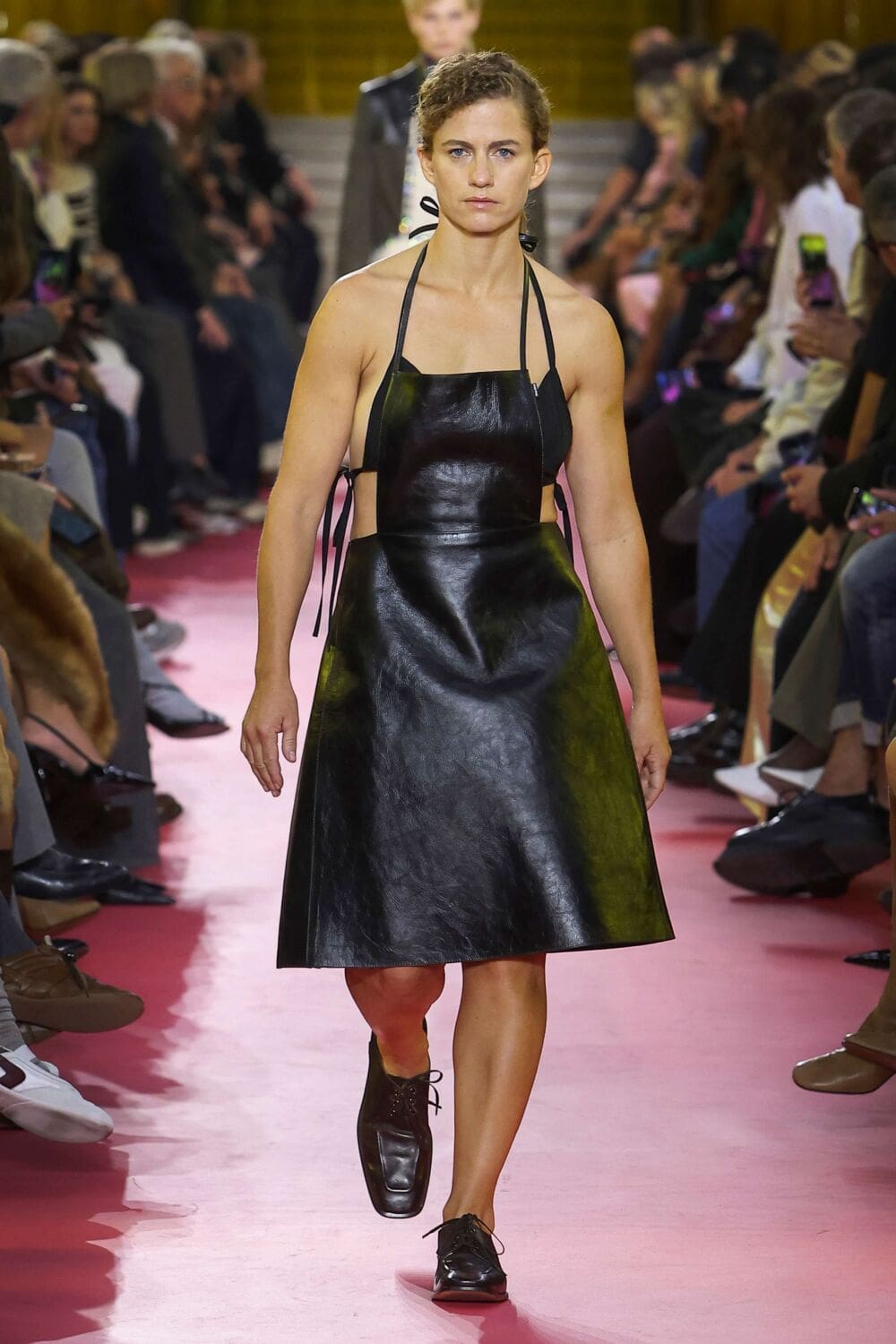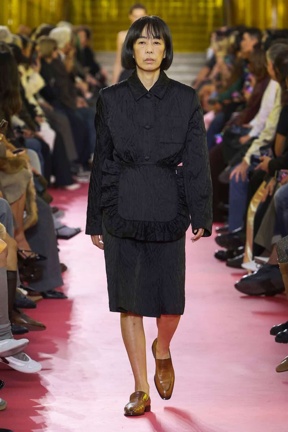 If anyone can make the humble apron a high-fashion must have it is Mrs Prada at Miu Miu. “The apron is my favorite piece of clothing in general,” said the designer backstage, but there’s a serious reason why. “In fashion, we always talk about glamour and rich people, but we have to recognise also that life is very different,” she said. “For me, the apron [symbolises] the real, difficult life of women in history, from factories to home.”