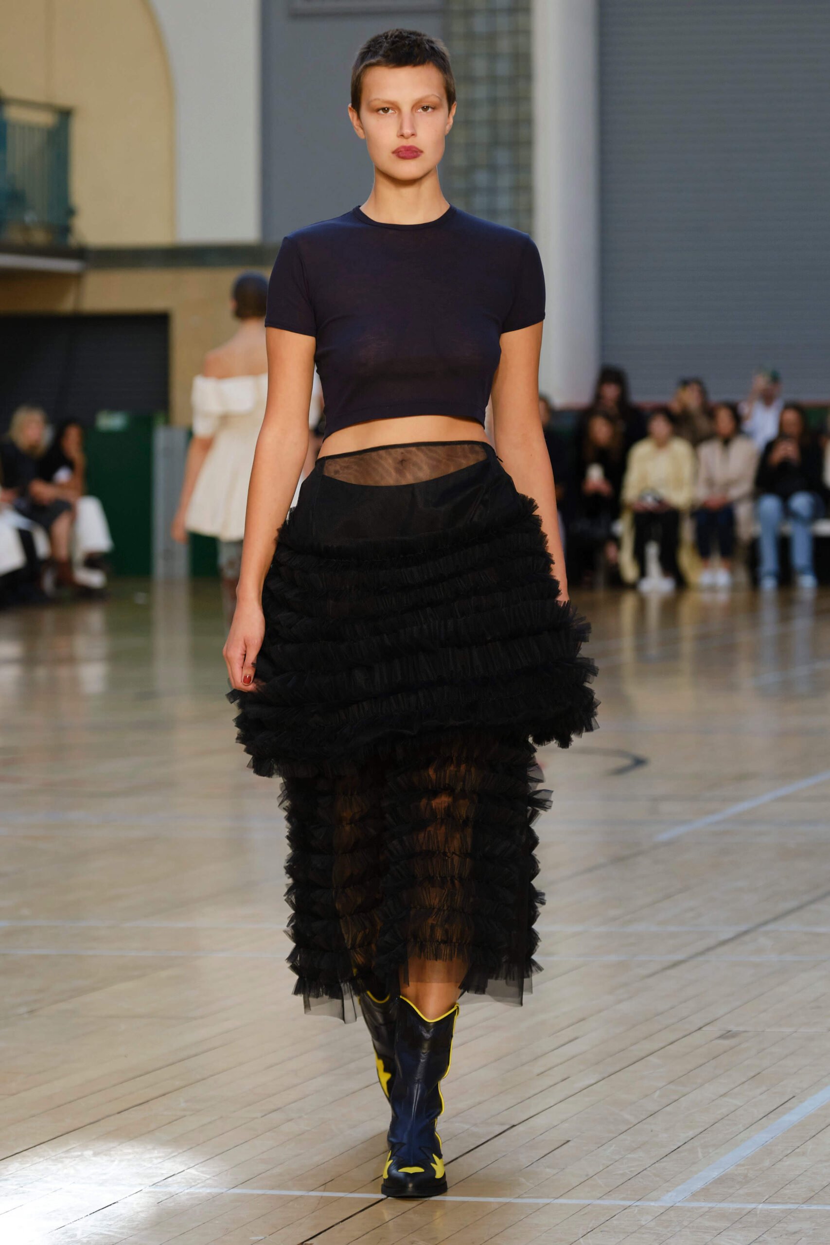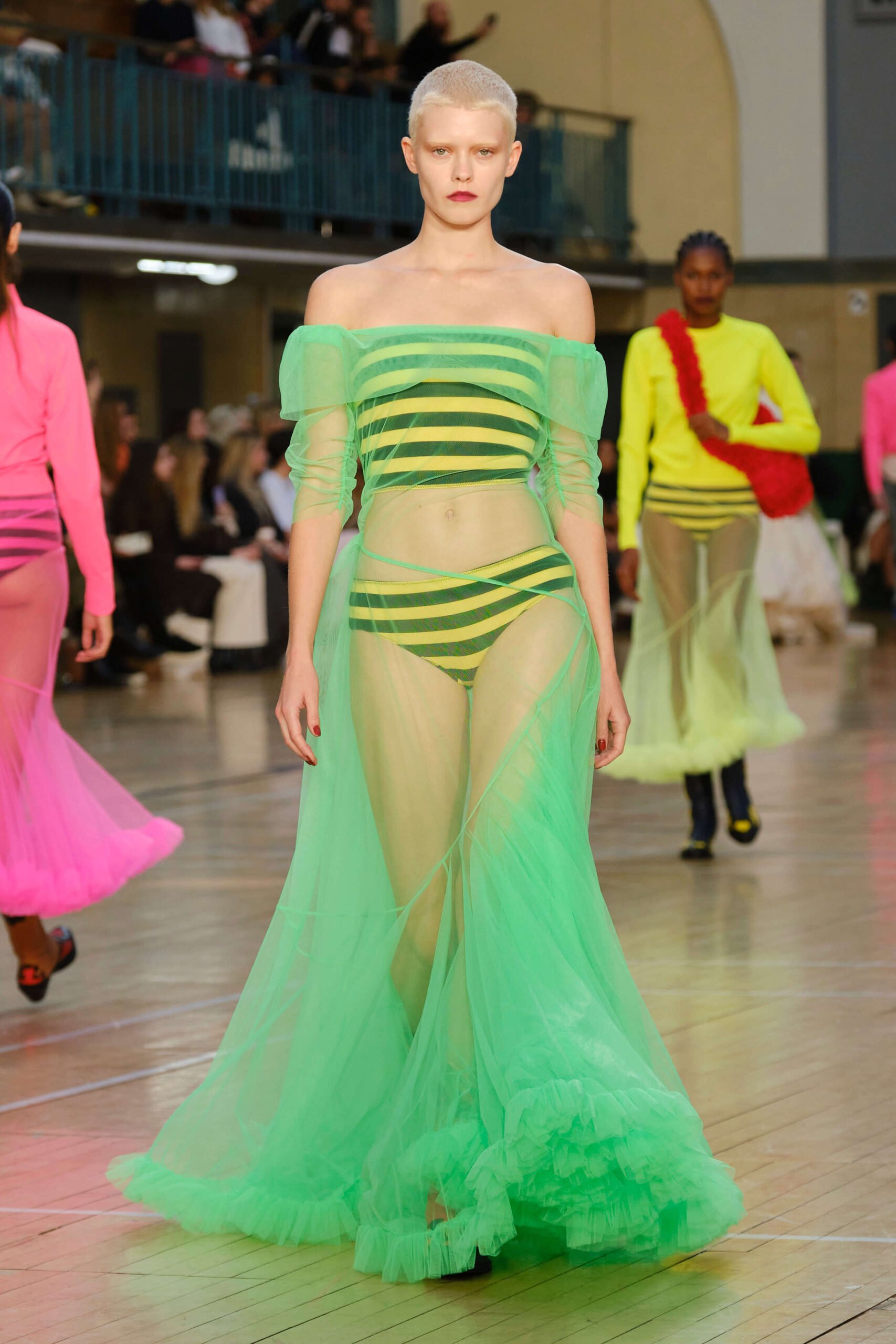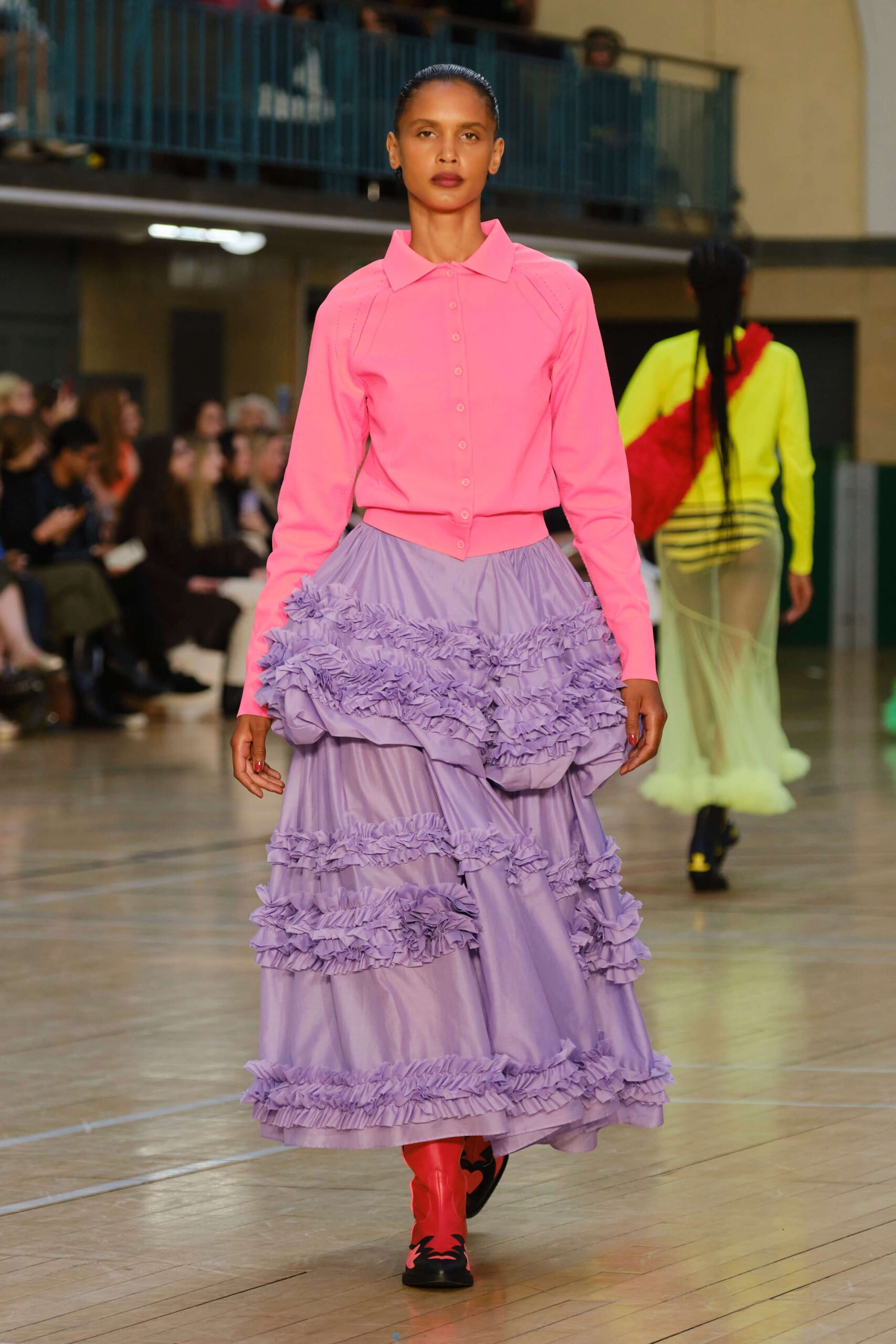 There are few joys in fashion which match the final procession of a Molly Goddard show. Her signature frocks which froth with tulle and taffeta are like the sweetest confectionaries you’d find displayed in your favourite bakery. This season’s delightful shades of raspberry, sorbet yellow, neon green and icing white only added to their desirability.