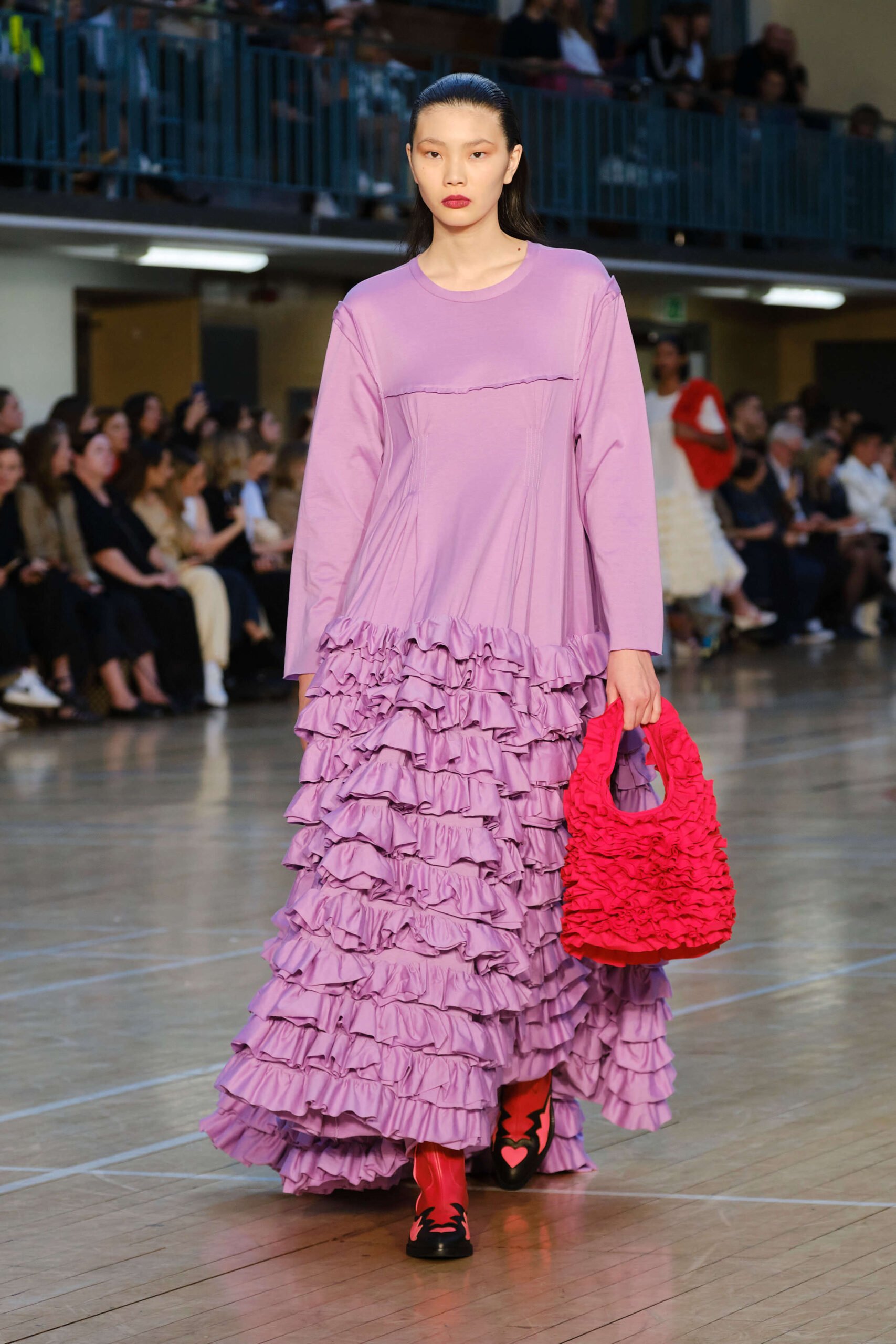 In her show notes, Goddard explained she was inspired by the casualness of red carpets before the internet, where people “looked like they were out to have fun”. She consciously took a more laid back approach in concocting this season’s looks. Ruffled evening dresses were cut with the ease of a T-shirt and fashioned from cotton, paired with matching frilly bags and cowboy boots in a wide array of different hues.