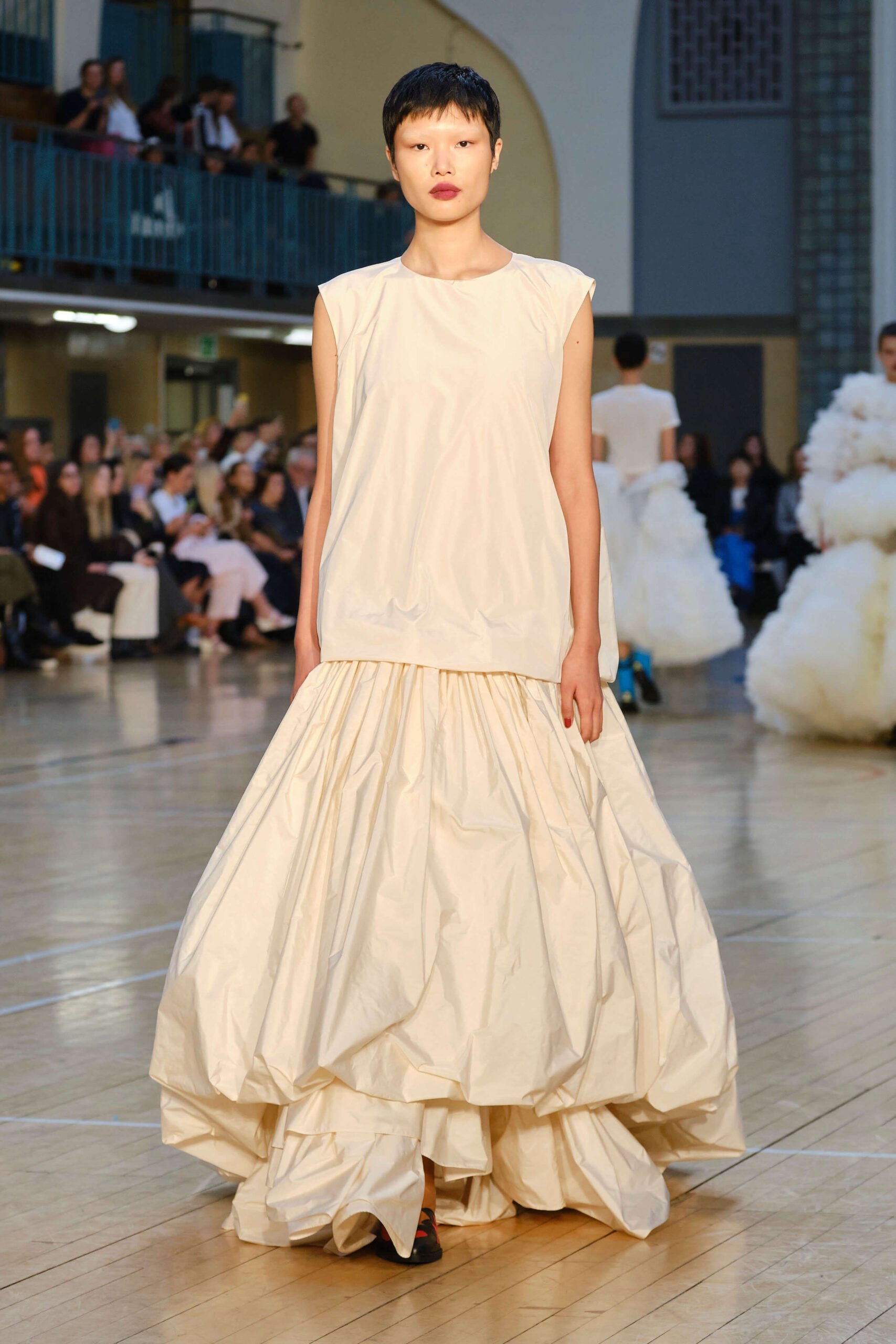 Goddard wanted the show to be “slower, messier, more spacious”, with models criss-crossing each other inside the Seymour Leisure Centre. They wore baggy jeans beneath their dresses and sheer skirts, while the brand’s quickly expanding menswear output featured shirred shirts and hooded cardies. Despite their prettiness, these clothes are for living in.