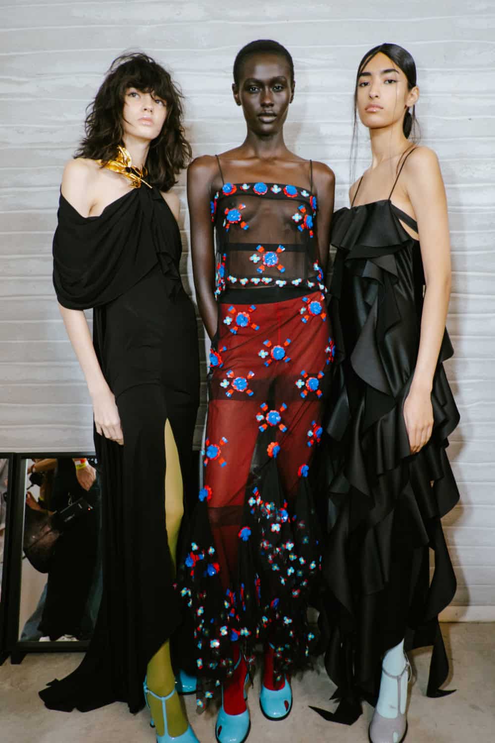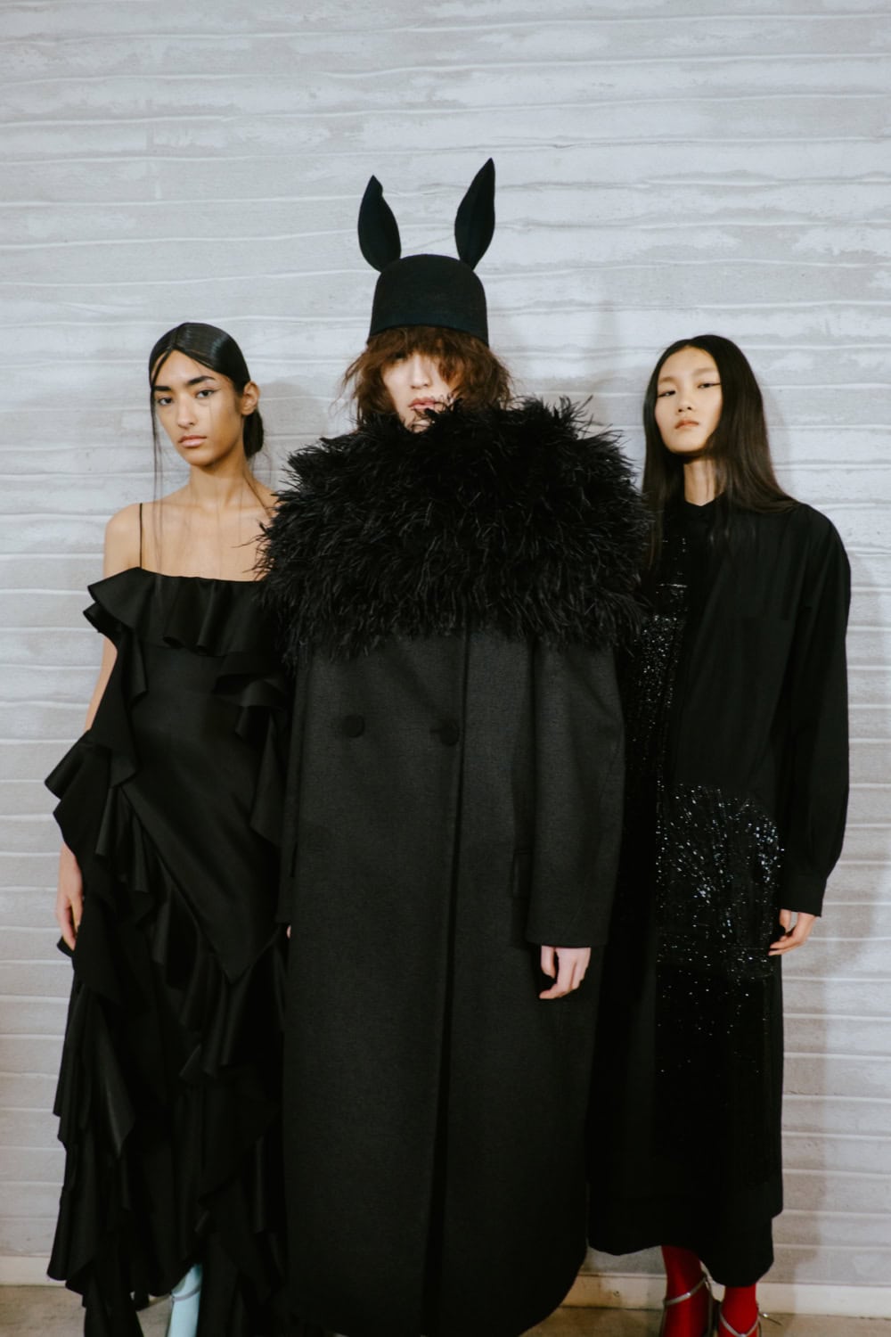 There was plenty of theatrics from bunny eared-hats to and neon bright ponchos and latex frilled skirts. But as always with Appiolaza, alongside the drama there was plenty of covetable clothes, from an elegant double-breasted tulip shaped coat to ballooning harem pants and pony print silk dresses – a tribute to the bourgeois ladies of the Argentine capital. Home sweet home.
