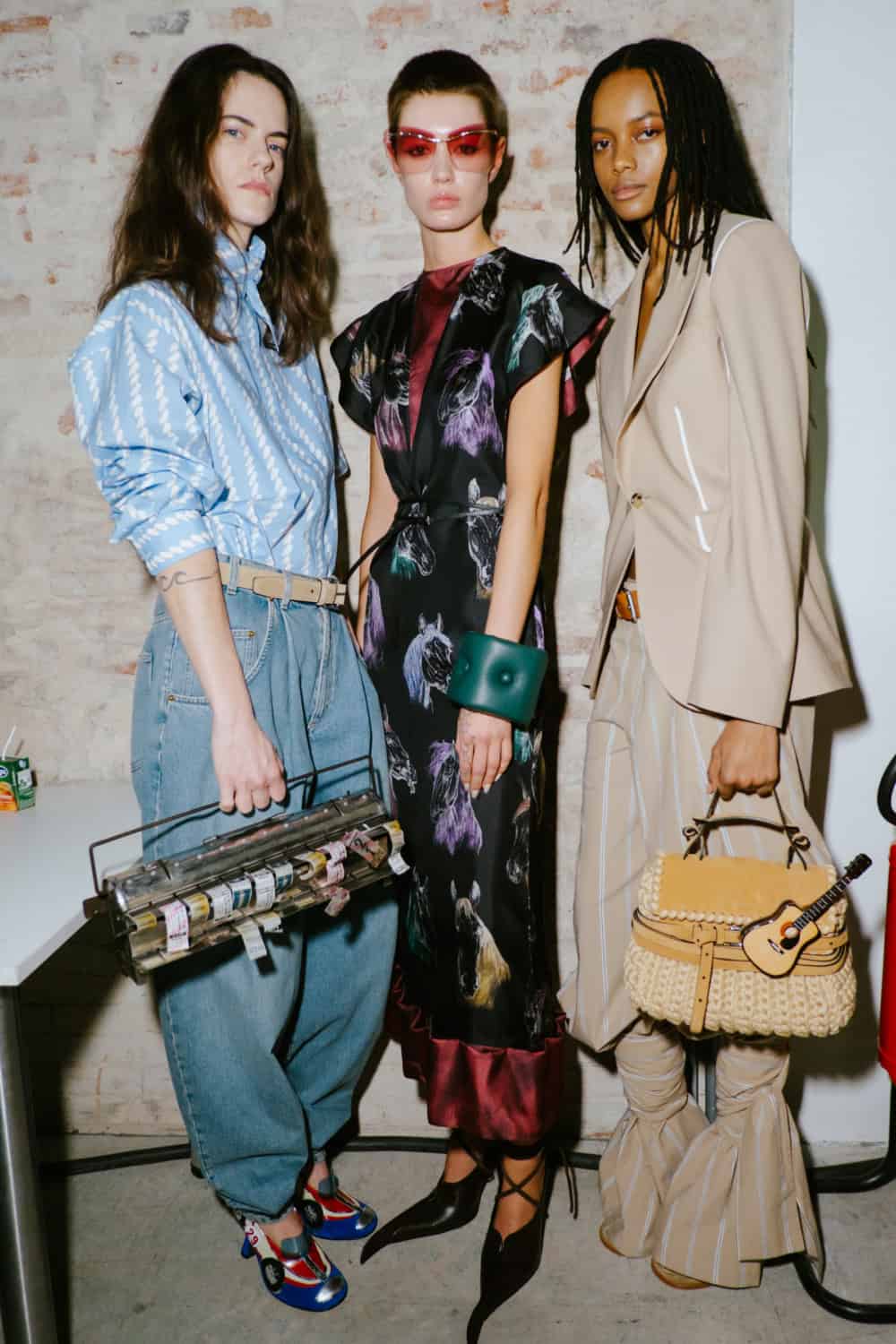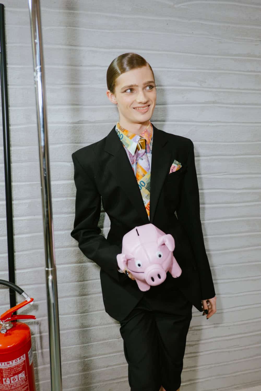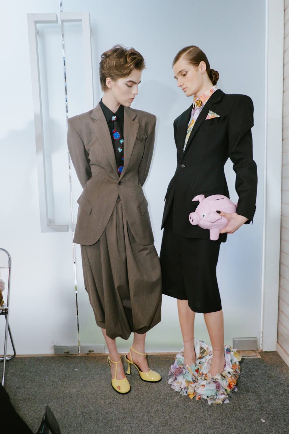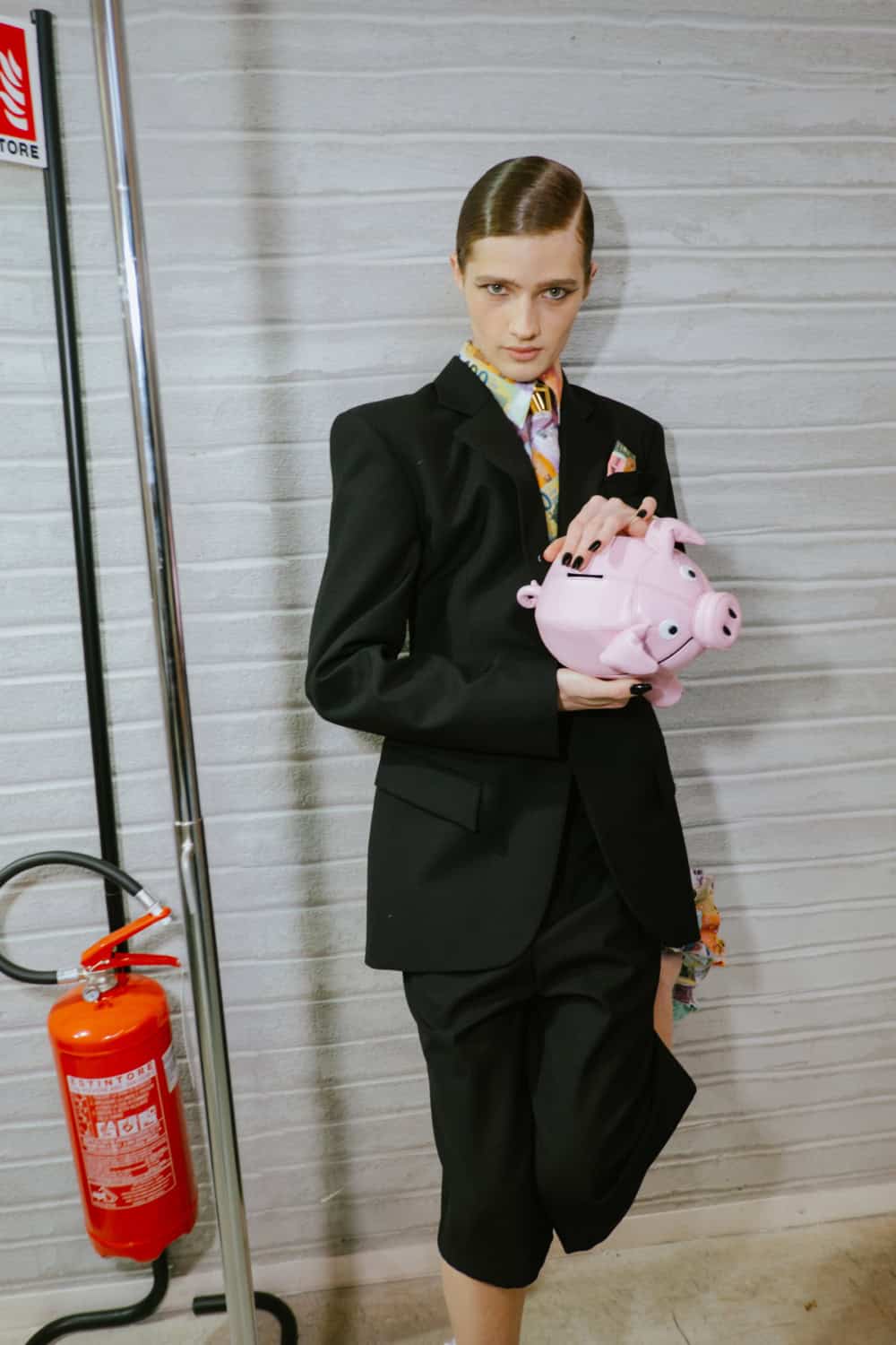 The highly personal theme was put through the Moschino filter and emerged with typically witty results. The designer touched on many aspect of his roots from gauchos and Eva Perón (her pixelated image appeared on an oversized tee) to tango dancers, a bus driver with a vintage ticket machine and llamas (why not, as knitted bag charms?). Famous Argentine landmarks were pixelated in oversized square sequins on a column dress, a leather bag came in the shape of a bag of chocolate dipped churros, even rampant inflation got a look in with bank notes clustered on shoes and prints on shirts. Actually the designer said that piece, which closed the show, was a comment on how fashion is all about money. One T-shirt stated “The problem with closed minds is that they always have their mouths open”, a comment on the censoriousness of our times and the moral outrage it fuels. The designer didn’t confine his imagination to one silhouette or a uniform look. Instead every look had its character and story.