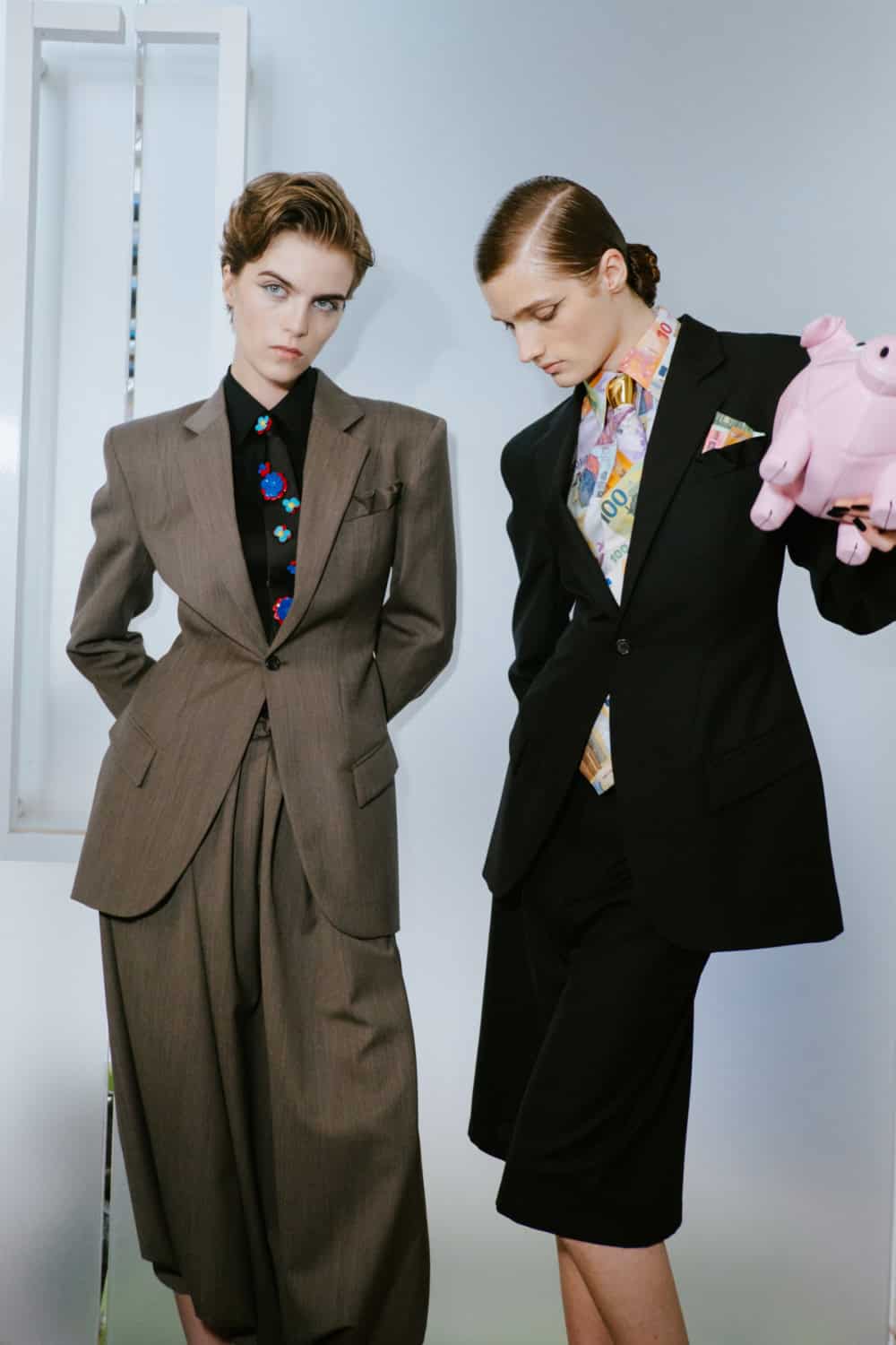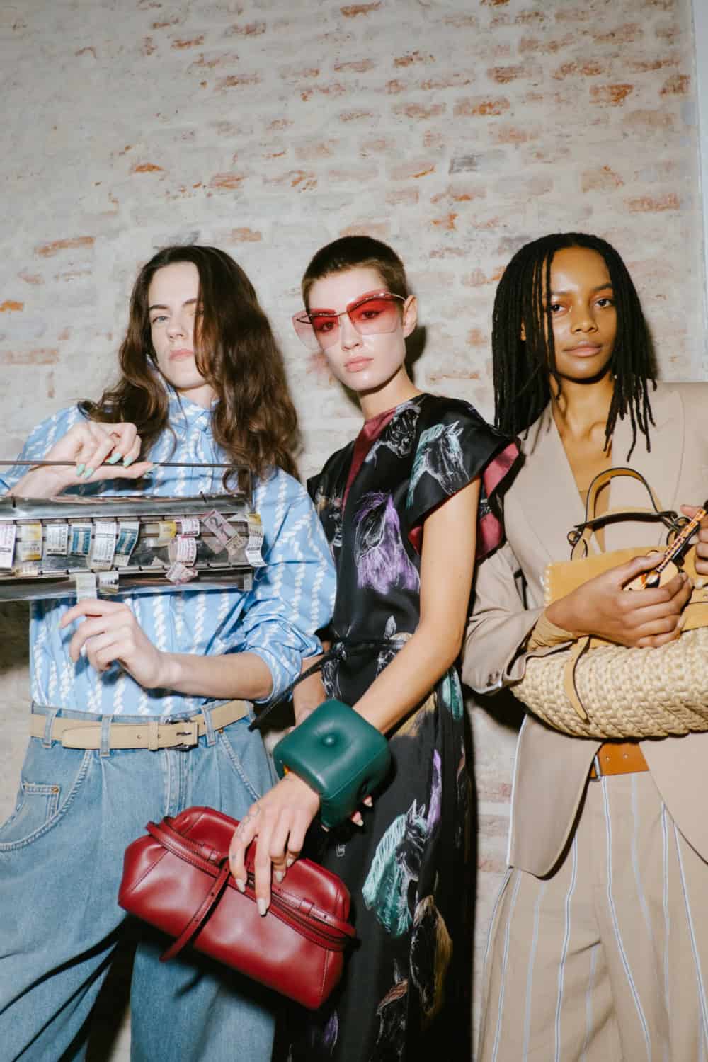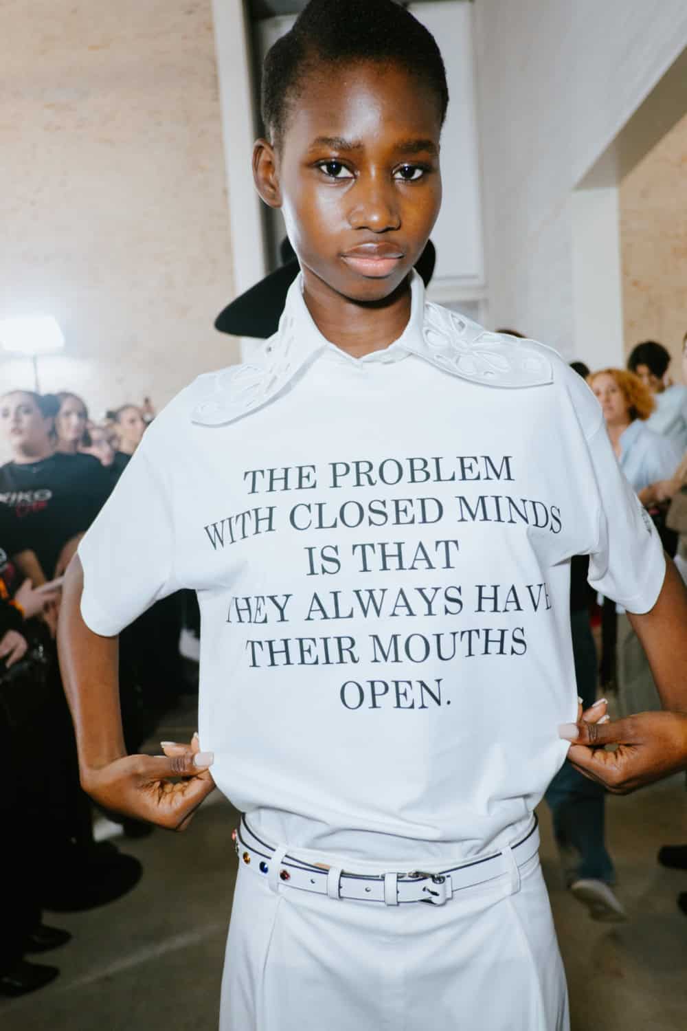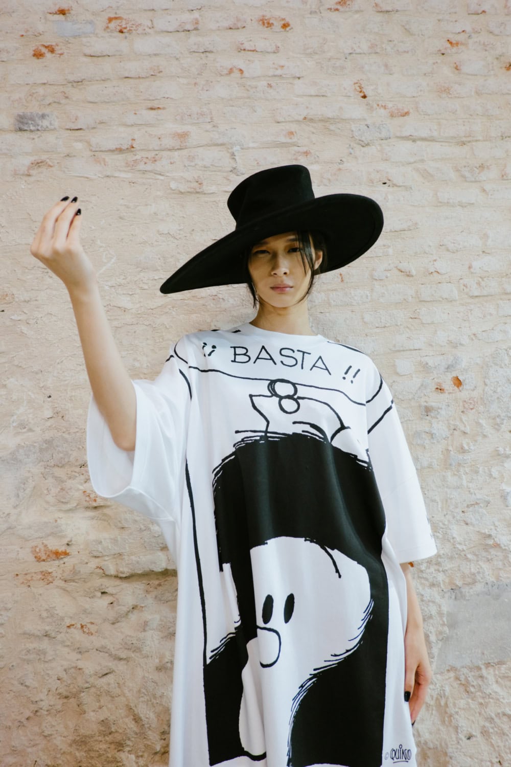 The highly personal theme was put through the Moschino filter and emerged with typically witty results. The designer touched on many aspect of his roots from gauchos and Eva Perón (her pixelated image appeared on an oversized tee) to tango dancers, a bus driver with a vintage ticket machine and llamas (why not, as knitted bag charms?). Famous Argentine landmarks were pixelated in oversized square sequins on a column dress, a leather bag came in the shape of a bag of chocolate dipped churros, even rampant inflation got a look in with bank notes clustered on shoes and prints on shirts. Actually the designer said that piece, which closed the show, was a comment on how fashion is all about money. One T-shirt stated “The problem with closed minds is that they always have their mouths open”, a comment on the censoriousness of our times and the moral outrage it fuels. The designer didn’t confine his imagination to one silhouette or a uniform look. Instead every look had its character and story.