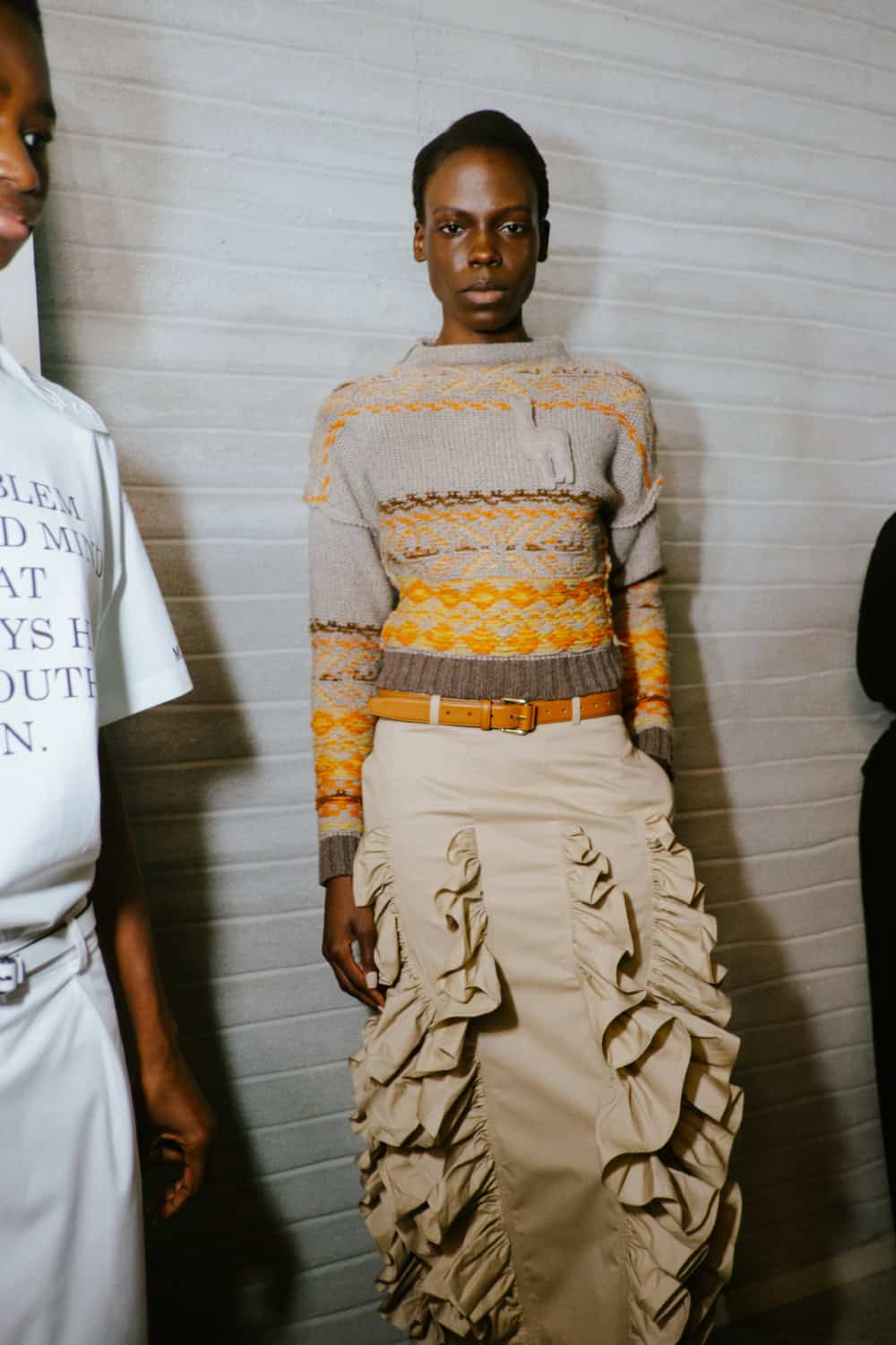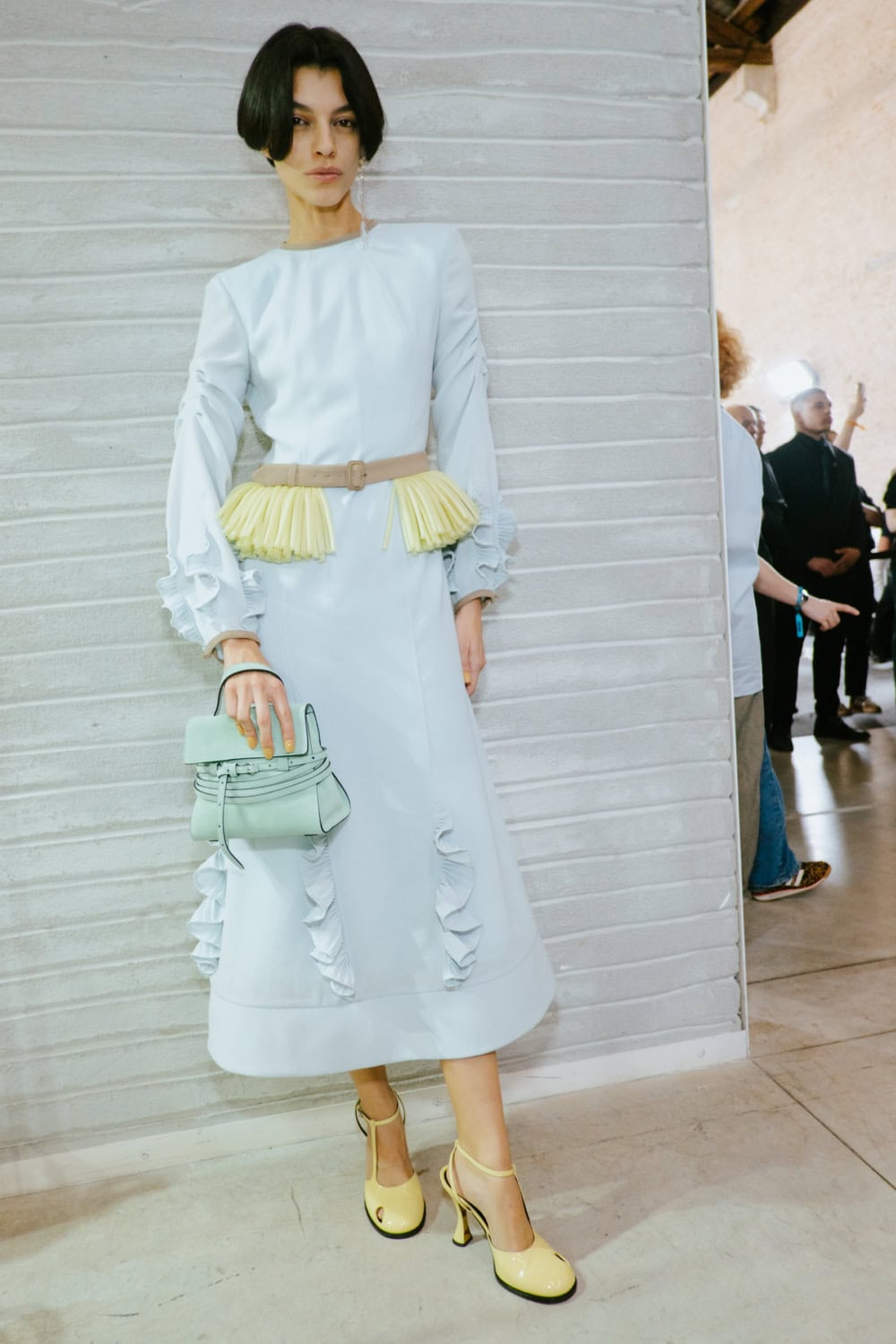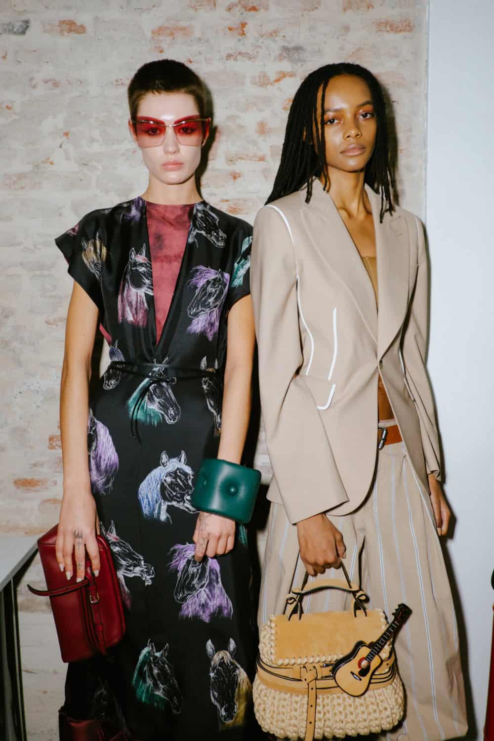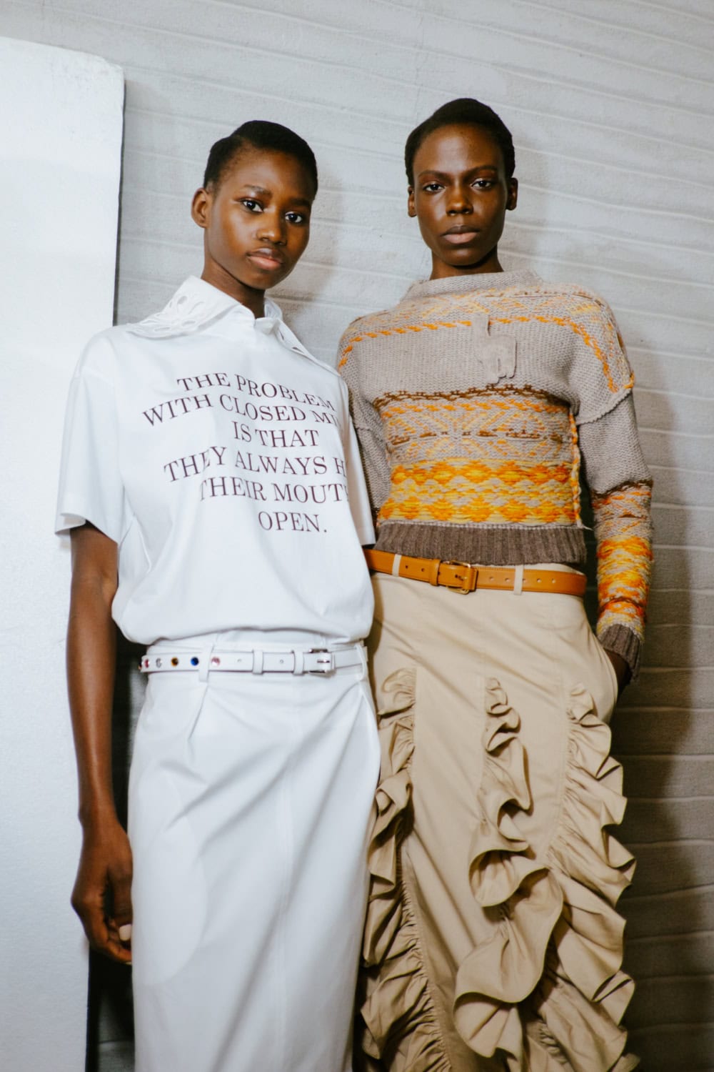 The highly personal theme was put through the Moschino filter and emerged with typically witty results. The designer touched on many aspect of his roots from gauchos and Eva Perón (her pixelated image appeared on an oversized tee) to tango dancers, a bus driver with a vintage ticket machine and llamas (why not, as knitted bag charms?). Famous Argentine landmarks were pixelated in oversized square sequins on a column dress, a leather bag came in the shape of a bag of chocolate dipped churros, even rampant inflation got a look in with bank notes clustered on shoes and prints on shirts. Actually the designer said that piece, which closed the show, was a comment on how fashion is all about money. One T-shirt stated “The problem with closed minds is that they always have their mouths open”, a comment on the censoriousness of our times and the moral outrage it fuels. The designer didn’t confine his imagination to one silhouette or a uniform look. Instead every look had its character and story.
