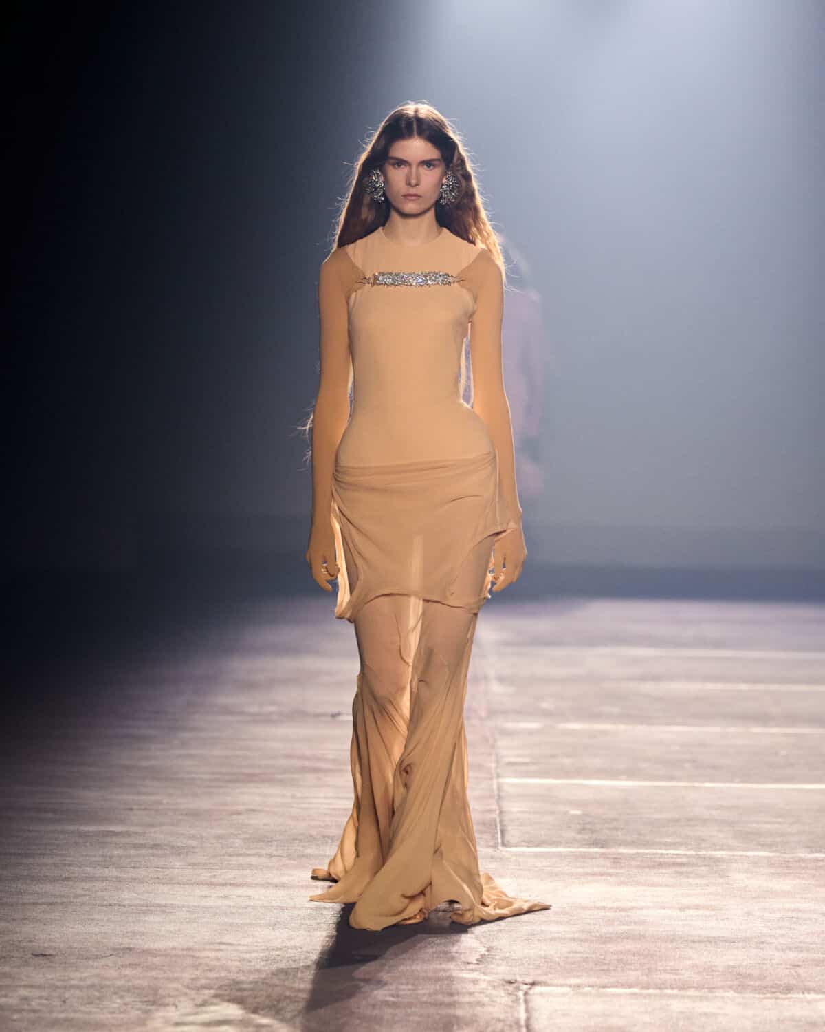 Castro Freitas cleverly skipped past the bionic women and instead let his design hand be guided by “the semiotics of sexual desire” threaded in the spirit of Mugler. He was thinking about nightcrawlers and glamazons who operate in the shadows. He set out to channel “the fetishised cliché of the showgirl”; clothes that reek of untouchable glamour. Highlights included second-skin latex skirt suits, floor-length glossy trench coats pulled close to the body and catsuits that dripped in nude-coloured gemstones. There were opulent feather headdresses, sculptural overcoats that migrated into a curtain of fringe at the hem and stars formed a silver-frosted gallery across draped dresses with square-shoulders.