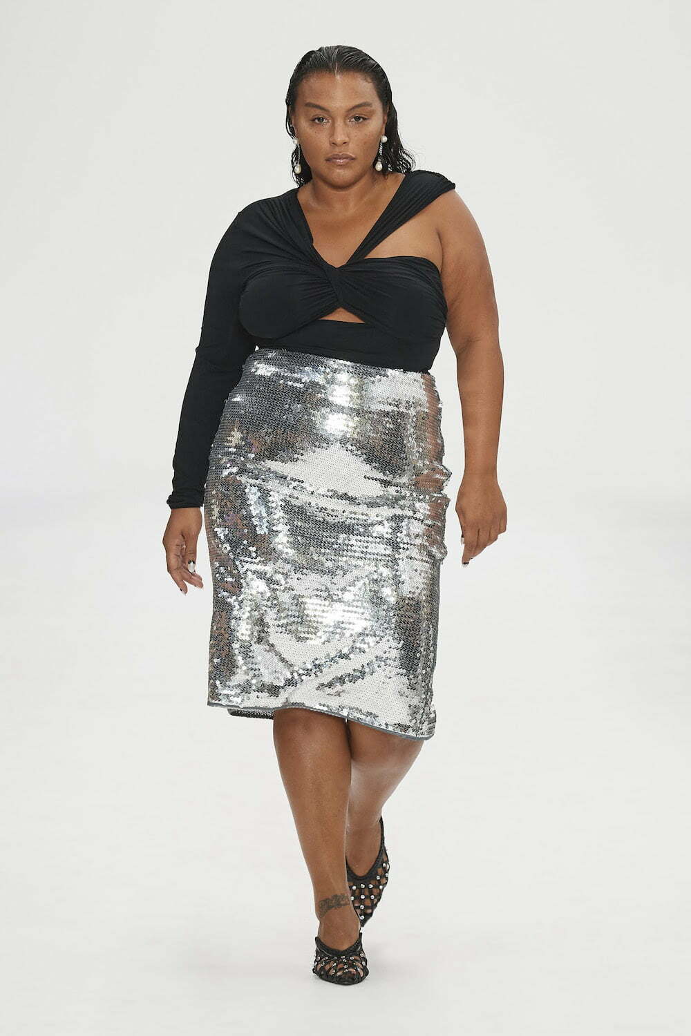 There’s an intimacy and intricacy to Nensi Dojaka’s work that makes her a real stand out on the London Fashion Week schedule. She found fame (and bagged the LVMH Prize) for her lingerie-infused LBD’s, but each season expands on her repertoire to dress her loyal clientele for all occasions. She’s already dipped her toe into swim, and inside a bright white box just off Caledonian Road this morning, she simultaneously tackled activewear and set her sights on dressing the darlings of Hollywood. Amongst her delicately constructed slip dresses and sophisticated sheer bodycon looks were cycling shorts with love heart cut outs and sporty boning which perforated going-out dresses. Speaking of hitting the town, Dojaka even offered her own take on jeans and a nice top with two-tone denim matched with a silver sequin tank top. Trip to Vodka Revs, anyone?